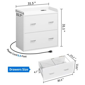 Dextrus Wood File Cabinet with Charging Station, Lateral Filing Cabinet Printer Stand Fits A4 Letter Legal Size Files, White