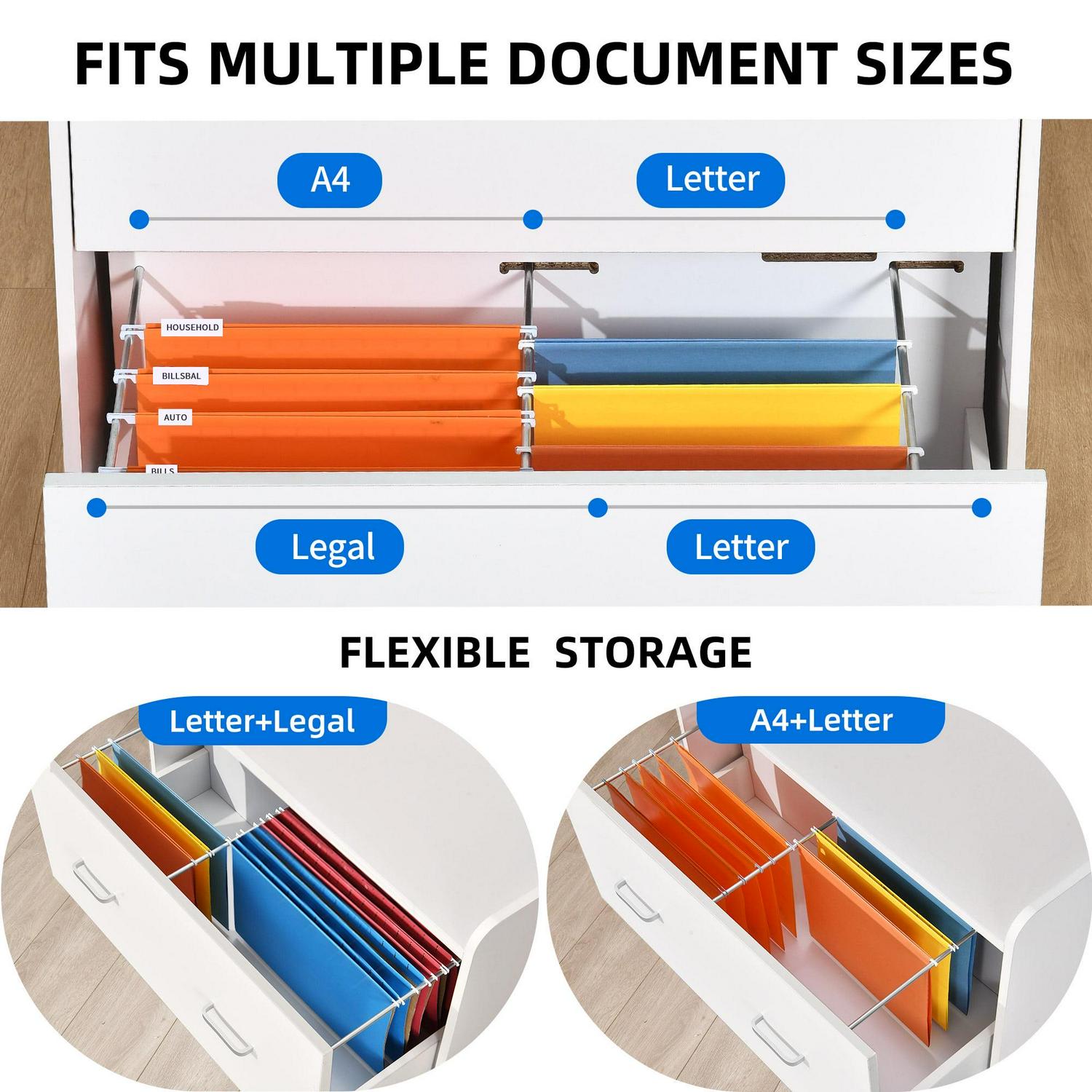 – Efficient File Organization: With two drawers and adjustable hanging bars, this lateral filing cabinet offers flexible storage for A4, letter, and legal files in various combinations (letter+legal, A4+letter). It helps keep your files tidy and easily accessible. The white minimalist design adds a touch of modern elegance to any room.