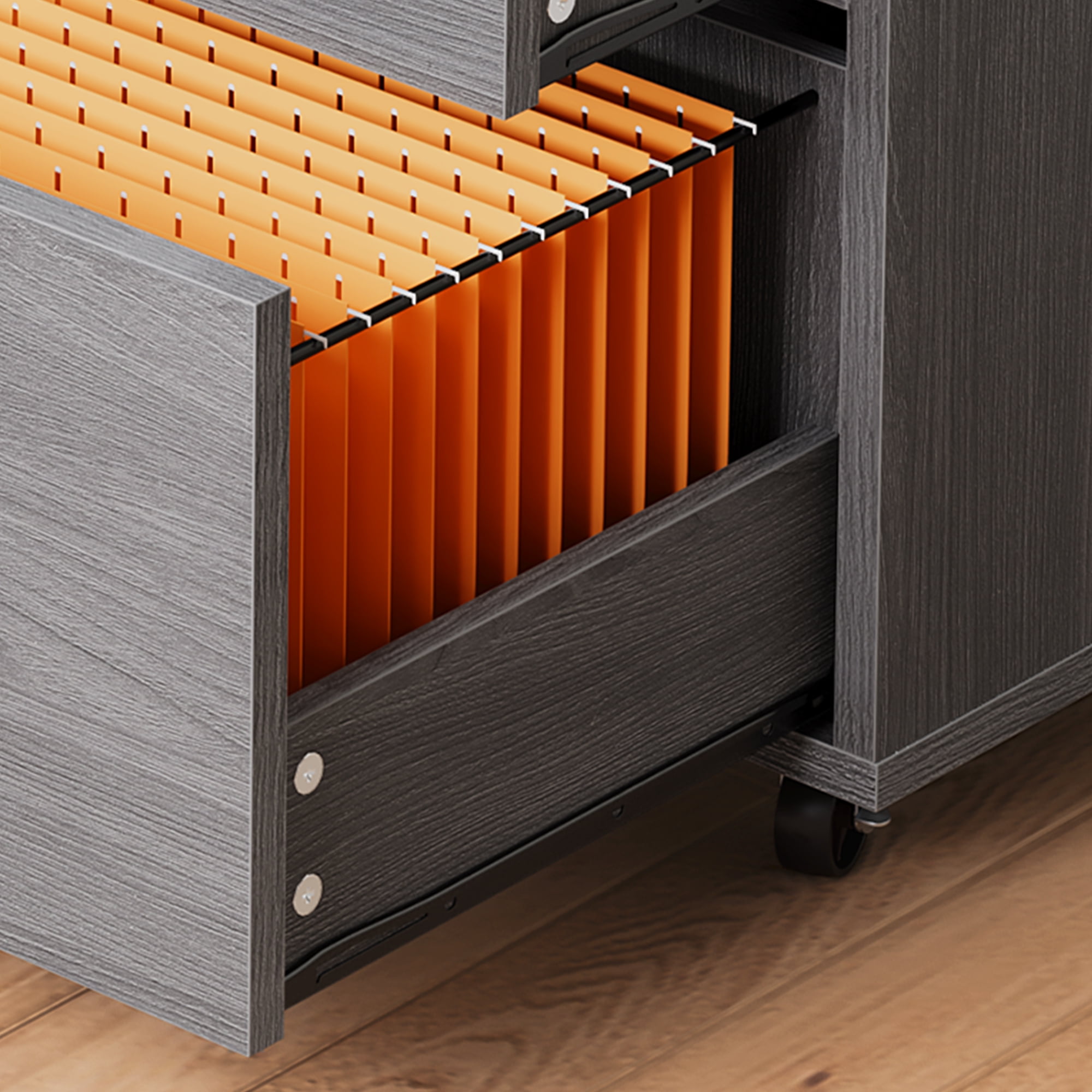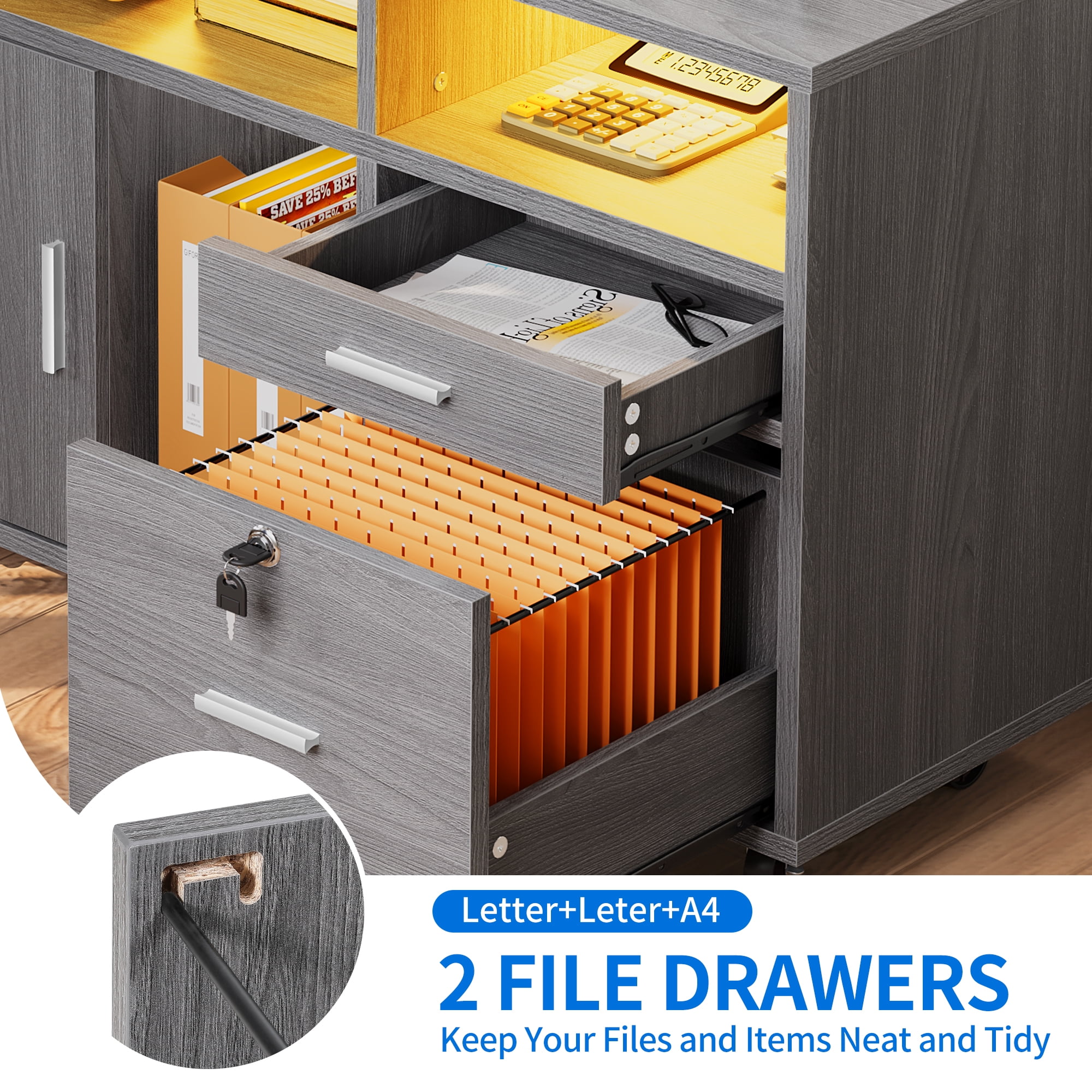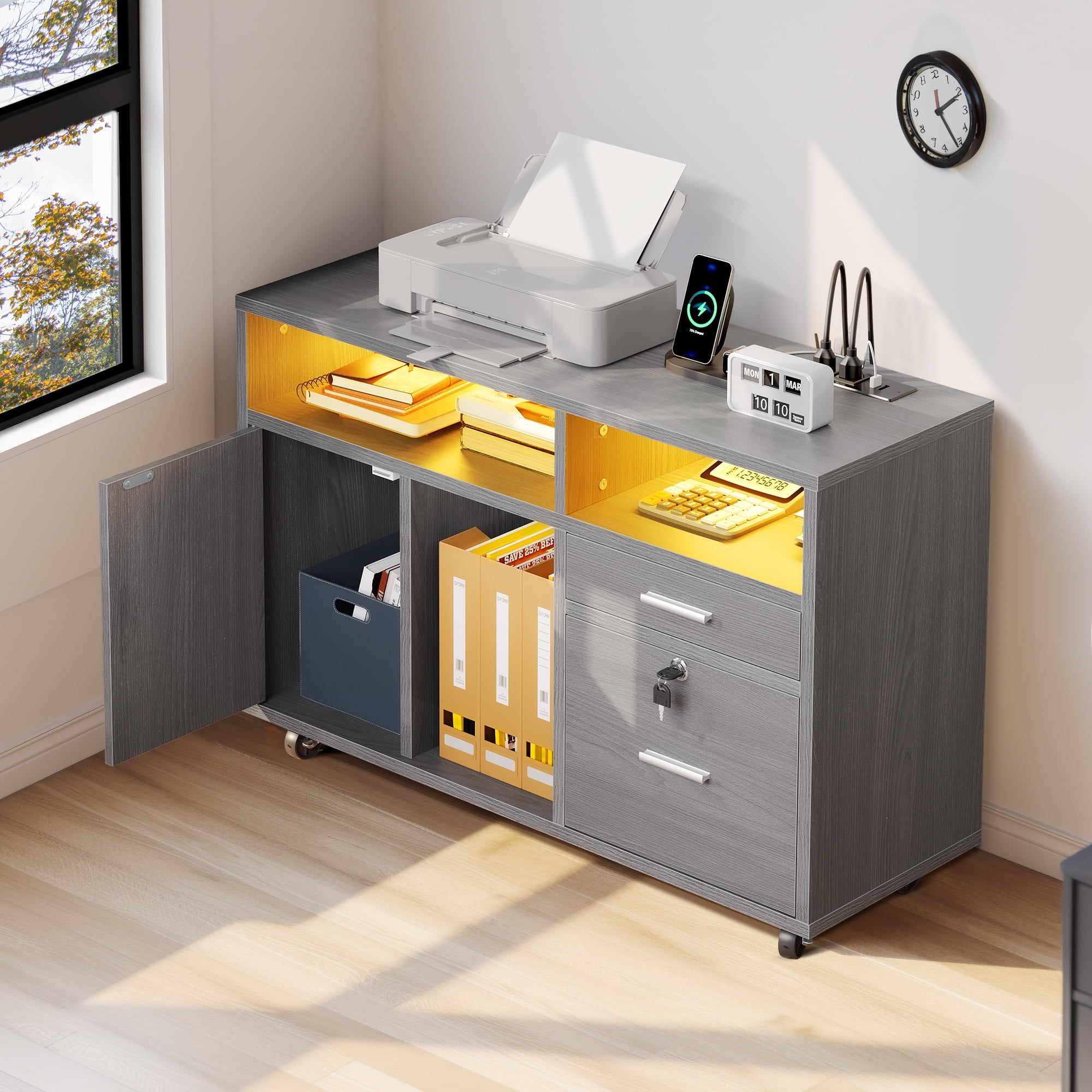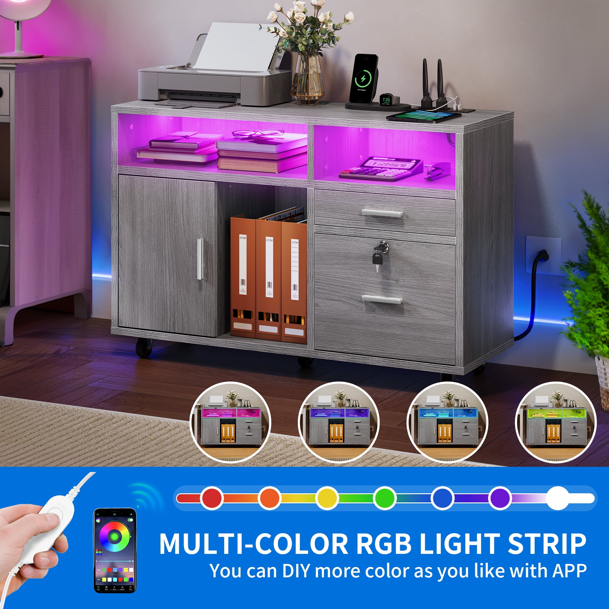 Secure Document Storage: The bottom drawer of this storage cabinet features removable hanging bars and can be locked, providing a secure storage solution for A4 letter and legal-sized documents. Versatile and Stylish: This storage cabinet is not only functional but also adds a touch of style to any office or home. Its modern design blends well with any decor, making it a versatile choice for organizing office machinery, files, and supplies. Ample Storage Space: With a wide desktop for a printer or plants, 3 open storage compartments for binders and baskets, and 2 drawers for files and other items, this cabinet provides ample storage space to keep your workspace organized and clutter-free. Sturdy and Easy to Move: Made with 0.63” thick boards and equipped with 5 sturdy industrial casters, this file cabinet is built to last. It can hold up to 100 lbs and is easy to move around, allowing you to rearrange your workspace as needed. Transform Your Space With Light: Elevate your room’s ambiance with a remote-operated LED strip. Take your pick from 7+ vibrant colors, tweak the brightness, and enjoy various lighting modes to set the matching mood and elevate your decorative displays. Durability and Stability: Crafted with thick P2 wooden board, this file cabinet is built to last and can support up to 110lbs. The addition of an anti-tip metal buckle ensures stability and allows you to secure the cabinet to the wall for extra peace of mind.