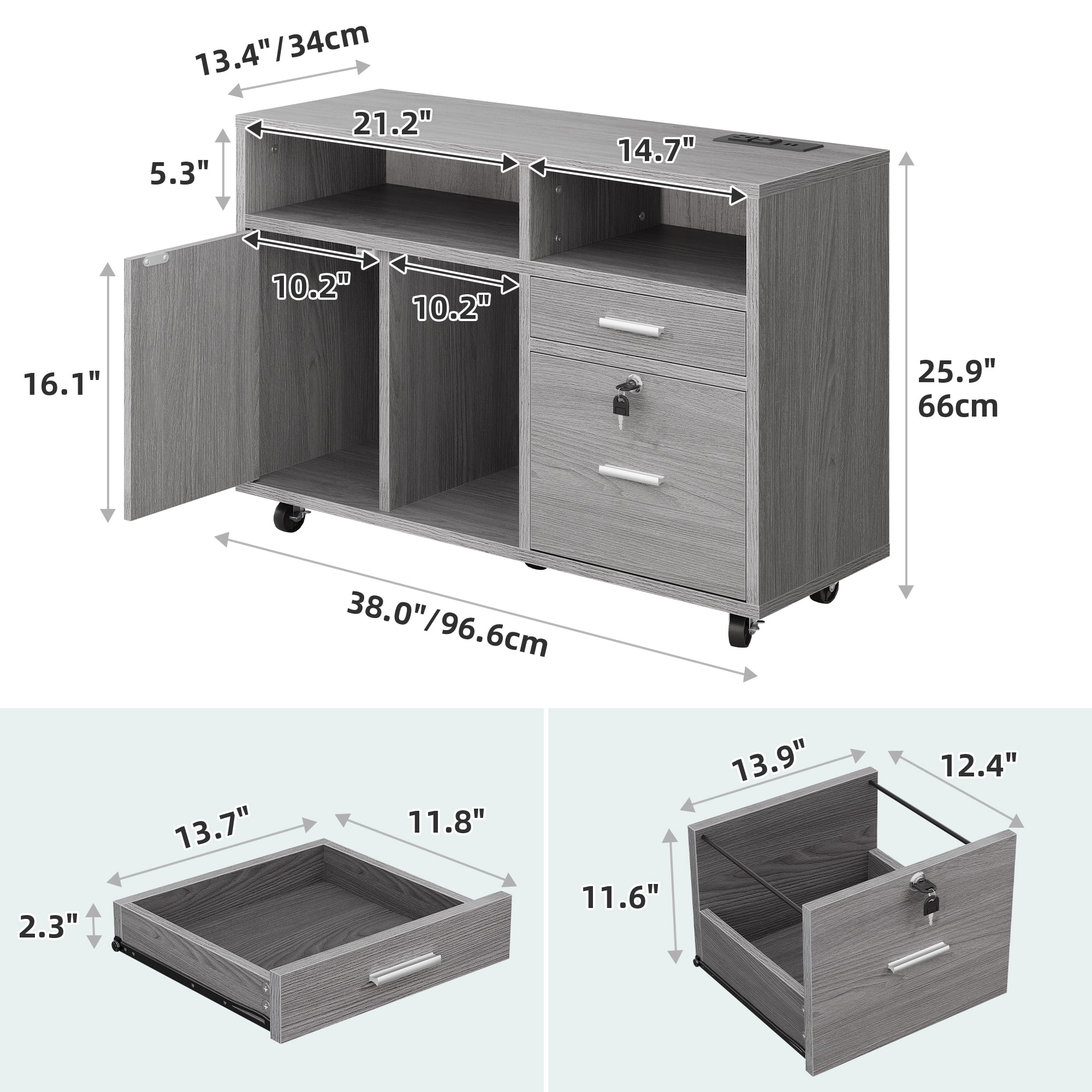 The Wood Lateral File Cabinet is a versatile and practical addition to any home office. This mobile storage cabinet not only provides ample space for organizing your files and documents but also doubles as a printer stand. It conveniently fits A4, letter, and legal-sized files, ensuring easy access and organization. In addition to the filing cabinet, it features open storage shelves, perfect for displaying books, office supplies, or personal decor items. The cabinet also serves as a charging station with 2 USB ports and 2 standard outlets, allowing you to conveniently charge your devices while working. With its 360° casters, this file cabinet can be easily moved around your workspace, providing flexibility and convenience. The cabinet is lockable, ensuring the security and confidentiality of your important documents. Constructed from high-quality wood, this file cabinet combines functionality with a stylish design, making it a perfect addition to any home office decor. Specifications: Color: Grey Material: Engineered Wood Overall Size: 13.4″D x 38″W x 26″H Number of Drawers: 2 Number of Doors: 1 Room Type: Entryway, Bedroom, Living Room, Home Office Assembly Required:Yes Package Included: 1 x File Cabinet 1 x Instructions 1 x Accessory Kit