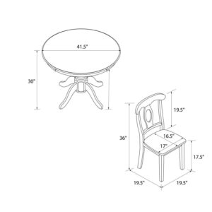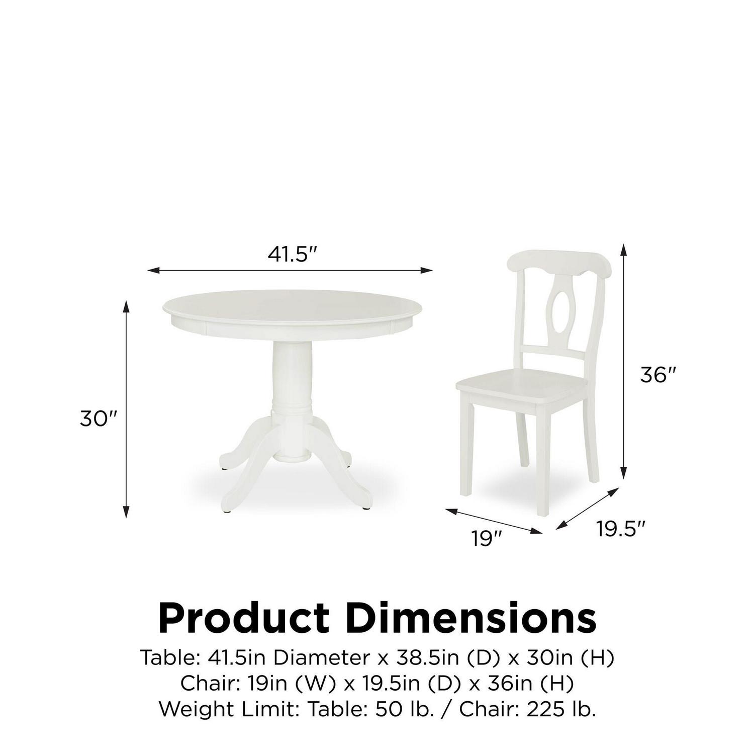 – Assembled Table Dimensions: 41.75in DIA. X 30in H. Assembled Chair Dimensions: 19.25in W X 19.63in D X 36in H. Seat Height: 17.25 . Table Weight Limit: 50lbs.