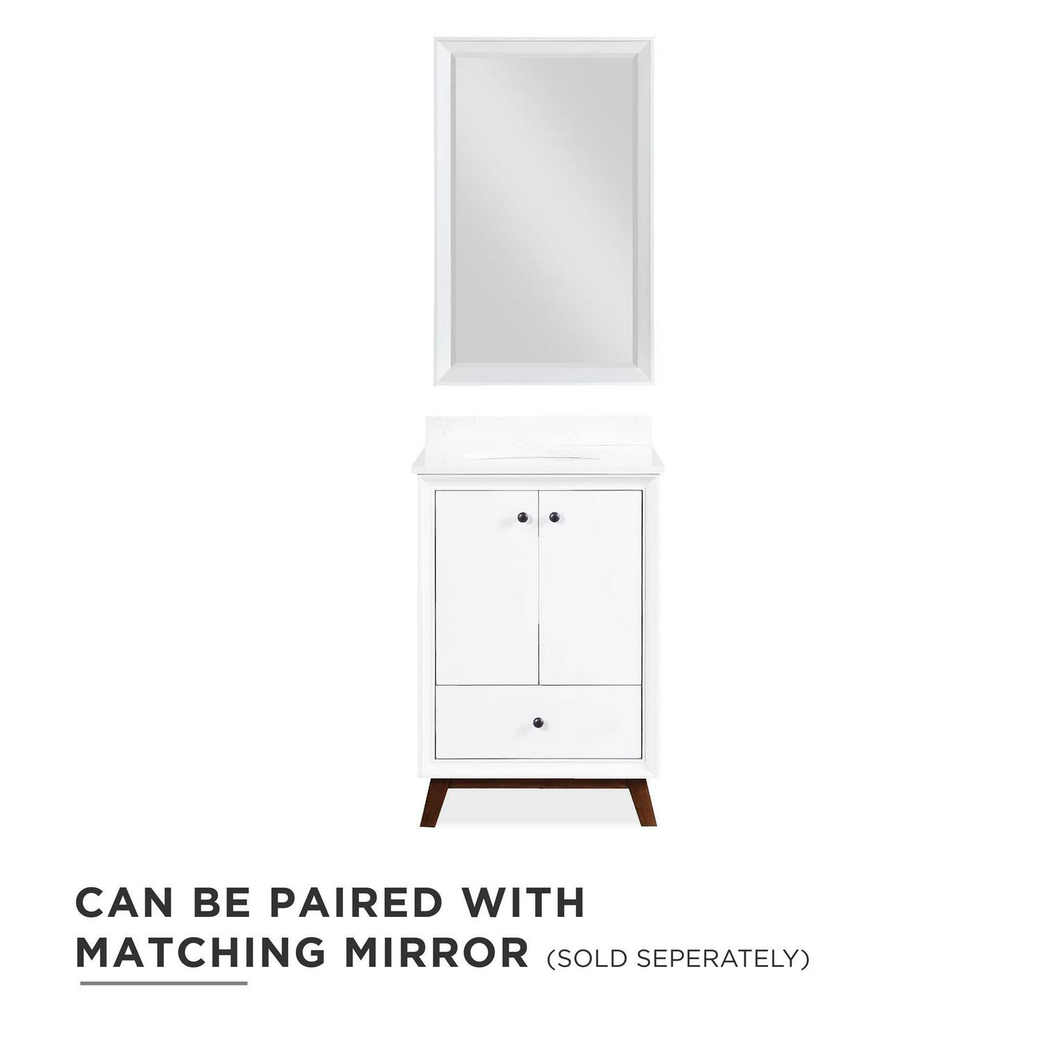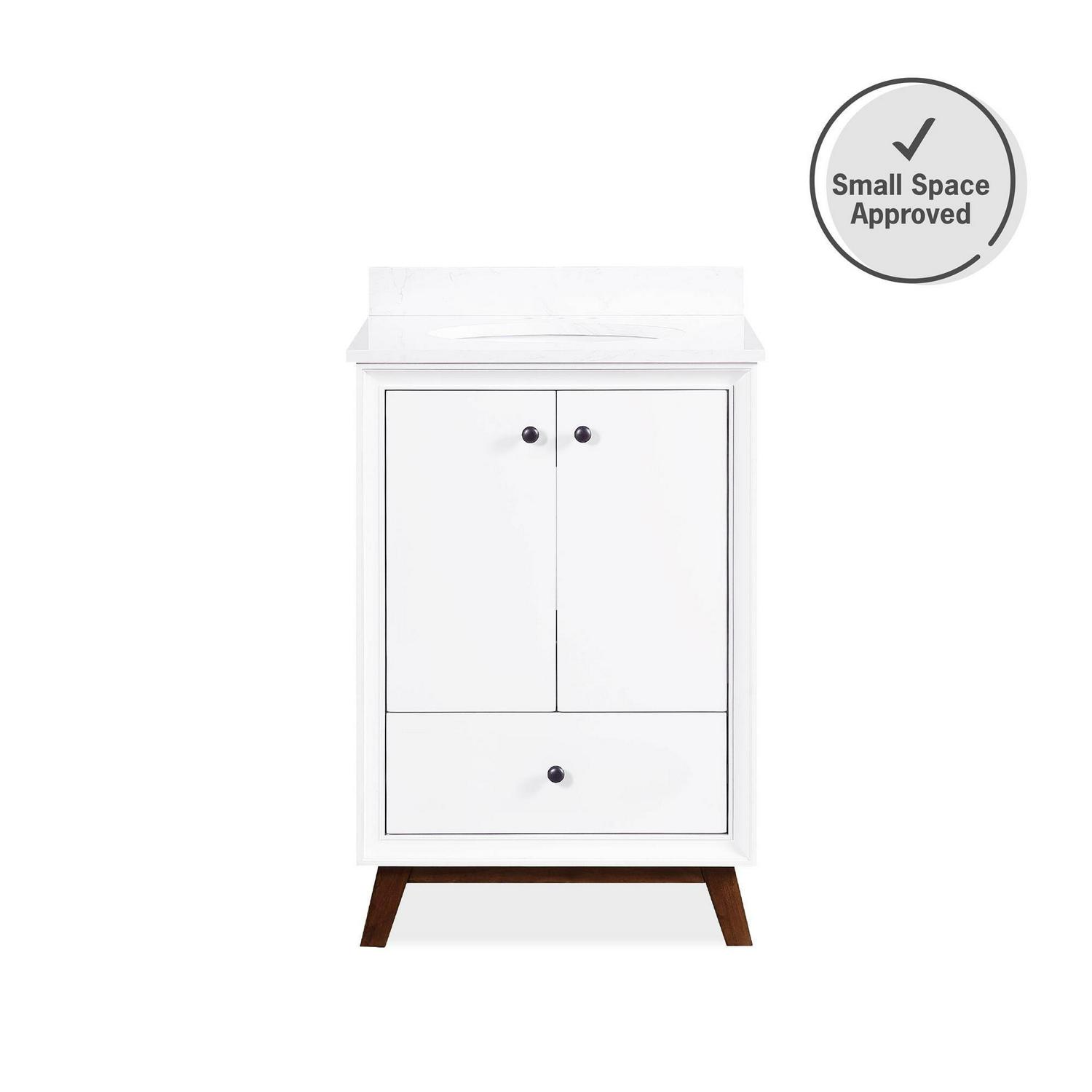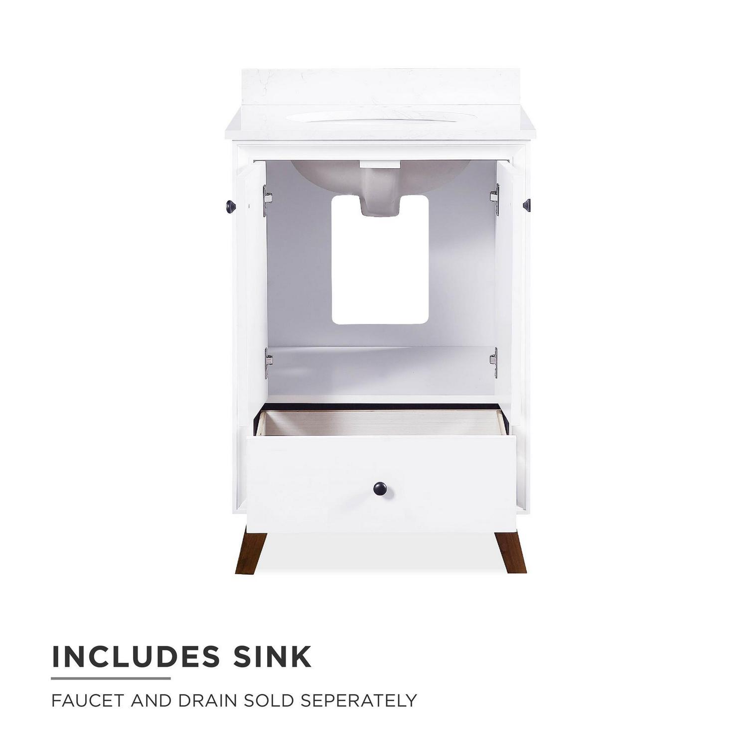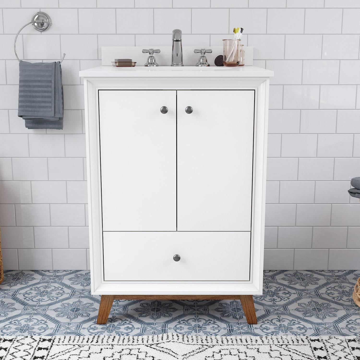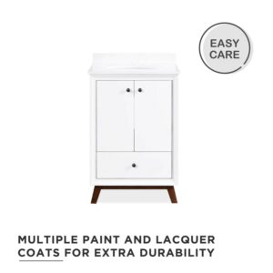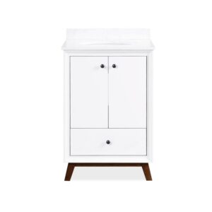 Every home needs a little touch of midcentury modern design, so why not incorporate it to your bathroom décor The DHP Bleeker Bathroom Vanity is just what you need to bring some character to your master bathroom, guest bathroom or powder room. Built with a combination of solid wood, engineered wood and fine wood veneer, the Bleeker is finished with semi matte black hardware, slanted wood feet and solid wood drawers. What s included One working drawer, metal knobs, a ceramic oval sink, a composite granite top and backsplash, as well as pre-drilled holes for easy faucet installation (faucet sold separately). The vanities are finished with multiple paint coats in the white and gray colors, and lacquer coating for added durability. Available in three sizes 24 , 30 and 36 the DHP Bleeker Bathroom Vanities can be paired with the matching mirrors from the DHP Tribecca collection. Mirrors sold separately.