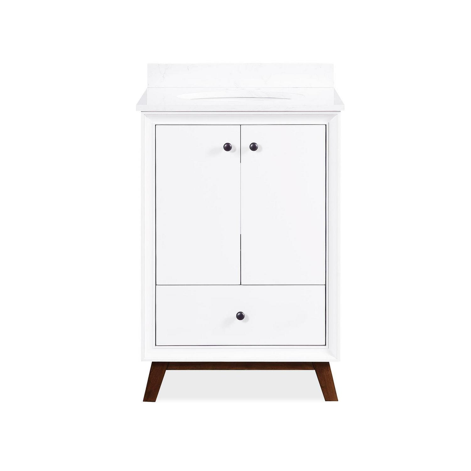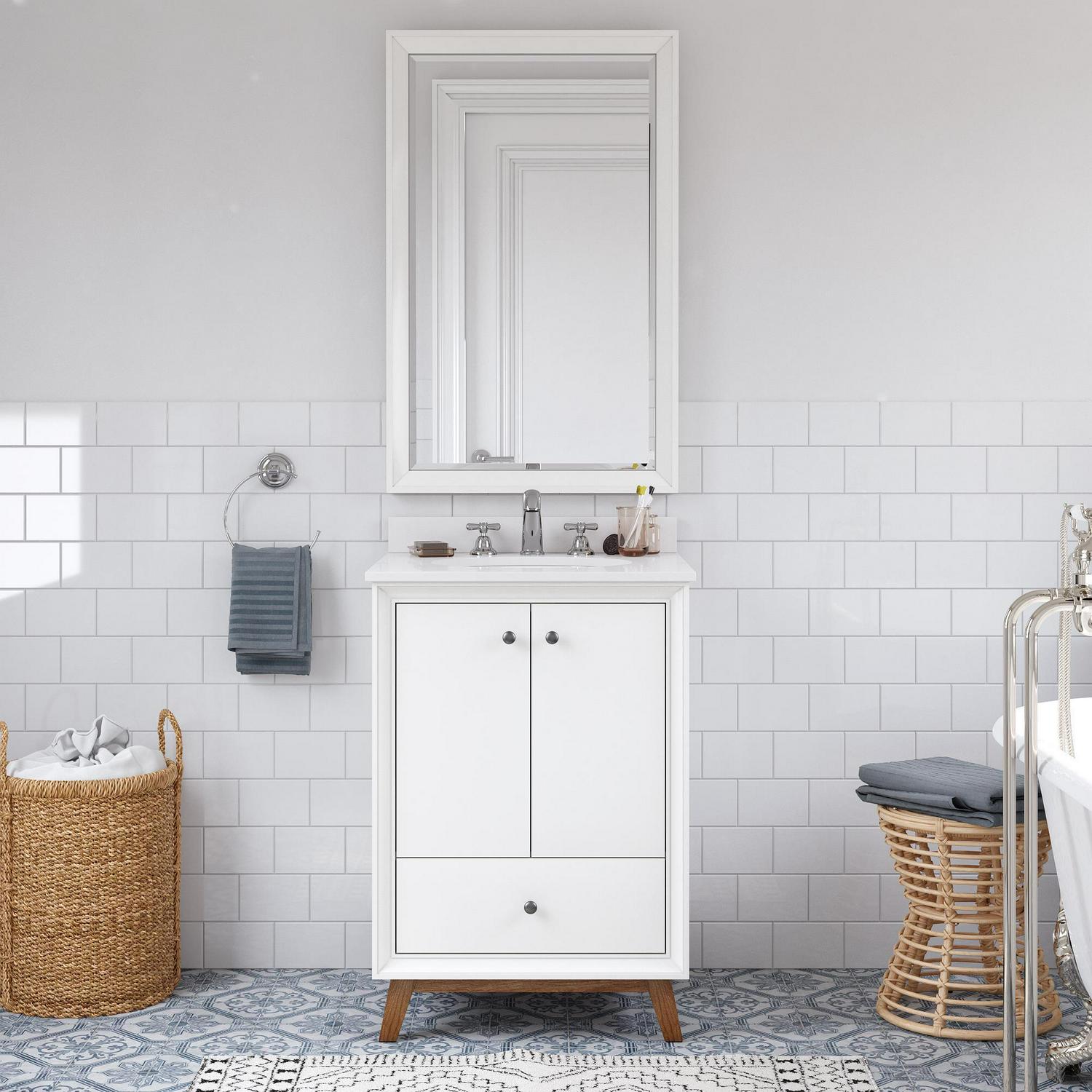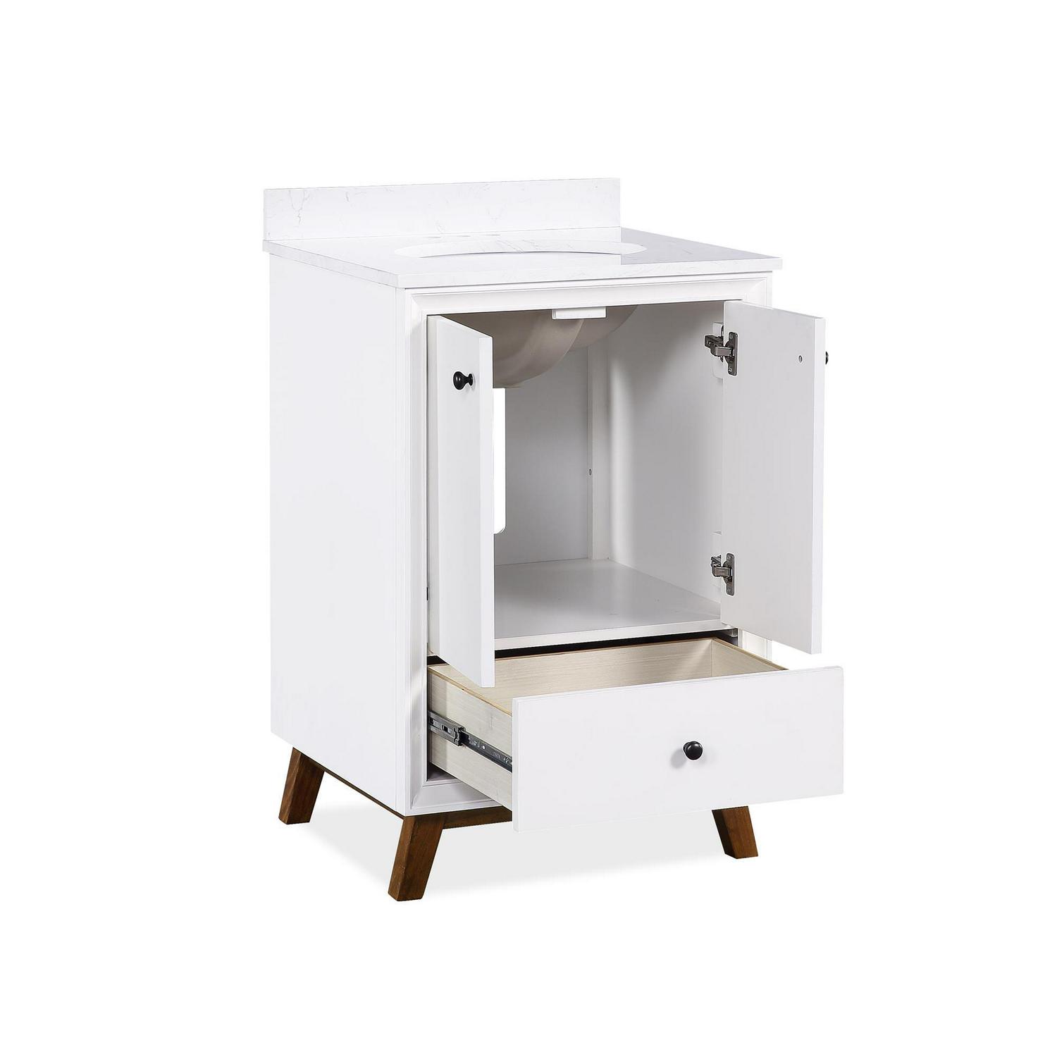 Every home needs a little touch of midcentury modern design, so why not incorporate it to your bathroom décor The DHP Bleeker Bathroom Vanity is just what you need to bring some character to your master bathroom, guest bathroom or powder room. Built with a combination of solid wood, engineered wood and fine wood veneer, the Bleeker is finished with semi matte black hardware, slanted wood feet and solid wood drawers. What s included One working drawer, metal knobs, a ceramic oval sink, a composite granite top and backsplash, as well as pre-drilled holes for easy faucet installation (faucet sold separately). The vanities are finished with multiple paint coats in the white and gray colors, and lacquer coating for added durability. Available in three sizes 24 , 30 and 36 the DHP Bleeker Bathroom Vanities can be paired with the matching mirrors from the DHP Tribecca collection. Mirrors sold separately.