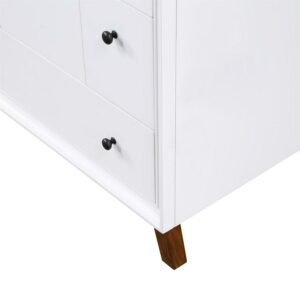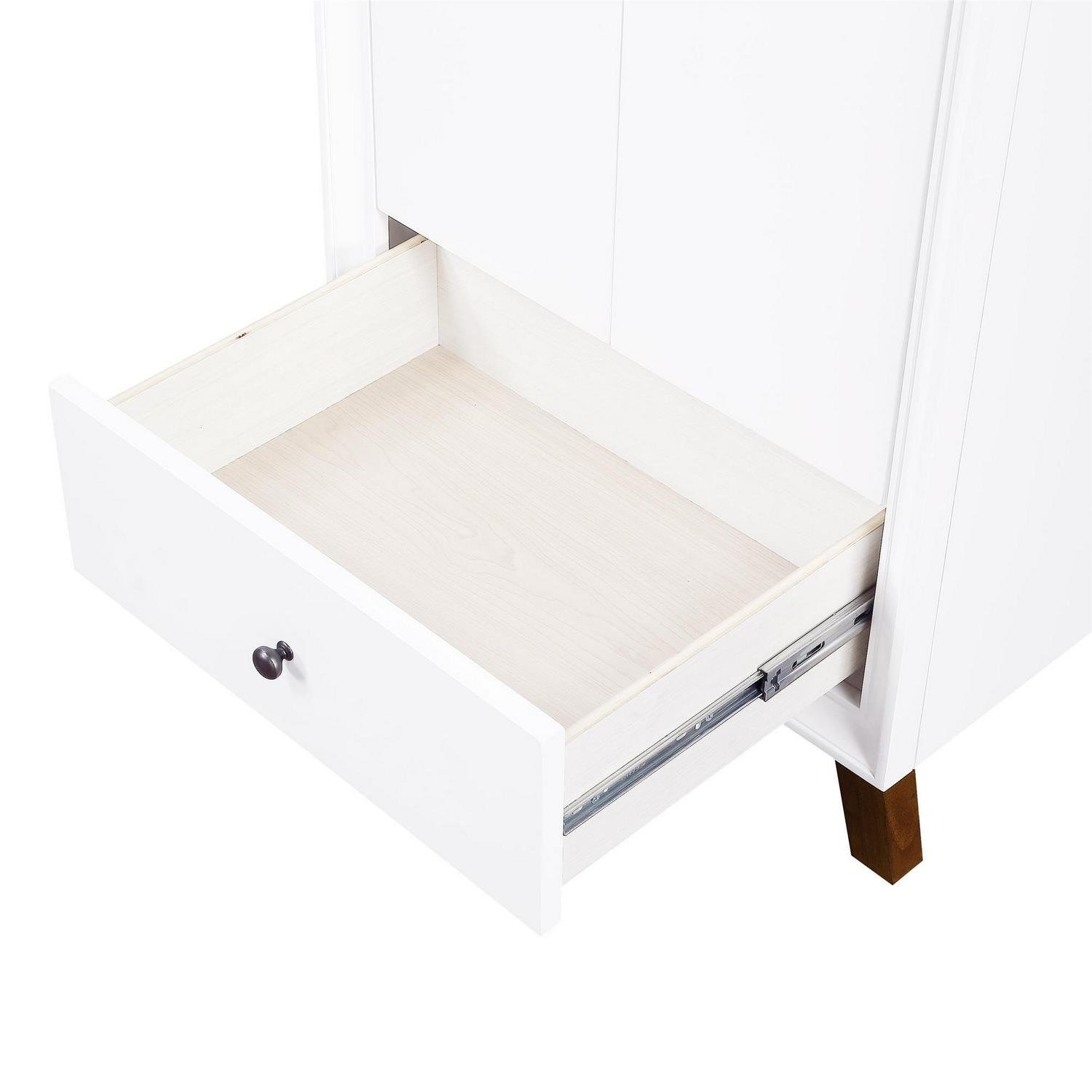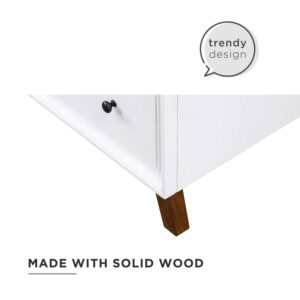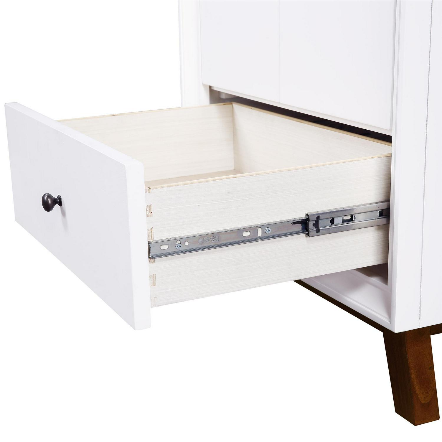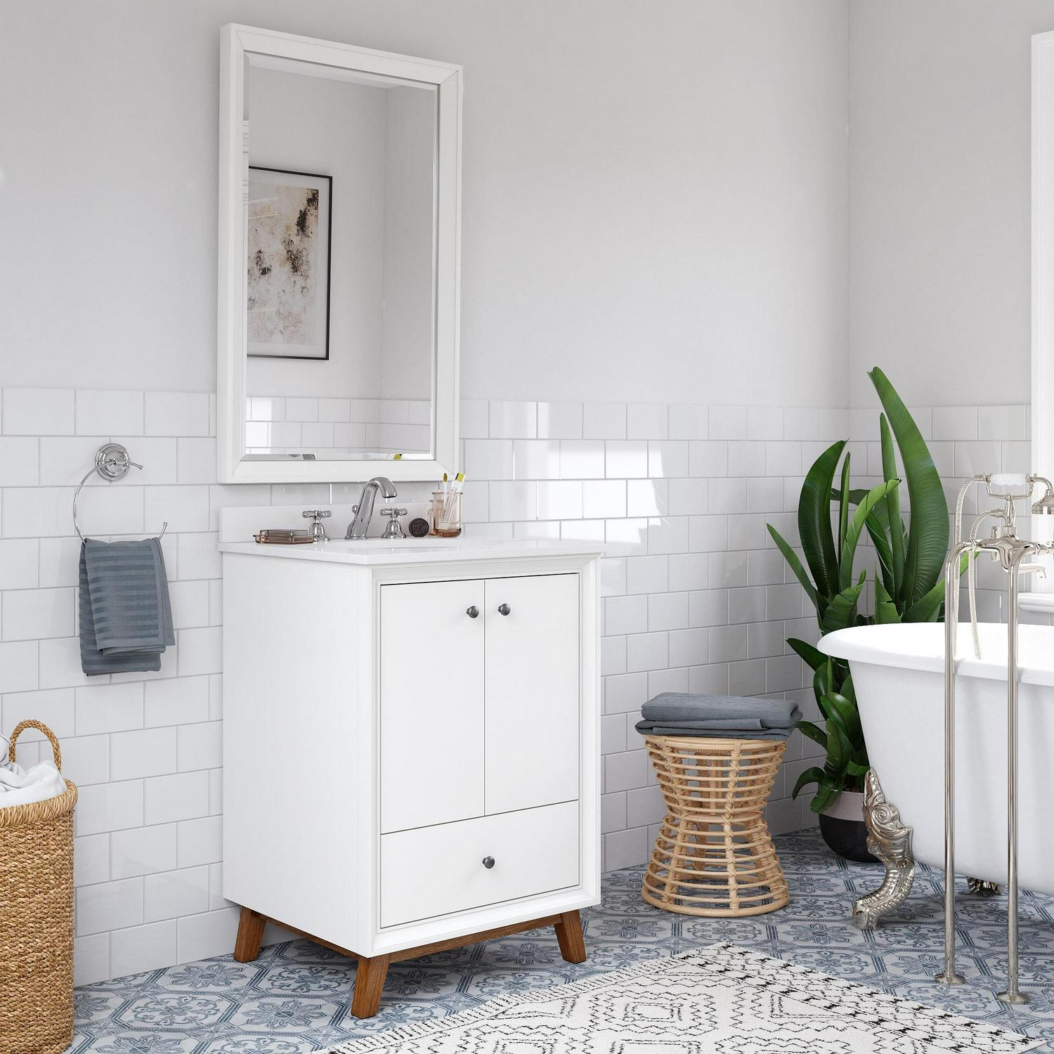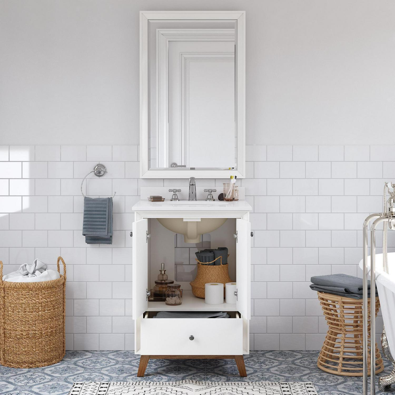 Every home needs a little touch of midcentury modern design, so why not incorporate it to your bathroom décor The DHP Bleeker Bathroom Vanity is just what you need to bring some character to your master bathroom, guest bathroom or powder room. Built with a combination of solid wood, engineered wood and fine wood veneer, the Bleeker is finished with semi matte black hardware, slanted wood feet and solid wood drawers. What s included One working drawer, metal knobs, a ceramic oval sink, a composite granite top and backsplash, as well as pre-drilled holes for easy faucet installation (faucet sold separately). The vanities are finished with multiple paint coats in the white and gray colors, and lacquer coating for added durability. Available in three sizes 24 , 30 and 36 the DHP Bleeker Bathroom Vanities can be paired with the matching mirrors from the DHP Tribecca collection. Mirrors sold separately.