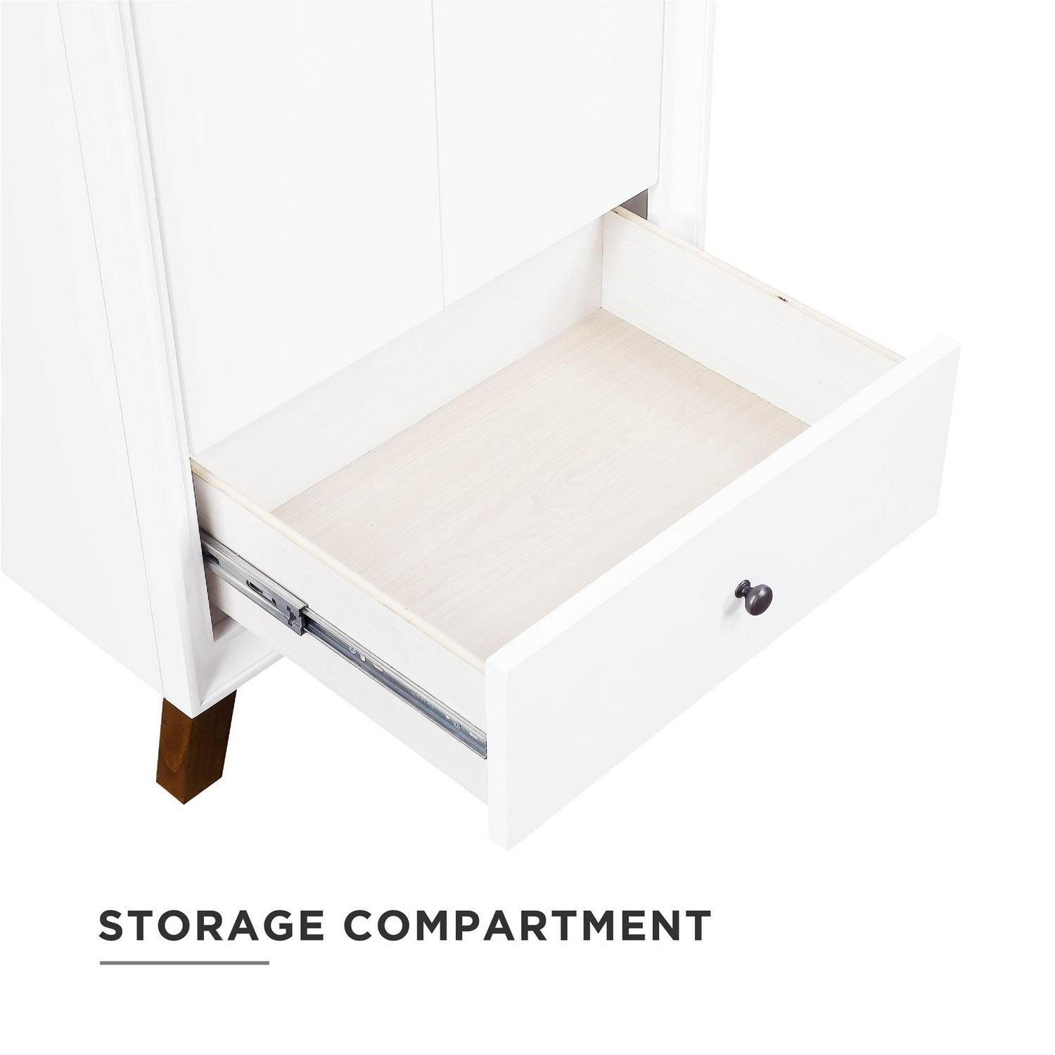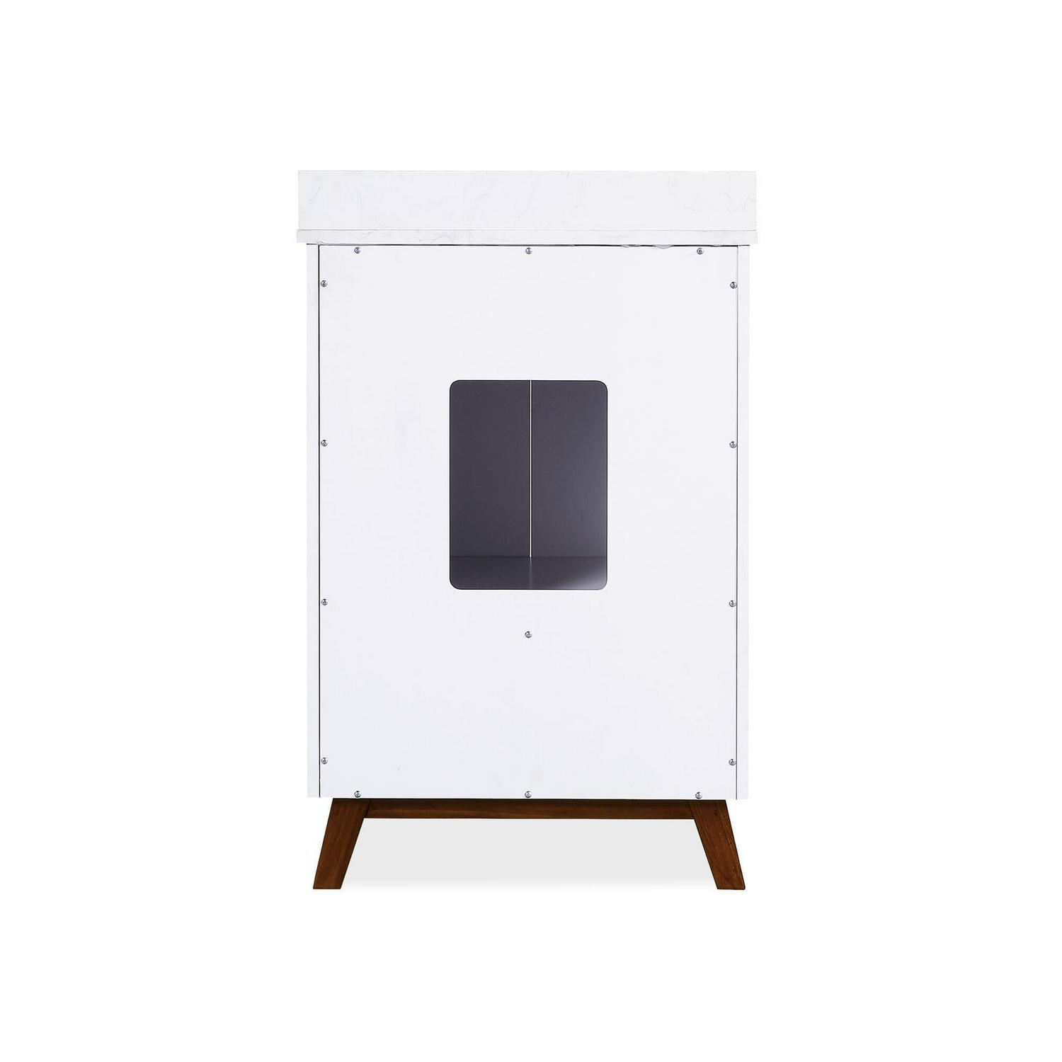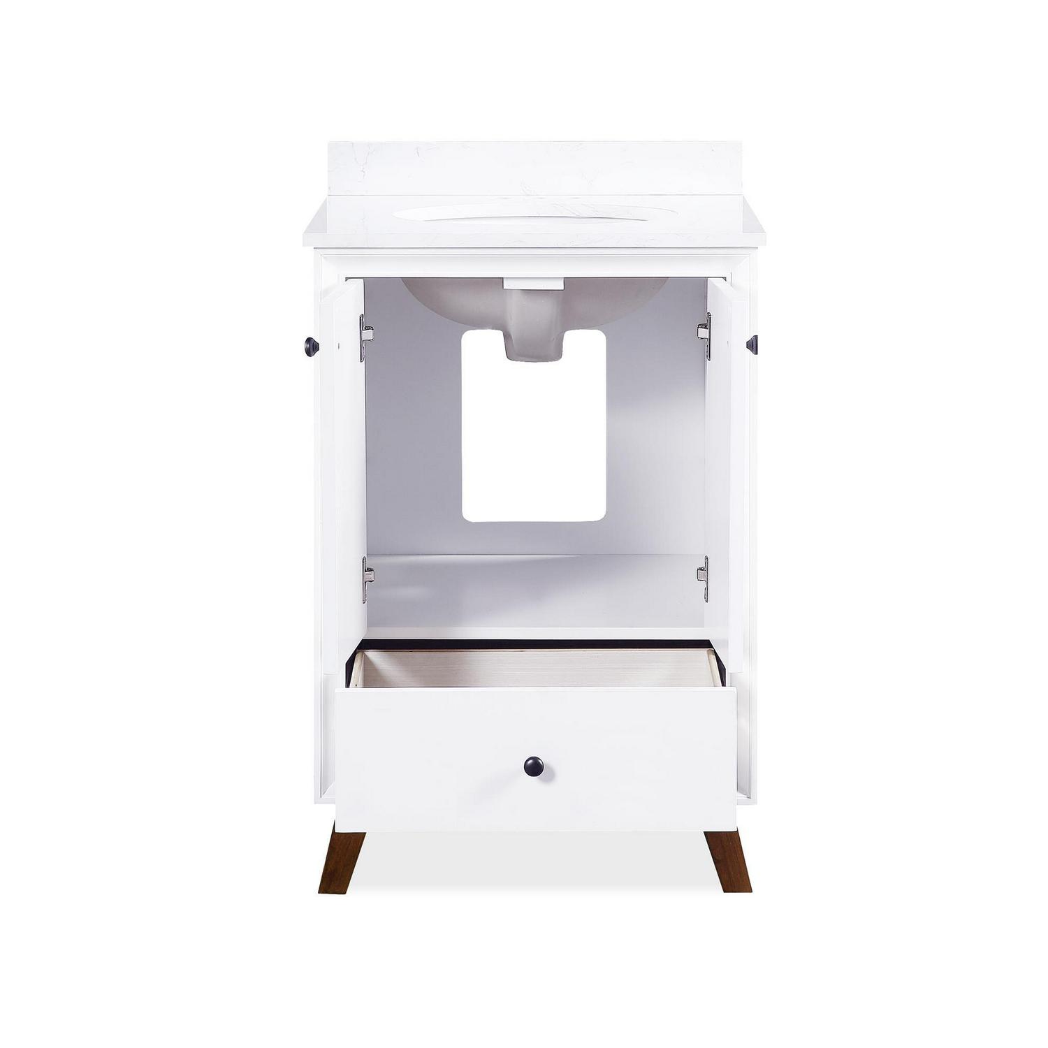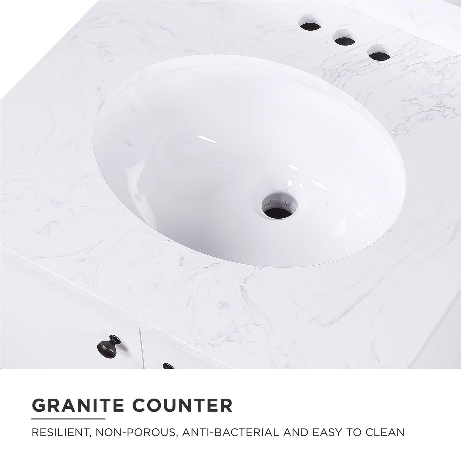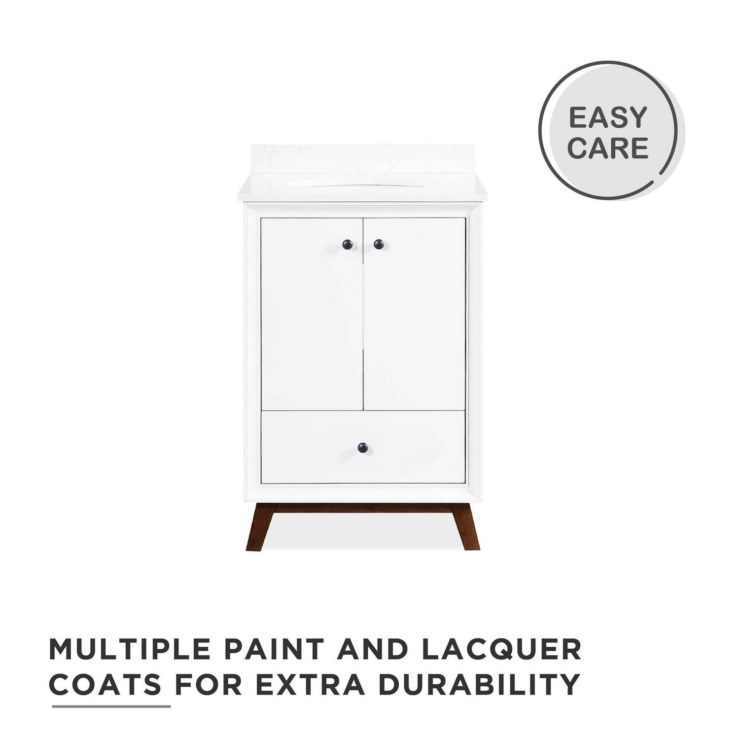 – Crafted with solid wood, engineered wood and fine wood veneer. Finished with semi matte black hardware, slanted wood feet and solid wood drawers. Finished with multiple paint coats for the white and gray colors and lacquer coating for extra durability. Composite granite counter top is resilient, non-porous and easy to clean and maintain. The Chocolate Spice vanity has a composite white top and the white/gray versions have a composite Carrera top. Back panel cut-out for easy access to plumbing.