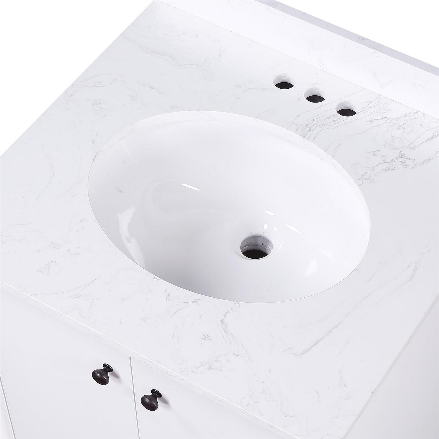 – Included: one working drawer, metal knobs, ceramic oval sink, composite granite top and backsplash, pre-drilled holes for easy faucet installation. Holes are predrilled and positioned for 4 Centerset faucet (faucet and drain sold separately).