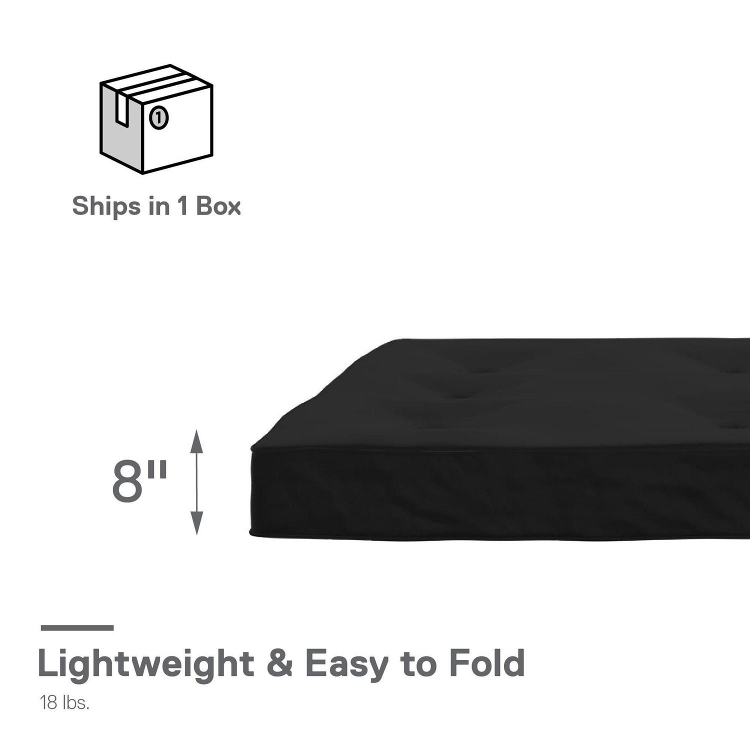 – EASY TO HANDLE: Thanks to its lightweight build, this easily portable futon mattress can be moved from the living room to the basement in a cinch. Futon mattress dimensions: 75″L x 54″W x 8″H. Carton dimensions: 57″L x 19″W x 19″H. Net weight: 27 lbs. Gross weight: 32 lbs. 1-year limited warranty
