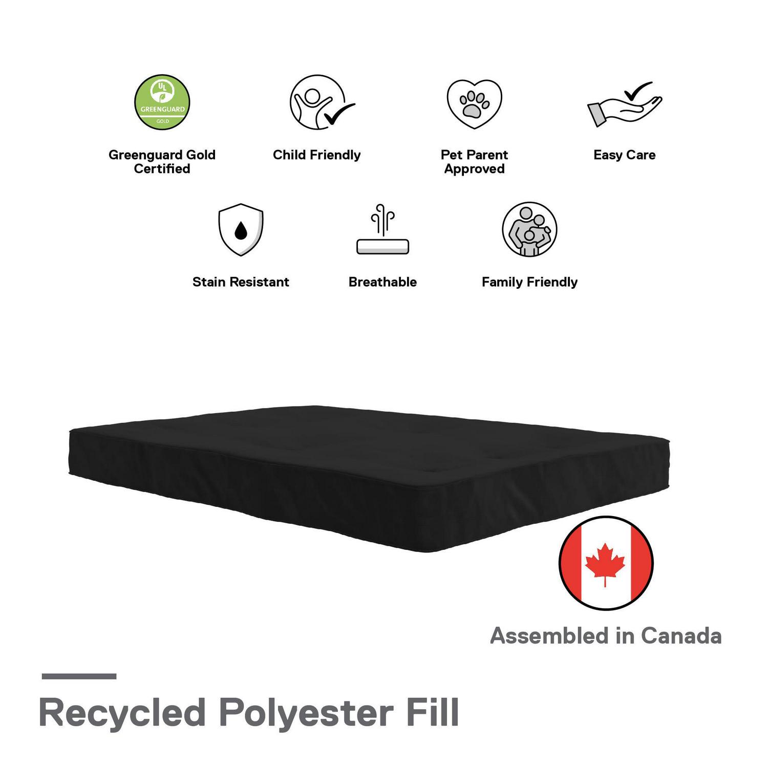 Stay inside and enjoy the ride with the DHP Caden 8″ Thermobonded High Density Polyester Fill Futon Mattress. Designed for any full-size futon frame (sold separately), the Caden quickly folds from a sleeping to a sitting position for hassle-free use and just as easily works as a fun floor mattress for movie nights and playdates. Its medium-support thermobonded high-density polyester core possesses essential moisture-wicking properties for the desired breathability that teens, children, and overnight guests will welcome. Its lightweight construction allows easy movement for carry-and-go set-up in any space, whether it’s your basement den, child’s playroom, spare bedroom, or even your home office. And when it’s not needed, simply fold it up for handy closet storage. Featuring a durable polyester knit cover, its kid and pet-friendly fabrication is not only water repellent but also easy to wipe clean, while its tufting details provide a stylish backdrop that helps retain mattress shape. Assembled in Canada with eco-conscious construction, it contains 50% recycled polyester fibers, and its clean credentials are solidified by its GreenGuard Gold Certified status, recognizing that it has passed stringent indoor air quality testing. Available in multiple colors and thickness options.