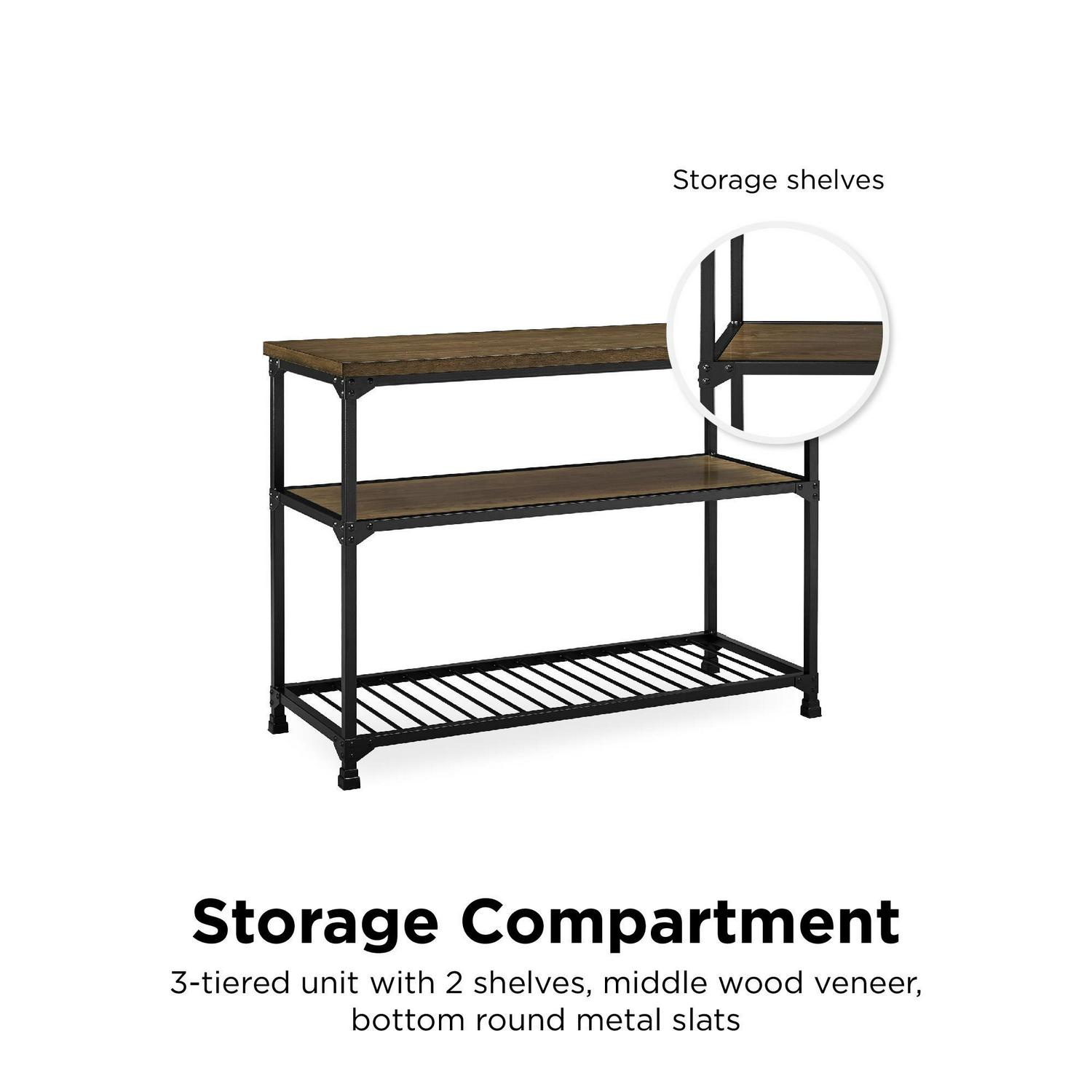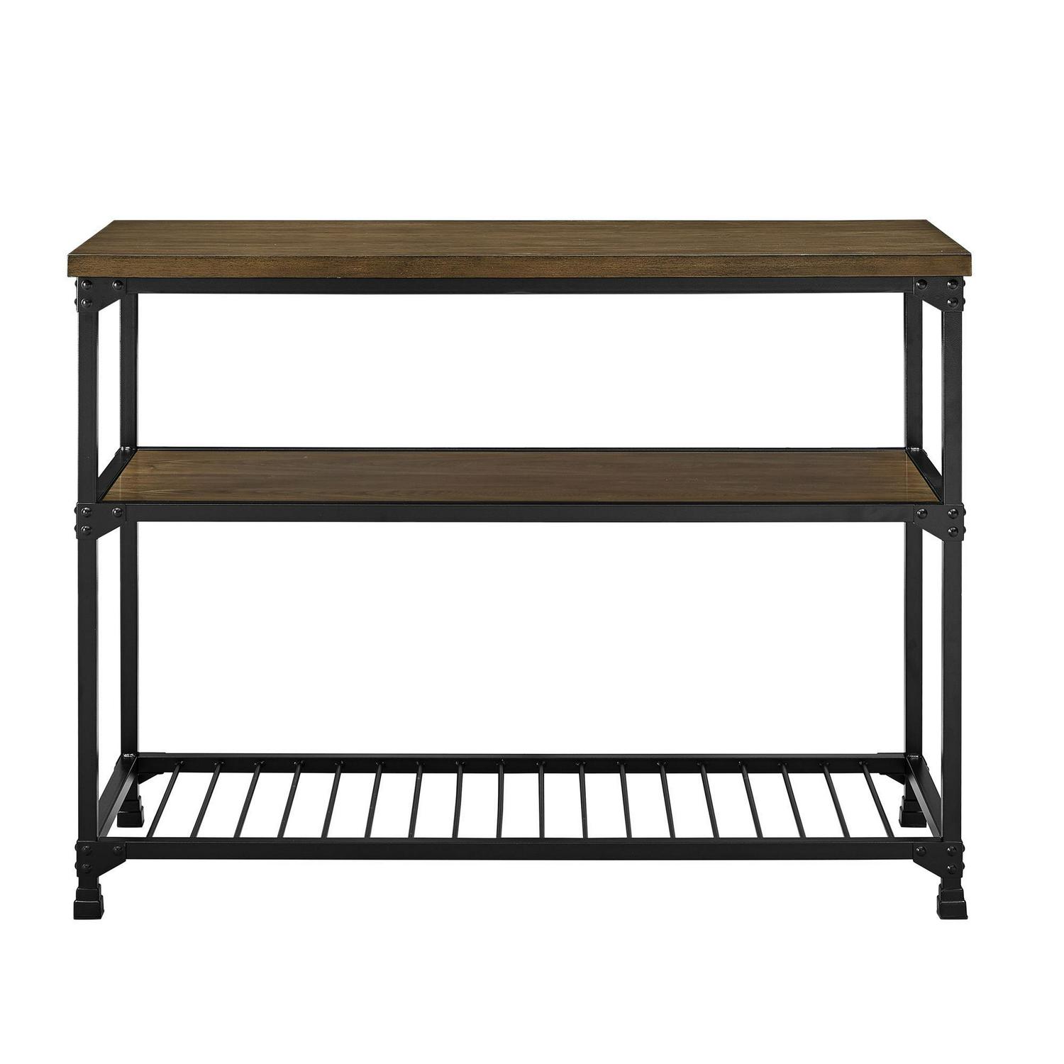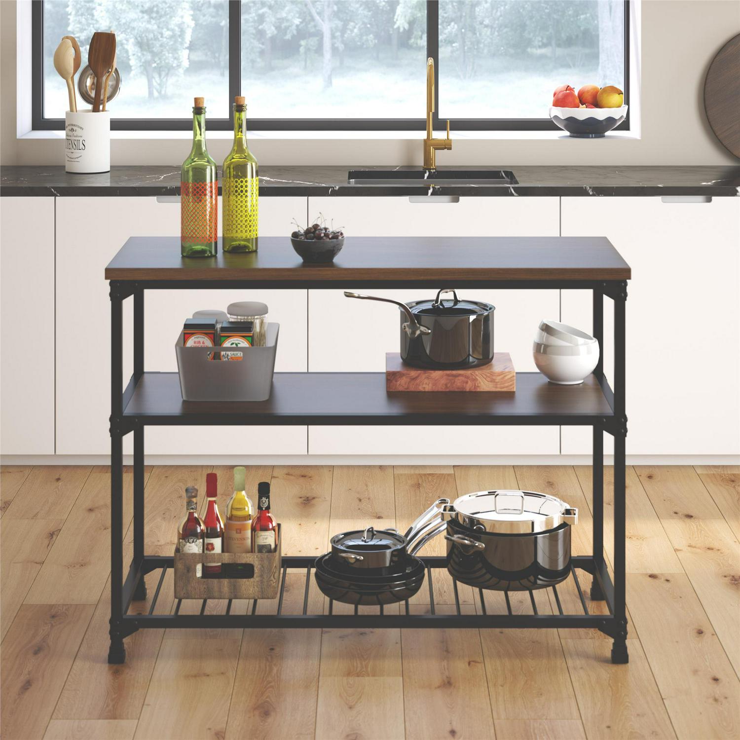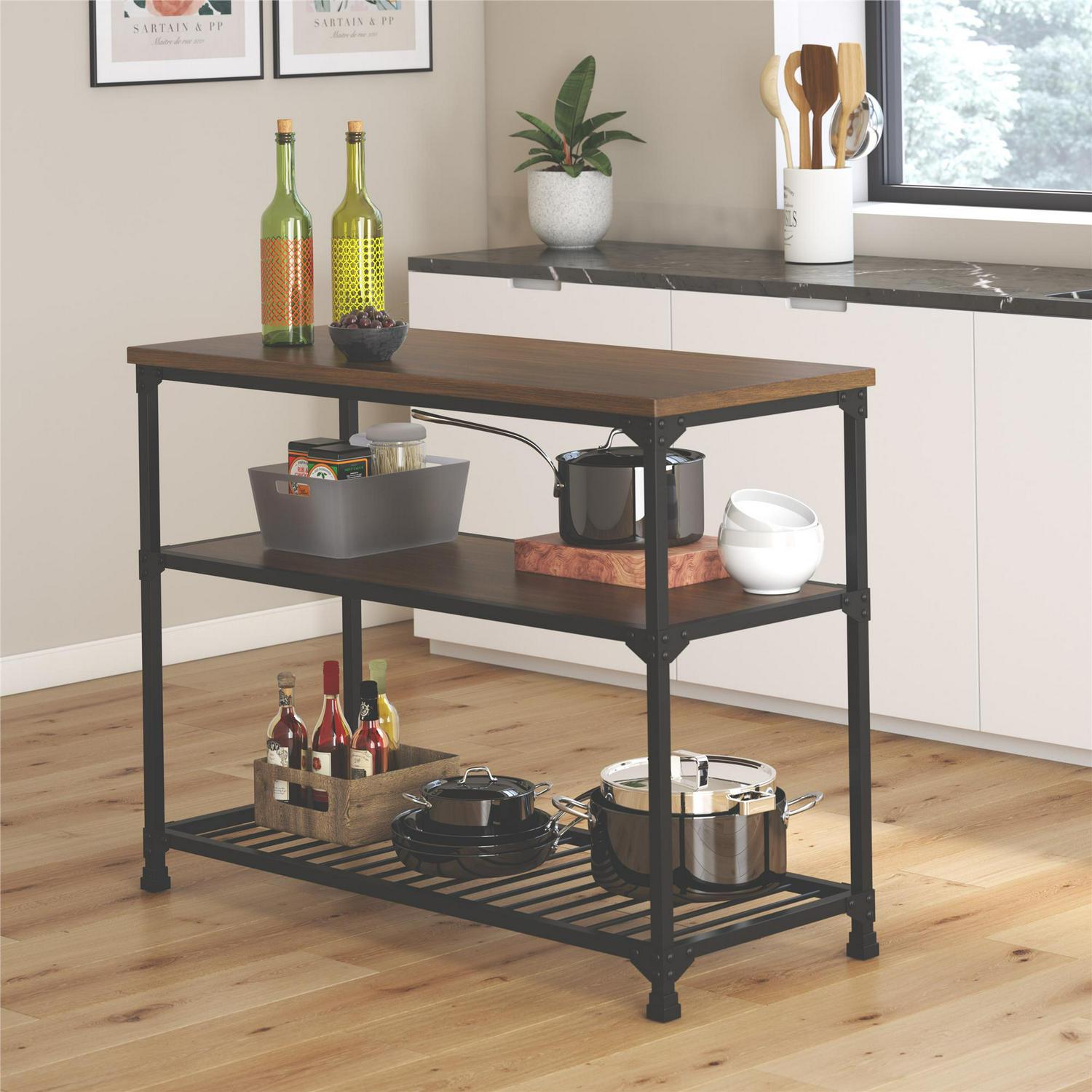 Rustic styling meets generous surface space with the DHP Cassy Multifunction Island. Bursting with factory-chic flair, the Cassy is most at home in the kitchen, home office, basement or foyer with its multi-use design. Crafted from metal and wood veneer, and showcasing an open concept look, this three-tiered multifunction island brings style and function to any decor. Its black metal finish adds elegance to any room and perfectly complements its equally stylish antique oak finished shelves. The spacious countertop works as an ideal prep or workstation, while the two open shelves ensure everything has storage space. Works perfectly in the kitchen as a convenient spot to store your pots and pans or as a front entrance spot to keep all of your incoming mail or keys, its versatility knows no limits. Bring warmth and style into your home with the vintage industrial design of the DHP Cassy Multifunction Island.