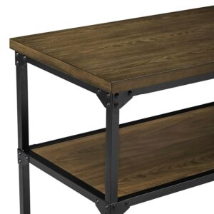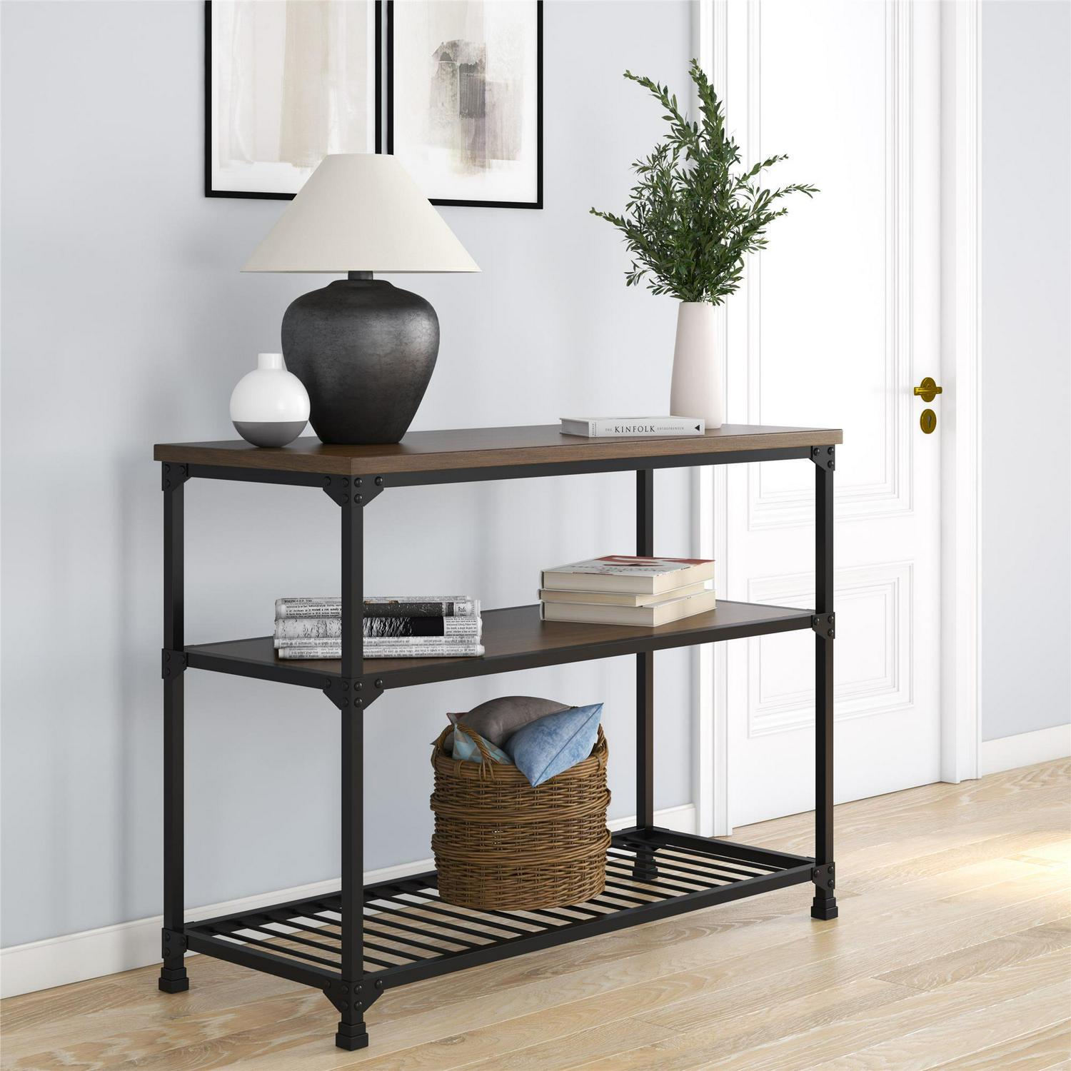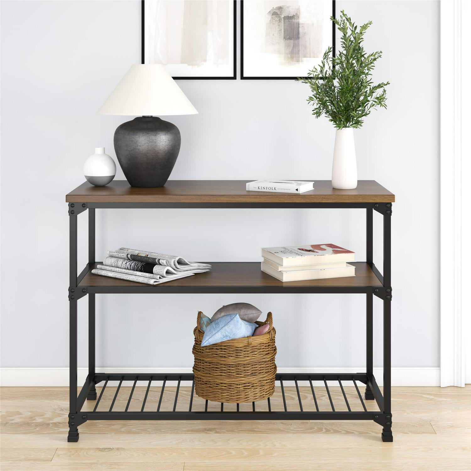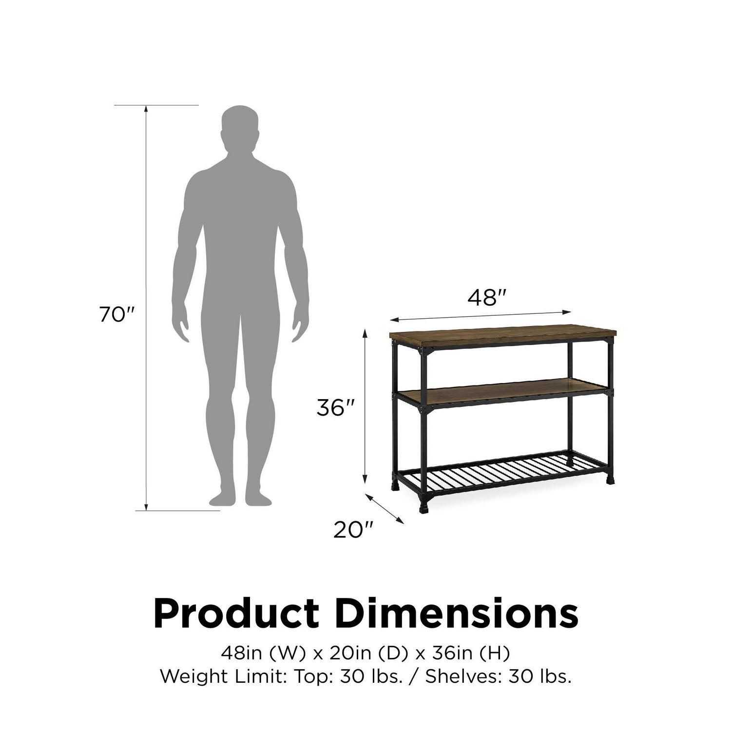 Rustic styling meets generous surface space with the DHP Cassy Multifunction Island. Bursting with factory-chic flair, the Cassy is most at home in the kitchen, home office, basement or foyer with its multi-use design. Crafted from metal and wood veneer, and showcasing an open concept look, this three-tiered multifunction island brings style and function to any decor. Its black metal finish adds elegance to any room and perfectly complements its equally stylish antique oak finished shelves. The spacious countertop works as an ideal prep or workstation, while the two open shelves ensure everything has storage space. Works perfectly in the kitchen as a convenient spot to store your pots and pans or as a front entrance spot to keep all of your incoming mail or keys, its versatility knows no limits. Bring warmth and style into your home with the vintage industrial design of the DHP Cassy Multifunction Island.
