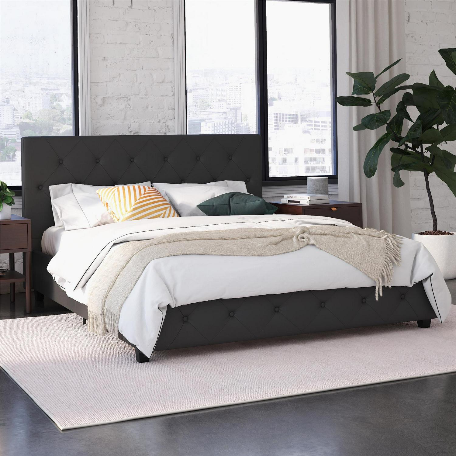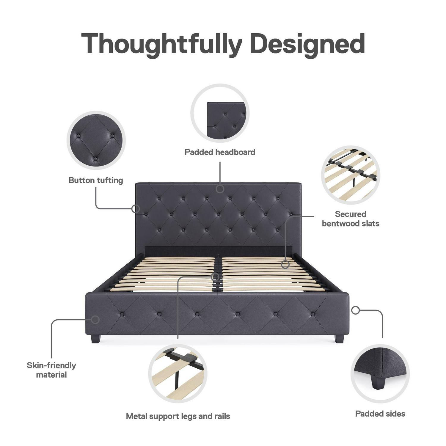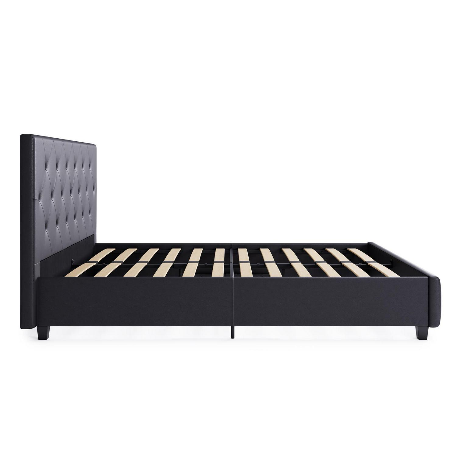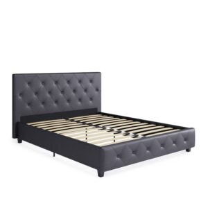Trend alert! The DHP Dakota Upholstered Platform Bed is the perfect amount of contemporary luxury to transform your bedroom décor. Ideal in your master bedroom, guest bedroom or teen’s room, the Dakota’s headboard boasts diamond button tufted detailing that radiates a contemporary chic look. Upholstered in a faux leather fabric with padding for superior comfort, the DHP Dakota is designed to infuse style and luxury into your room décor. The sturdy bentwood slat system not only provides extra support, it also promotes mattress breathability to allow your mattress to stay fresher, longer. What’s more, the slats remove the need for any additional box spring or foundation. The Dakota is built with metal side rails for added stability and durability, as well as a center metal rail and leg for extra support. Available in Twin, Full, Queen and King size, this gorgeous platform bed can give your bedroom the style and coziness you are looking for.