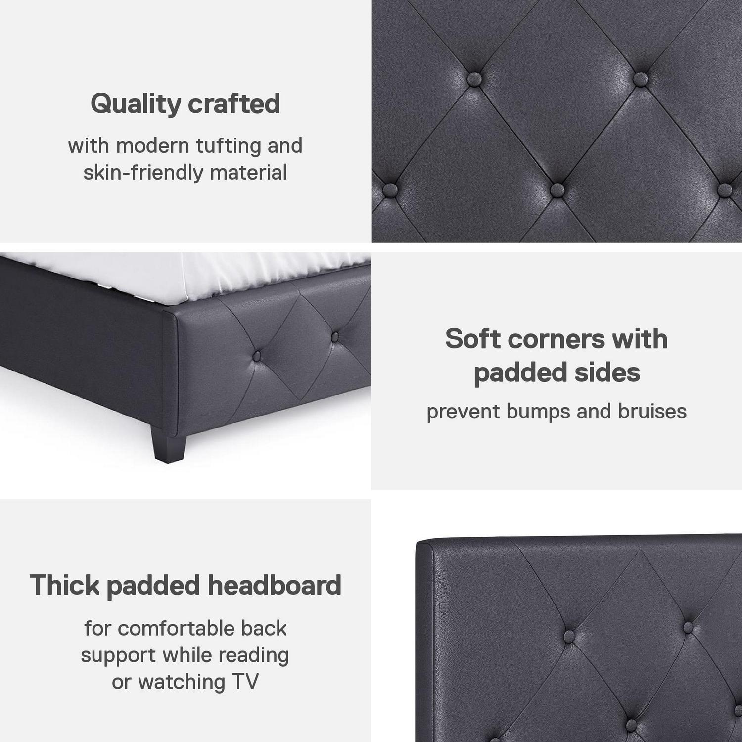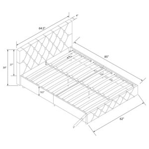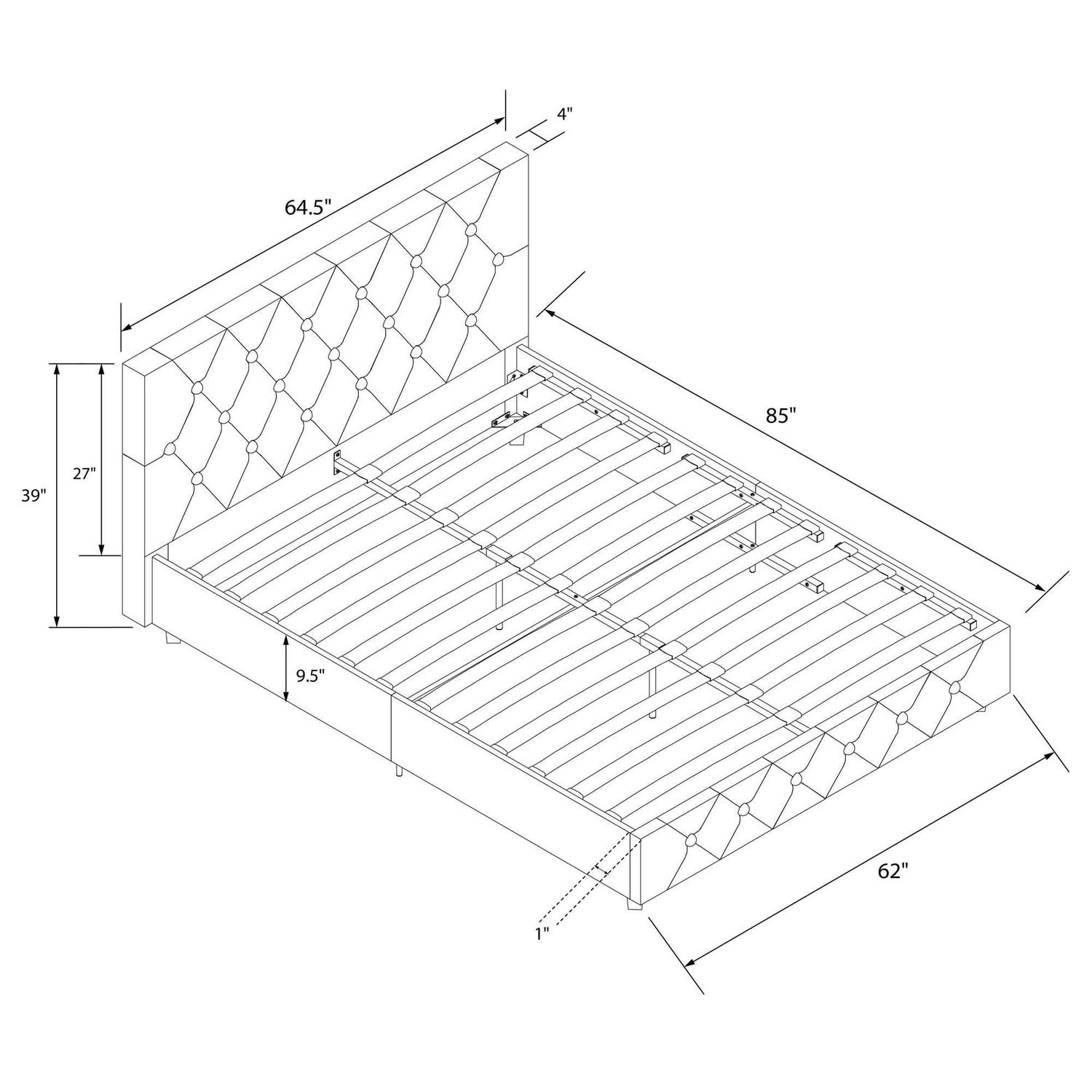 – Space Saving: Designed to maximize bedroom space, this modern low profile upholstered bed rests on faux wood legs and features an elegant diamond button tufted headboard and bottom side board. Dimensions: 85″L x 64.5″W x 39″H. Max weight limit: 500 lbs