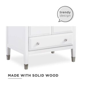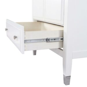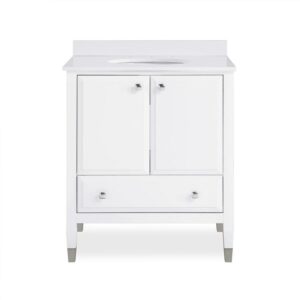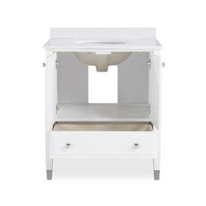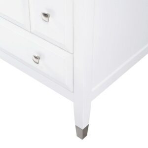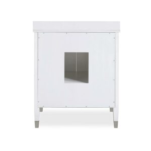 – Crafted with solid wood, engineered wood and fine wood veneer. Finished with brushed stainless steel hardware, metal decorated feet and solid wood drawers. Finished with multiple paint coats for the white and gray colors and lacquer coating for extra durability (except for wood veneers). Composite granite counter top is resilient, non-porous and easy to clean and maintain. Back panel cut-out for easy access to plumbing.
