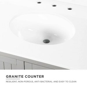 – Crafted with solid wood, engineered wood and fine wood veneer. Finished with brushed stainless steel hardware, solid wood feet and solid wood drawers. Finished with multiple paint coats and lacquer coating for extra durability. Composite granite counter top is resilient, non-porous and easy to clean and maintain. Back panel cut-out for easy access to plumbing.