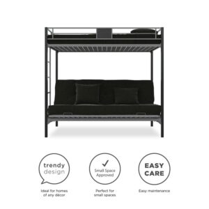 Modern, hip and trendy, DHP’s Silver Screen Twin/Futon Bunk Bed brings a chic design to your child’s bedroom, while still providing safety, versatility and durability. The clean and sleek lines of the metal frame become a focal point of the room, while the full-length guardrails, childproof mechanism and ladder are there for safety. The futon bottom bunk converts easily from couch to extra sleeper, making the Silver Screen Twin/Futon Bunk Bed by DHP an ideal space-saving option for a room of any size. Mattresses sold separately.