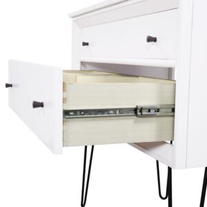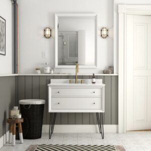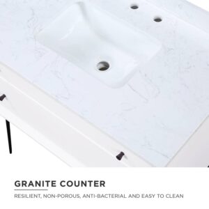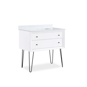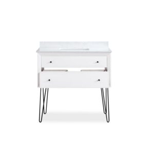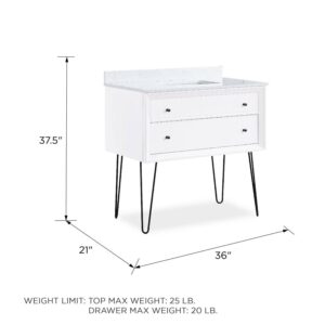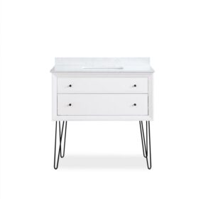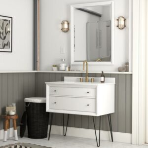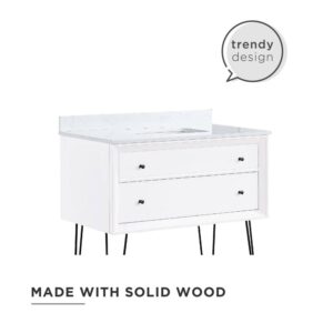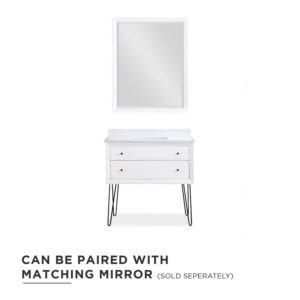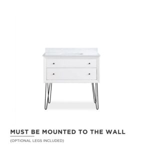 The DHP Tribecca Vanity thinks outside the box! The midcentury modern style inspired bathroom vanity has beautiful metal hairpin legs that are optional to fit with your bathroom style. This means that the vanity must be mounted to the wall as the legs are simply a design feature. Crafted with a mixture of solid wood, engineered wood and fine wood veneer, the Tribecca includes one working drawer, metal knobs, a rectangular ceramic sink, a composite granite top and backsplash and pre-drilled faucet holes. Faucet sold separately. The composite granite counter top is resilient, non-porous and easy to clean. As for the rest of the vanity, it is finished with multiple paint coats (for the white and gray color) as well as a lacquer coating for extra durability. The DHP Tribecca Vanity is available in multiple sizes 24 , 30 and 36 and can be paired with the matching Tribecca mirror (sold separately).