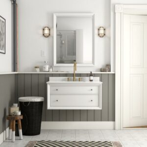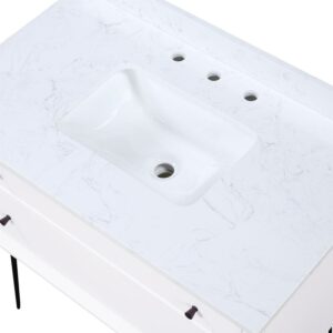 – Crafted with solid wood, engineered wood and fine wood veneer. Finished with semi matte black hardware and solid wood drawers. Vanity must be mounted to the wall with optional metal hairpin legs. Finished with multiple paint coats for the white and gray color and lacquer coating for extra durability (except wood veneers). Composite granite counter top is resilient, non-porous and easy to clean and maintain. The Chocolate Spice vanity has a composite white top and the white/gray versions have a composite Carrera top. Back panel cut-out for easy access to plumbing.