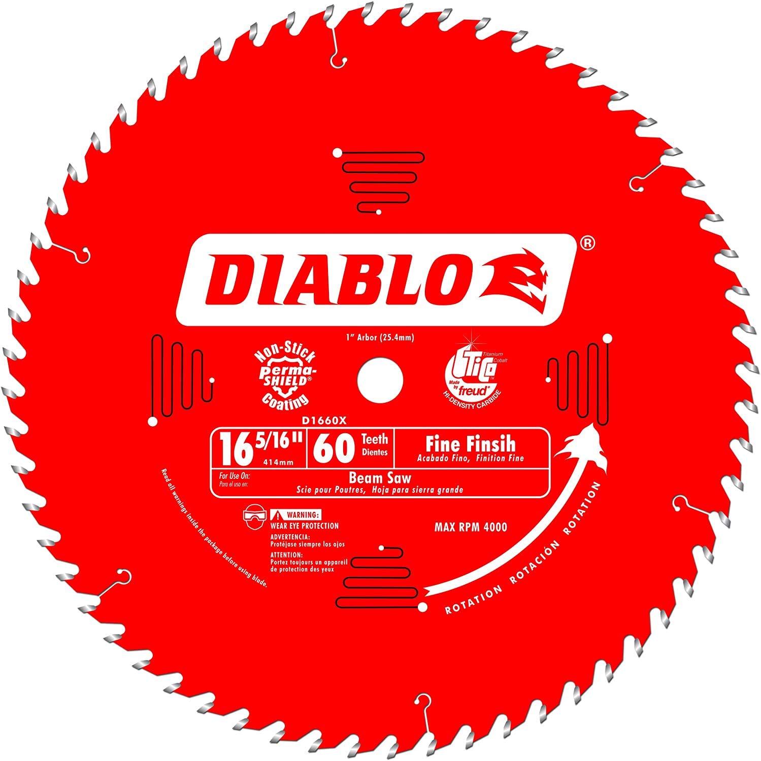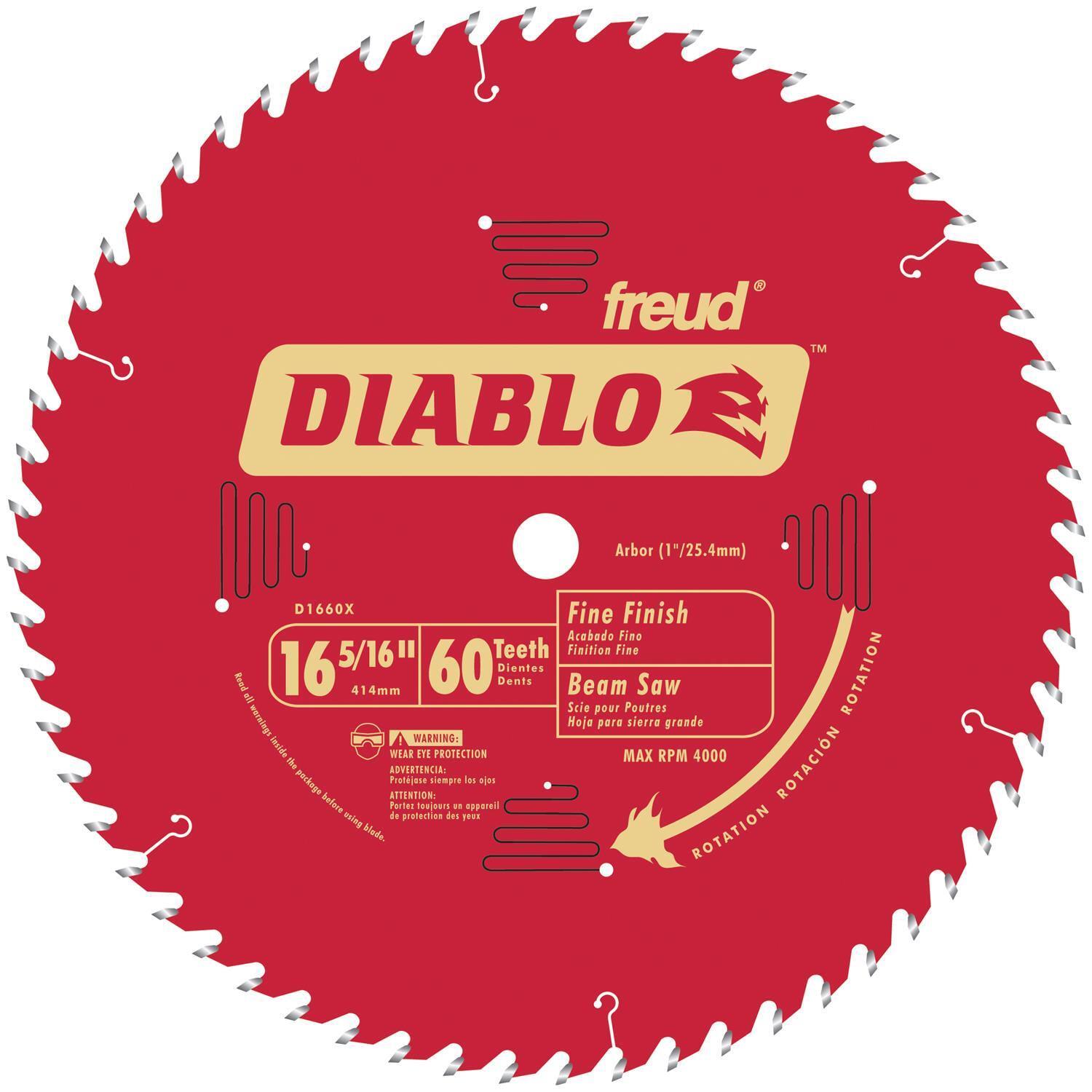 Product Description16-5/16X60X1 ATB REDFrom the ManufacturerDiablo Beam Saw Blades are designed for large capacity beam, post and timber cutting. 16-5/16-Inch Beam Saw Blade is ideal for timber framing such as LVL, Gleams and Parlays. Cuts up to 6 1/4-Inch at 90 Degrees and 4 3/16-Inch at 45 Degrees. Durable Freud’s Tico Micro Grain Titanium Carbide Teeth for razor-sharp cuts and long life. Perma-Shield permanent non-stick coating prevents gumming and corrosion.16-5/16-Inch by 60t ATB 1-Inch arbor. Design for Makita Beam Saw.