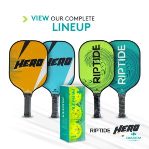 The Diadem RIPTIDE Pickleball Paddle in Diadem Teal colorway is the perfect option for pickleball players. Perfectly balanced and easy to swing, you will be able to enjoy the game of pickleball right away. Choose between the true Diadem teal, or the electric yellow. The Riptide paddle uses HMT Fiber, giving power to your baseline strokes and put away as well as a rough surface to get added spin. The thick bumper prevents any scratches to the paddle surface as you learn the dos and don’ts of the game. A 55in/12mm thickness with an 8mm honeycomb cell interior structure mimics our high-end Icon paddles for added power. The next pickleball champion starts here.