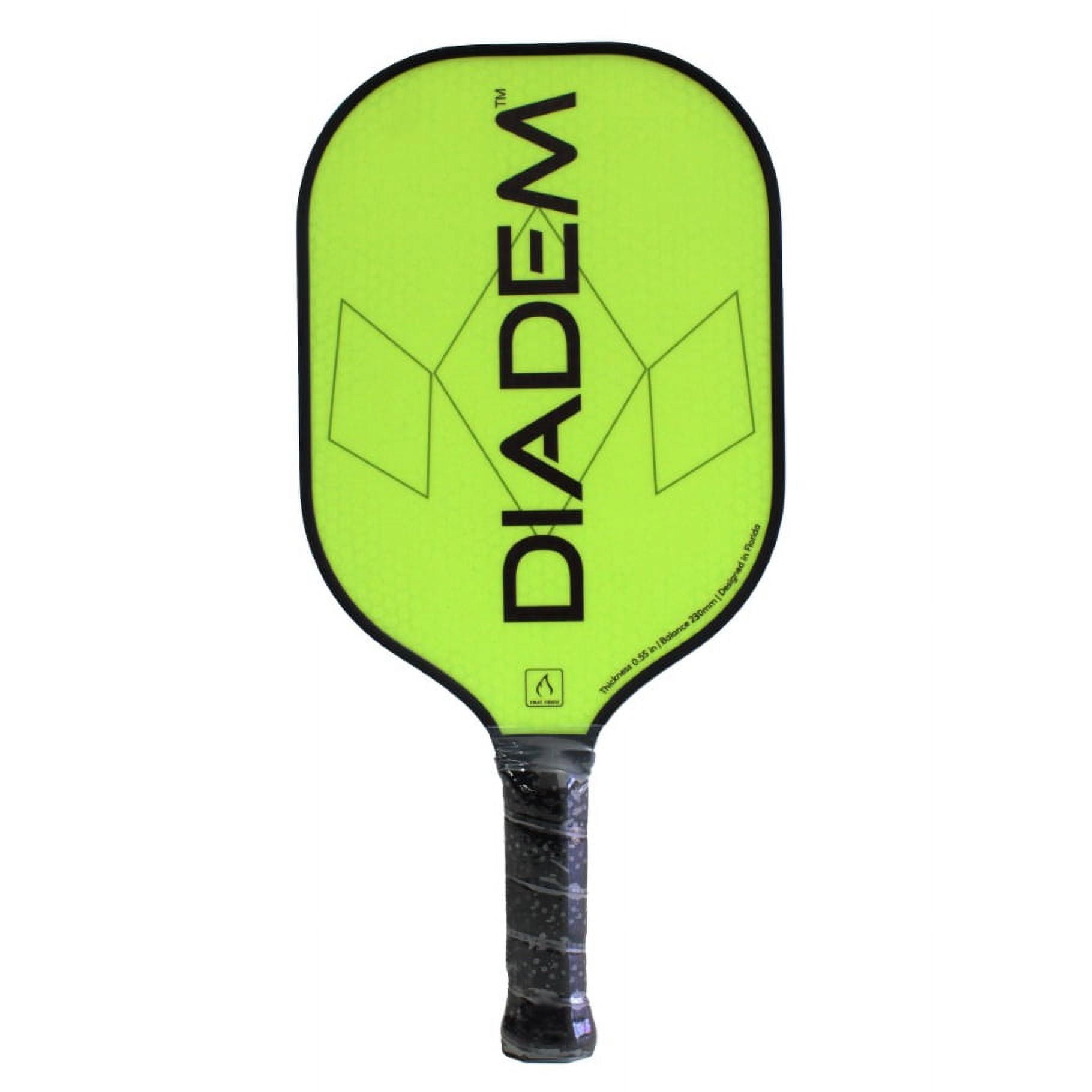 Diadem Sports Pickleball Riptide HMT Fiber Pickleball Paddle in Yellow for All Ages and Skill Levels Designed for ages 5-105 Made for pickleball players by pickleball players Paddle Weight: 7.6 oz Paddle Face Material: HMT Fiber A rough texture surface helps create extra spin in your shots Paddle Shape: Standard Paddle Length: 16″ Paddle Width: 7.6″ Grip Thickness: Standard – 4 1/4 Grip Length: 5″ Ideal and budget friendly for beginner to intermediate players A perfect blend of hot melt glass fiber to add power to your strokes Rough Edge Guard provides durable play for years to come USAPA Approved