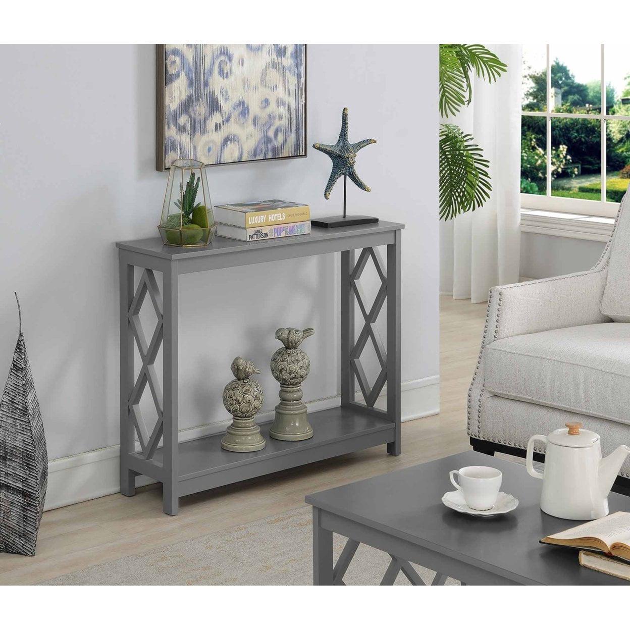 Diamond Console Table, Gray Ready to transform your living room decor With the Diamond Console Table by Convenience Concepts, the transformation is inevitable. The noteworthy design combining a clean line silhouette with stunning diamond cut outs that adorn each of the frames is a chic contemporary piece of art. As beautiful as this piece may be, it does not fall short on functionality. Features two ample shelves for all your favorite collectibles or entryway essentials. Crafted from particle board that is finished with a rich melamine veneer and non lead based paint, the shelves are easy to clean. Frames and legs are made from MDF that is finished with a non lead based, making them sturdy and long lasting. The limitless versatility allows you to place this two tier unit anywhere in your home, from your entryway to your den. Witness as this accent piece revitalizes your decor today and enjoy its simple assembly that is worth every step! Need the whole collection You are in luck, as the Diamond Collection offers all must have pieces for your home. From console tables to end tables, it has it all. Available in multiple finishes to ensure the right fit for you. Each piece sold separately.