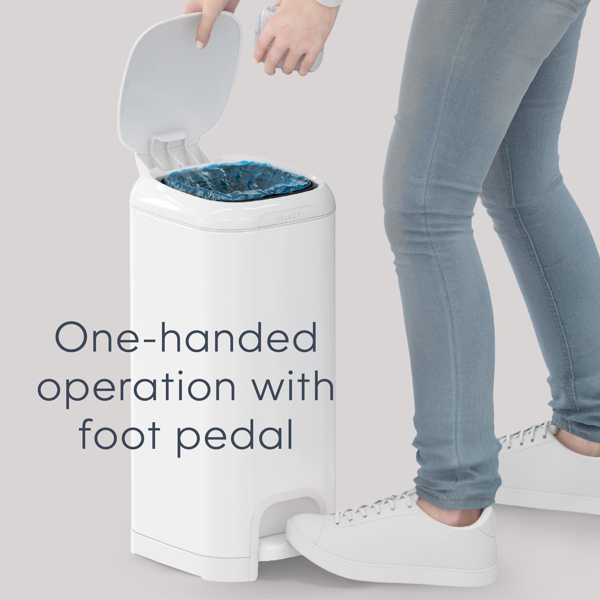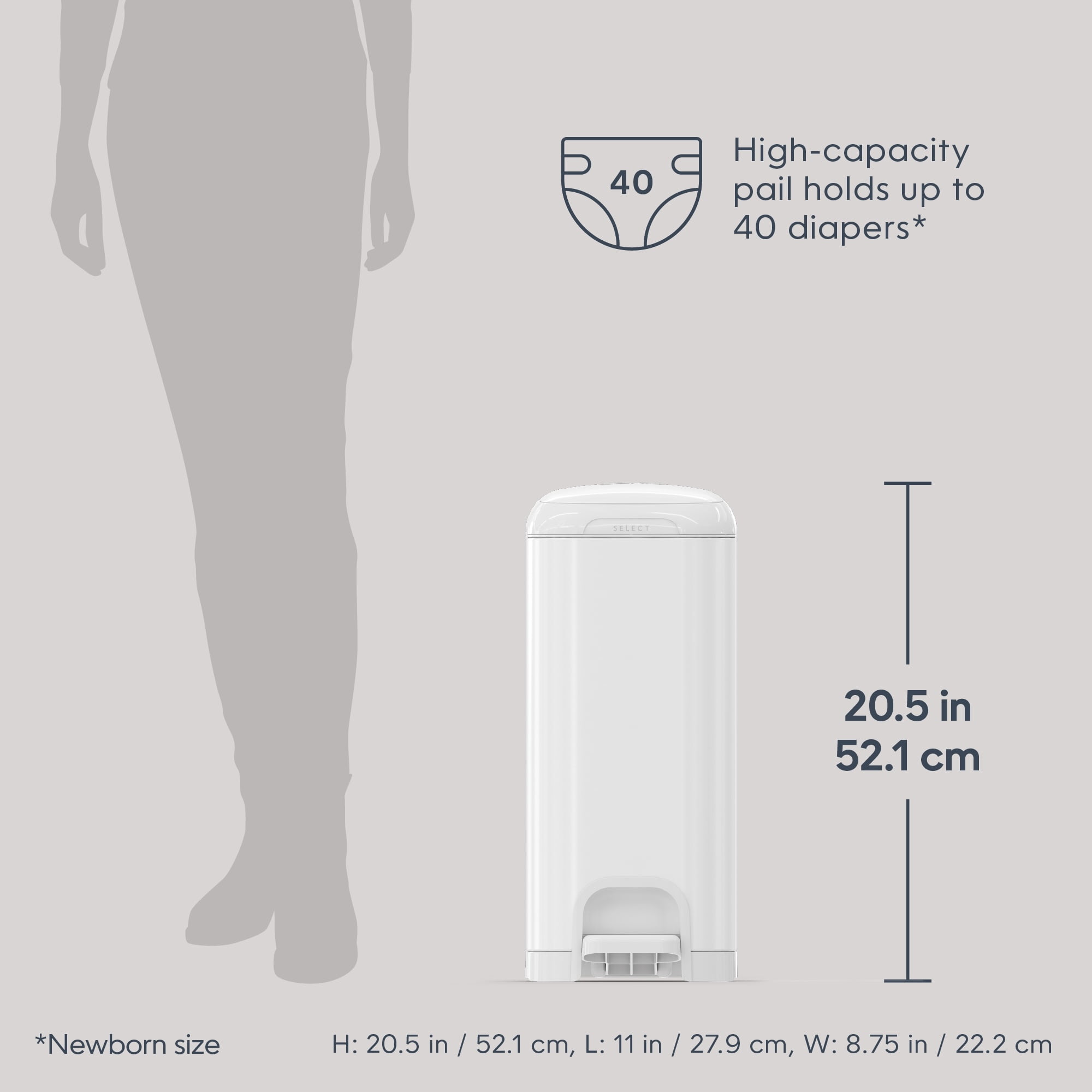 Diaper Genie Select Gift Set,White,Stainless Steel,1 Diaper Pail,2 Jumbo Square Refills-1620 Count, Infant Keep your nursery smelling fresh – holds up to 40 newborn diapers and features a Push N Lock clamp that helps prevent odors from escaping for ultimate odor control. Durable & Ultimate convenience – made of stainless steel and equipped with a foot pedal for easy one-handed operation. Soft-closing lid – less noise in the nursery while baby is sleeping. Product Length: 11.93 in Product Height: 22.05 in Product Width: 11.1 in