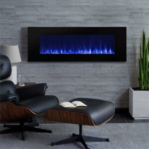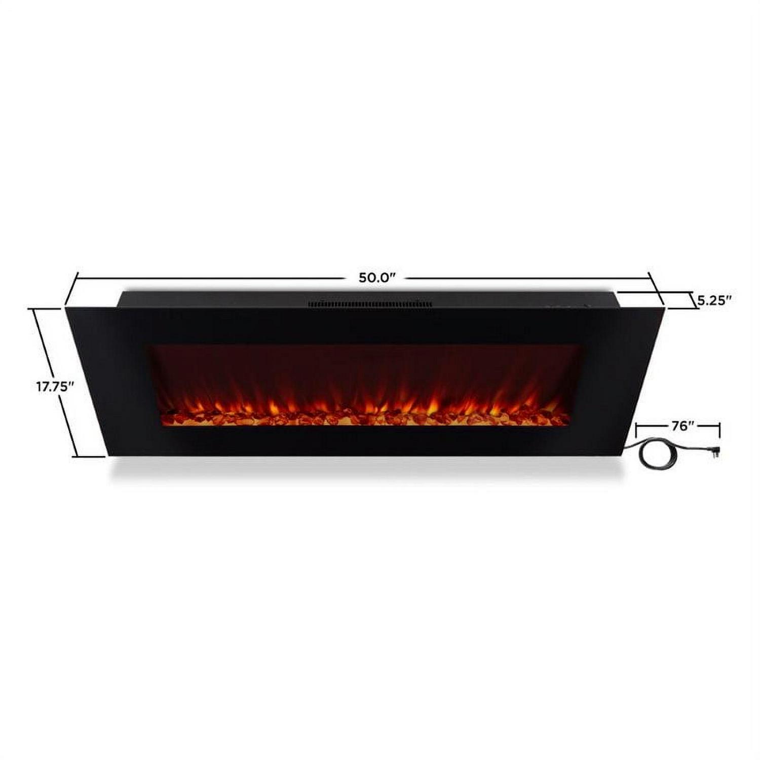 The DiNatale 50 wall-mounted fireplace turns fire into stylish and sophisticated art for any room in your home. The realistic flames flicker and dance on a bed of brilliant glass adding stunning elegance to your walls. A remote control is provided for convenient operation. Dual heat settings allow you to adjust the warmth or simply turn off the heat and enjoy the striking ambience of the flames. Enjoy the option of displaying either orange or blue flames with adjustable brightness levels. UL rated, simply plug into any standard electrical outlet without the need for professional installation or an electrician.