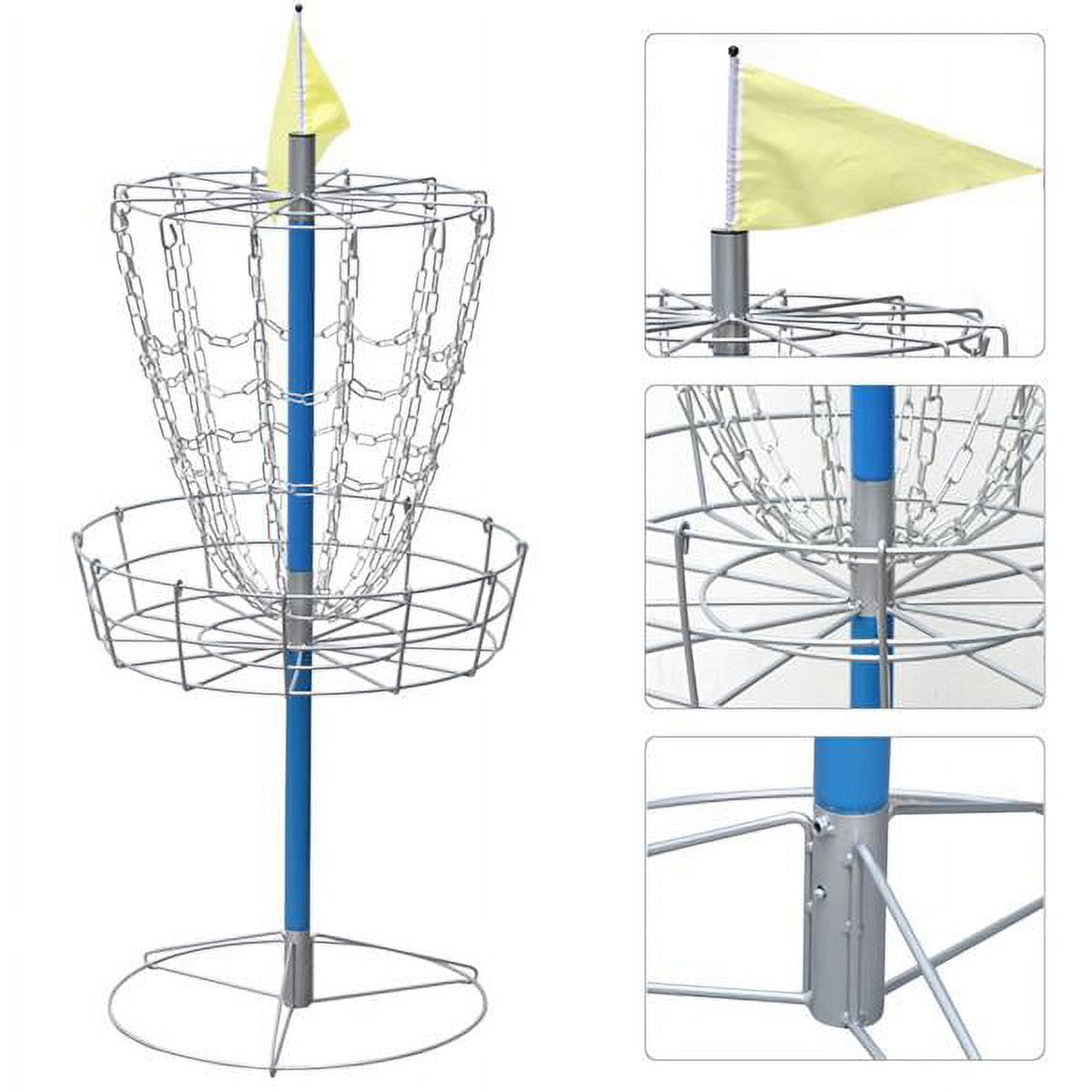 HIGH QUALITY: This disc golf basket is constructed of fully painted metal frame and chains, rust and weather resistant basket is durable enough to withstand sun, wind, rain and snow STABLE & STURDY: Solid basket contains 12 strands of heavy duty chain for better catching; welded joints and big base frame reinforce the stability of this basket, no need to worry about tipping over by the hit from the disc or wind PORTABLE & EASY STORAGE: Built in a lightweight yet sturdy structure, convenient to move and transport, no need to attach to ground; can be simply disassembled in to a flat and compact size for storage when not in use THOUGHTFUL DESIGN: Features with a 25.7” basket for catching and storing the disc; comes with an eye-catching yellow flag to help improve the accuracy of your throw PRACTICAL: This regular size disc golf basket is ideal for both starters and disc golf lovers to use in the park, back yard, school yard, basketball gym and so on; definitely a great accessory to practice and improve your short game EASY ASSEMBLY: Simple structured basket only takes a few minutes to assemble and disassemble under the detailed instructions