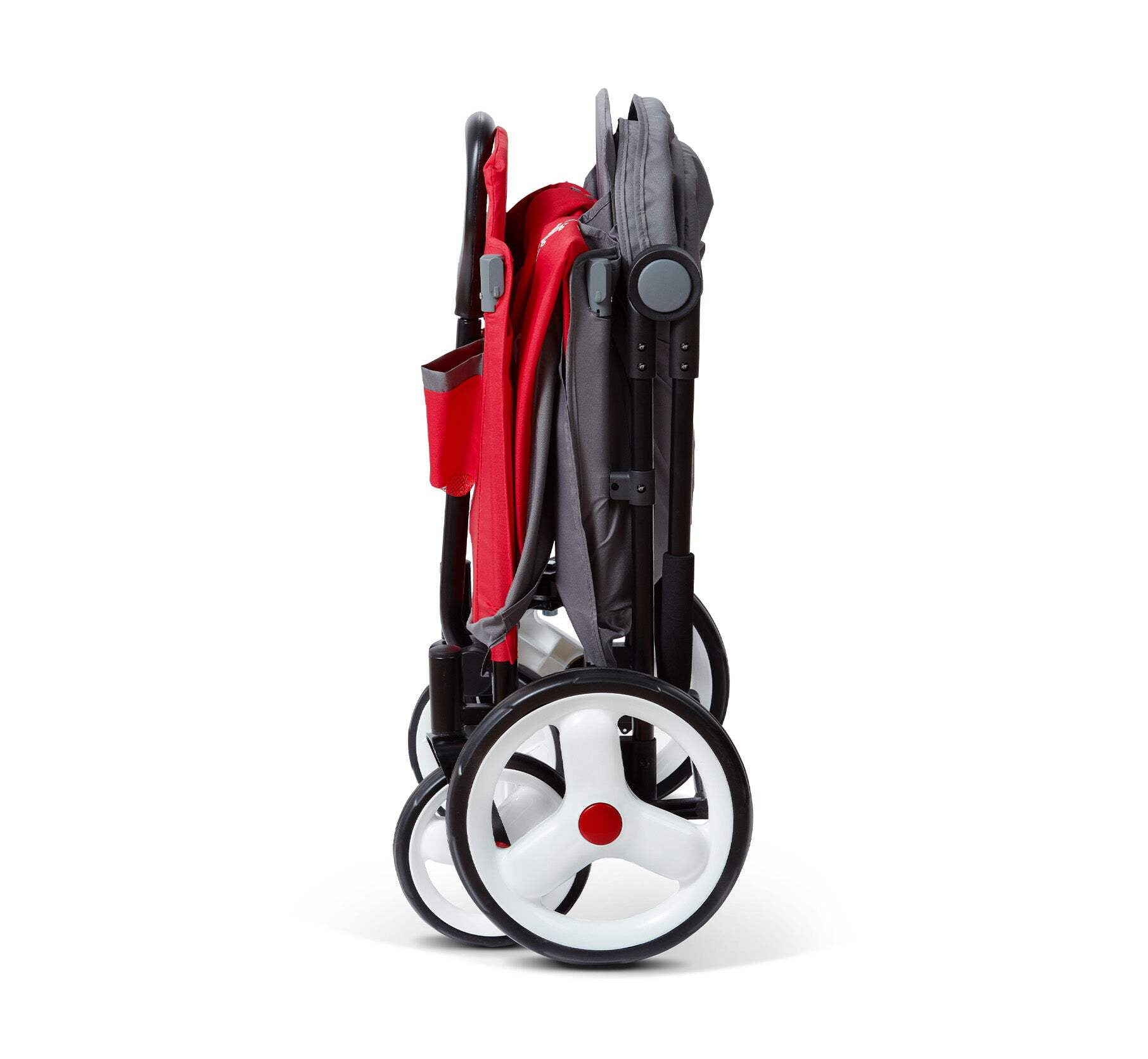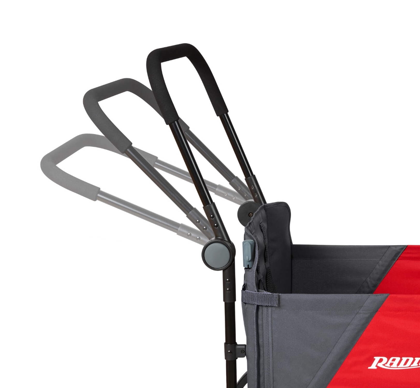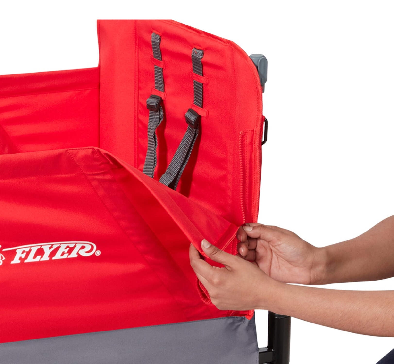 Convenient push or pull steering One hand fold; folds flat for easy storage 5-point safety harnesses and rear brake to keep your child safe Two adjustable UV protection canopies, one peek-a-boo window Front caster wheels for nimble steering and large, 12” easy push rear wheels Rear brake for safety Two front cupholders Never Fall™ handle stays upright when not in use Recommended for kids 1 year and up Maximum weight capacity 120 lbs. Assembled dimensions with push handle: 51″ L x 19″ W x 11″ H Wagon body dimensions: 33″ L x 19″W x 11″ H Interior dimensions: 31″ L x 19 W x 11″H Assembled weight: 31.53 lbs. If you have any questions regarding your product, please contact Radio Flyer Customer Service