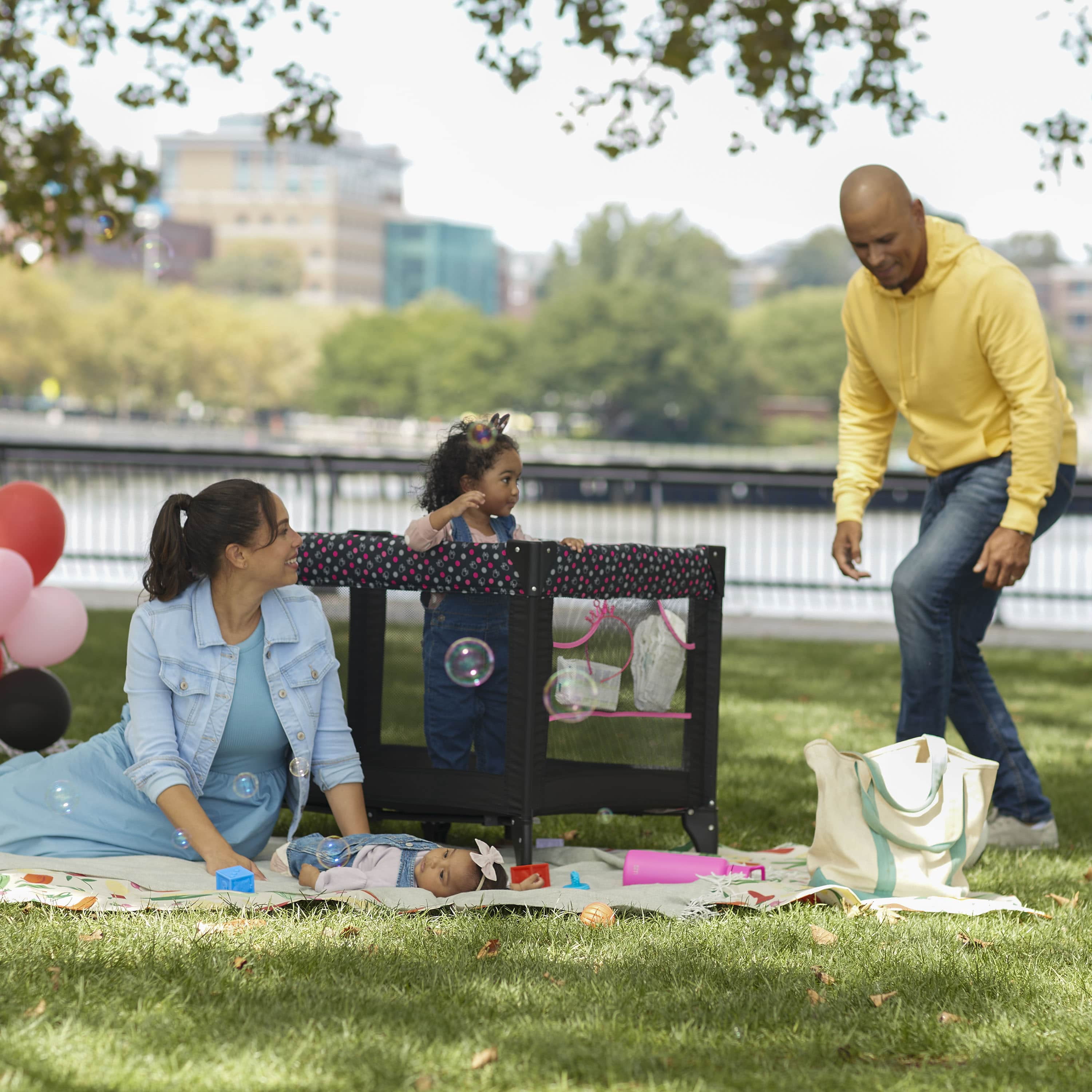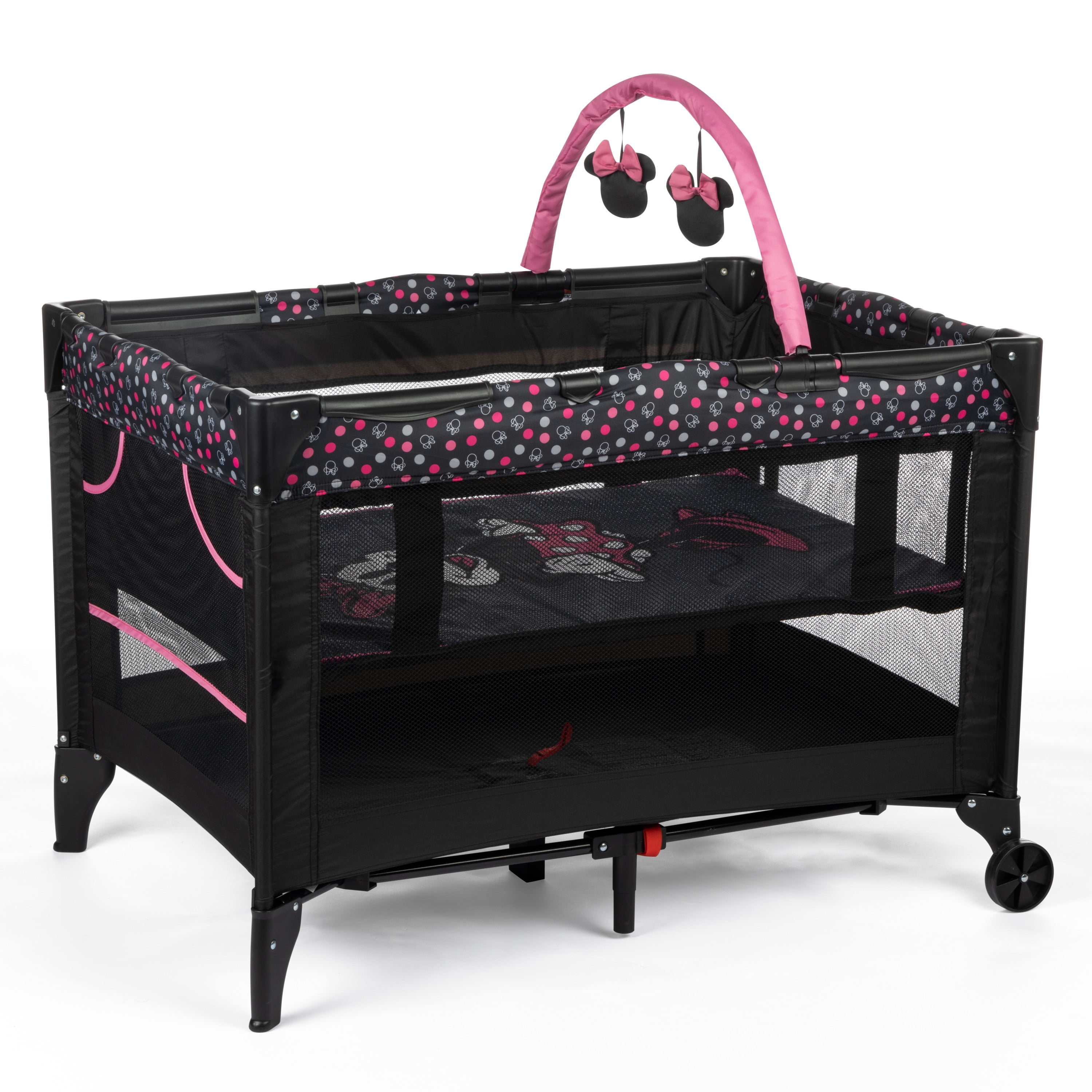 Disney Baby 3D Ultra Baby Play Yard with Bassinet and Toy Bar, Modern Minnie Full size play yard Full size bassinet Quick and compact fold for easy travel Easy to store and transport with carry bag 2 built-in wheels for mobility Breathable mesh sides allow visibility Detachable toy bar with 2 Disney-themed toys Disney-inspired pattern and colors Spacious area for naps and play Assembled Weight: 19.4 lb Color / Fashion: Modern Minnie Designed with a firm, flat sleeping surface that meets the Consumer Product Safety Commission’s recommendations for safe sleep Bassinet mode is suitable for babies up to 15 lbs., or when they begin to push themselves up on their hands and knees Play yard mode is suitable for children up 35”, or when they can climb out