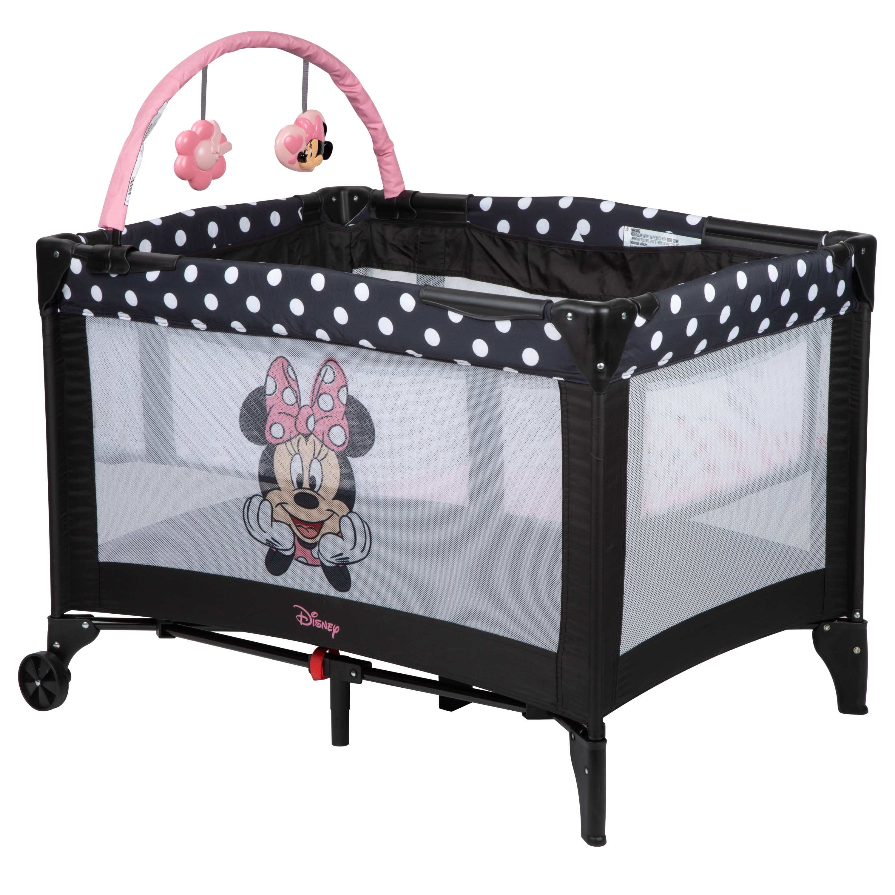 Disney Baby 3D Ultra Baby Play Yard with Bassinet and Toy Bar, Peeking Minnie Full size play yard Full size bassinet Entertaining toy bar with two toys Minnie graphic mesh side Quick and compact fold for easy travel Spacious area for naps and play Easy to store and transport with carry bag Assembled Weight: 19.4 lb Color Category: Black Designed with a firm, flat sleeping surface that meets the Consumer Product Safety Commission’s recommendations for safe sleep