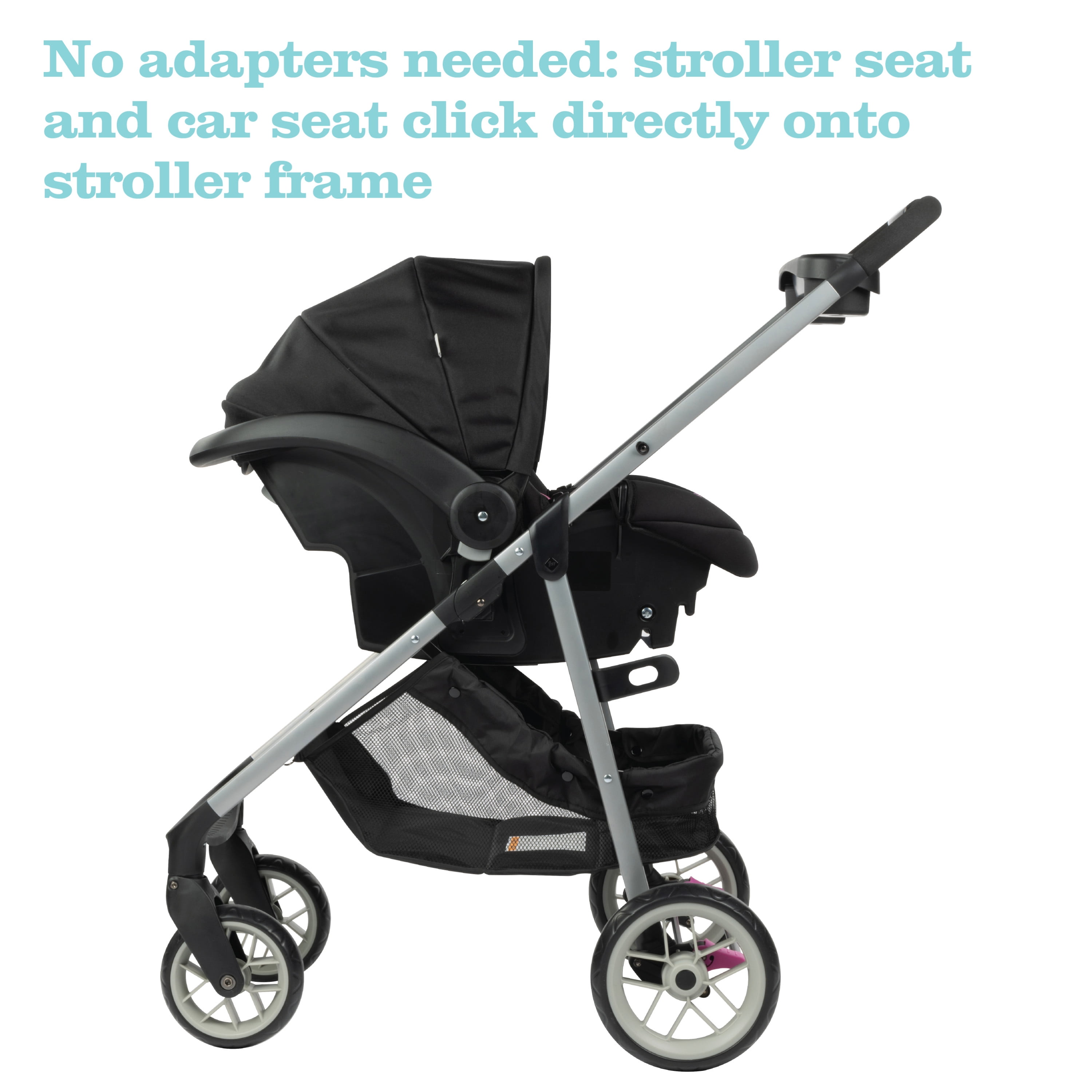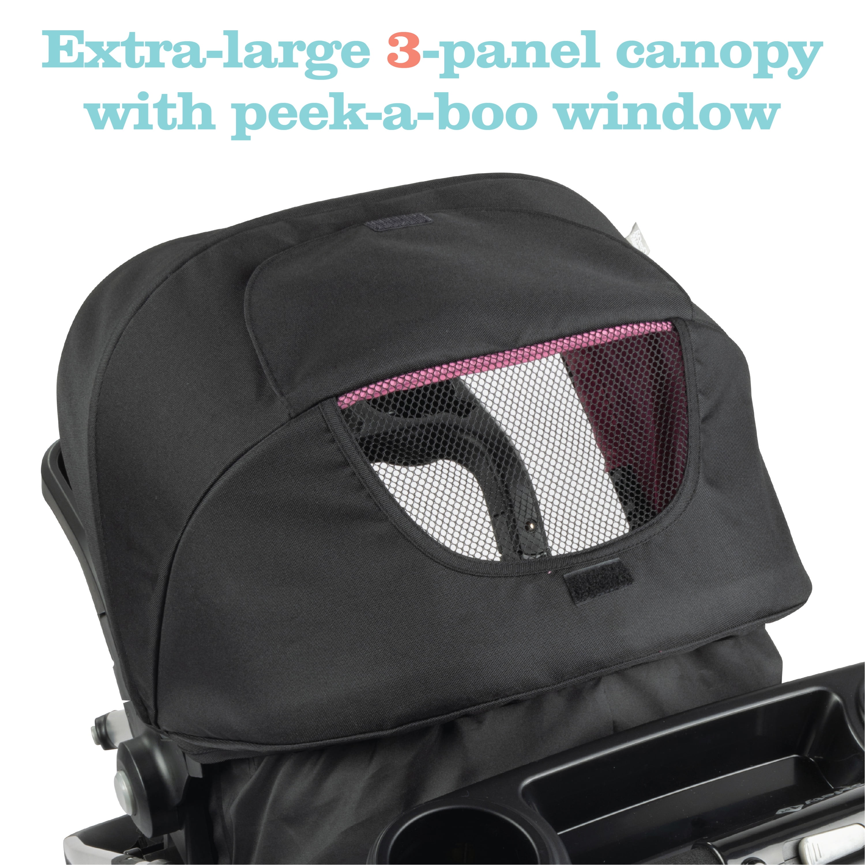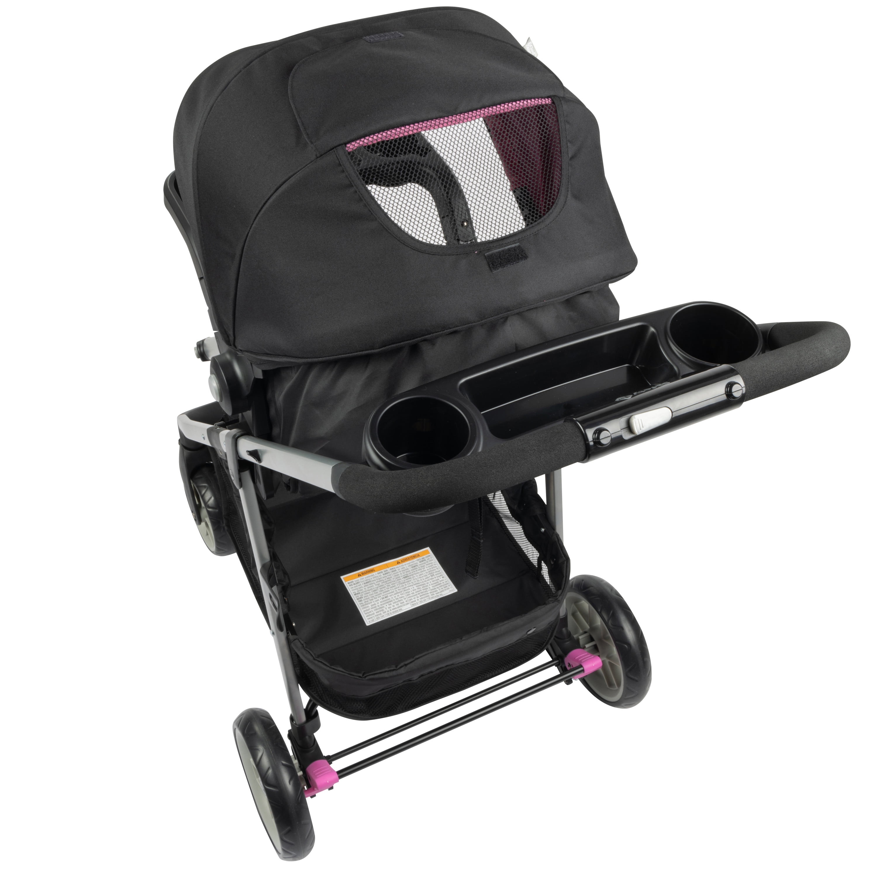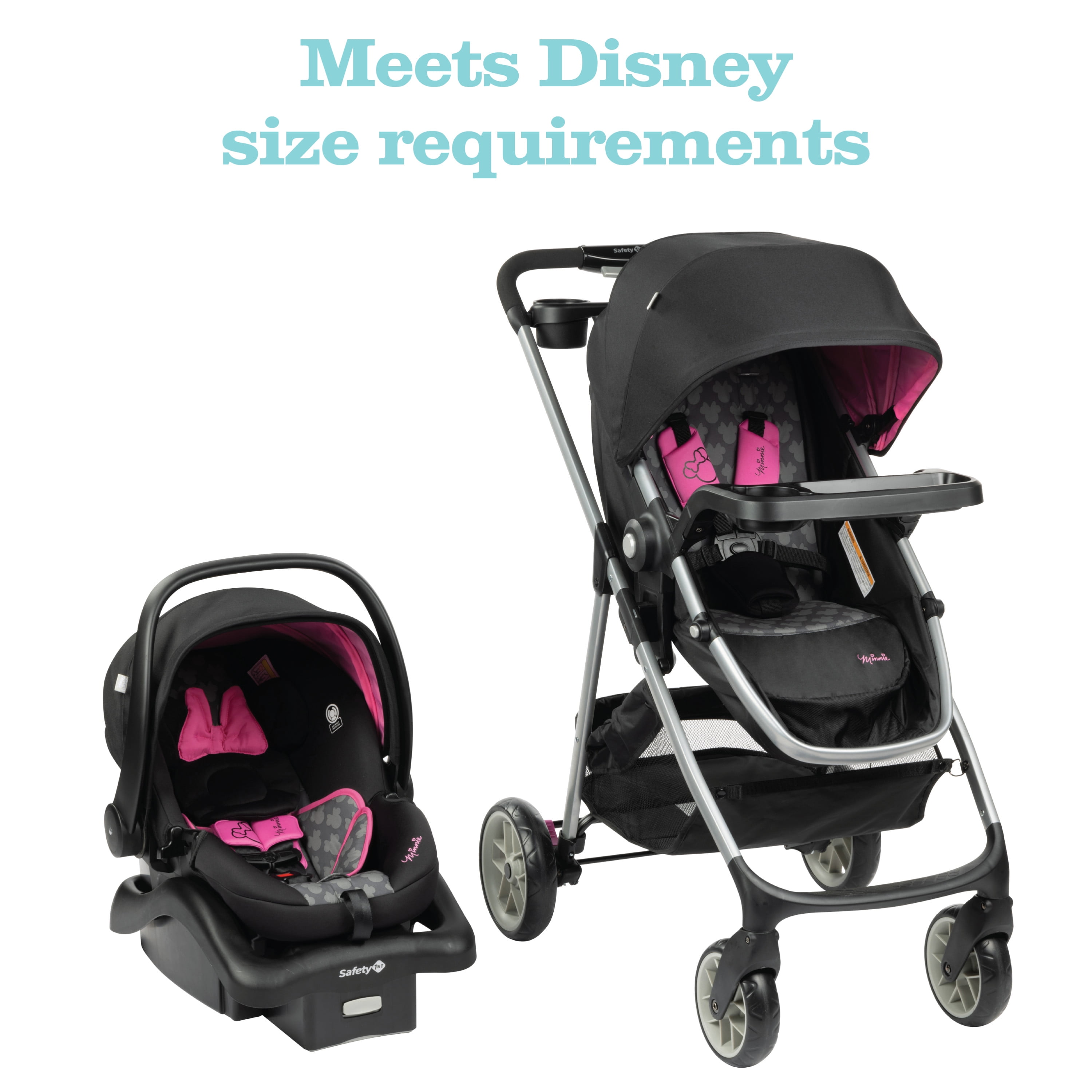 Designed for Disney fans––baby to big kid 8 easy strolling options: baby carriage, infant car seat carrier, travel system, and toddler stroller. Each mode can be forward- or rear-facing. No adapters needed: stroller seat and car seat click directly onto stroller frame Extra-large, 3-panel stroller canopy with a peek-a-boo window Extra-large storage basket with easy access Car seat weight capacity from 4–30 lbs. Car Seat is lightweight and easy-to-carry car seat at under 8 lbs. Smooth maneuvering with all-wheel suspension and large, sturdy tires Stroller folds easily with 1 hand, and stands on its own Full parent tray includes 2 large cup holders Full-sized child tray with cup holder that fits most sizes of sippy cup Step-up bar, and swing-away tray allow independent toddlers to climb into stroller by themselves Soft, comfy Disney-inspired brushed fabrics and padding on the seat Stroller seat is designed to recline for comfort in both directions Meets Disney Park size requirements Actual fit may vary. Not all children will comfortably fit in the seat for the full weight and height ranges listed.