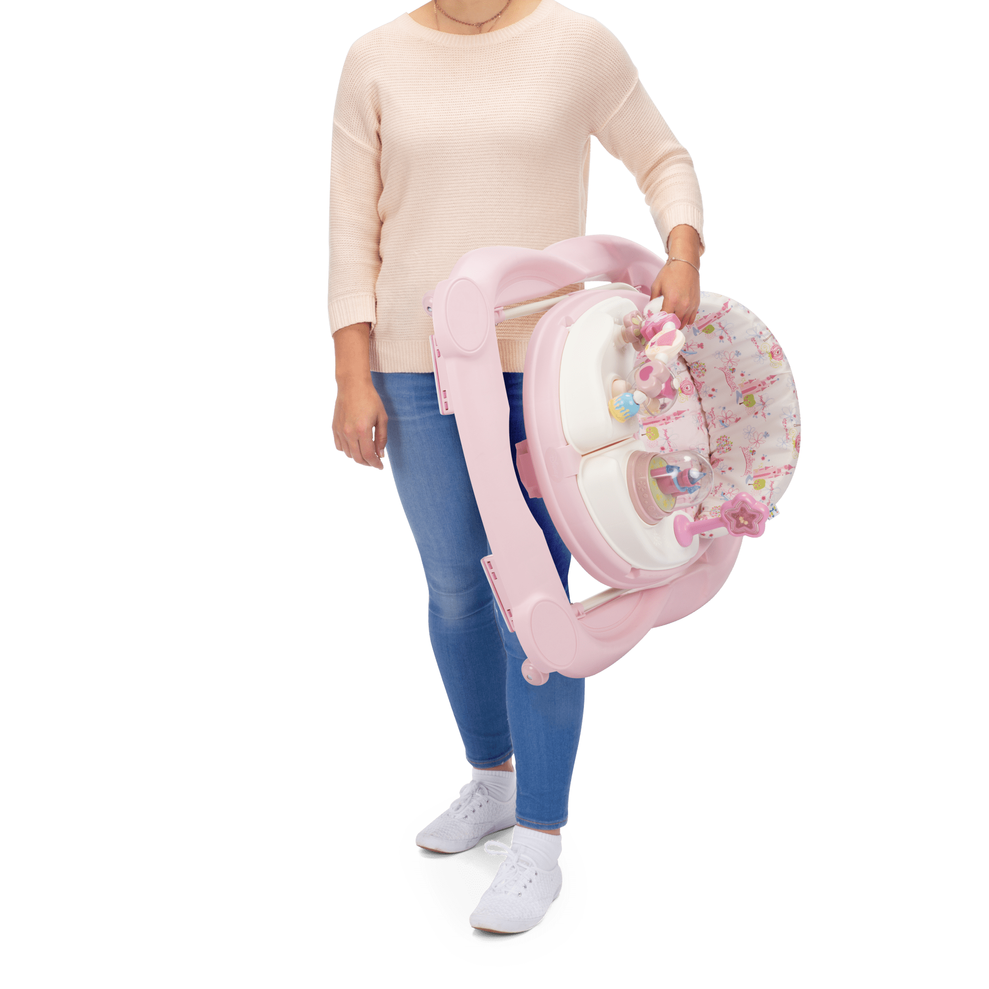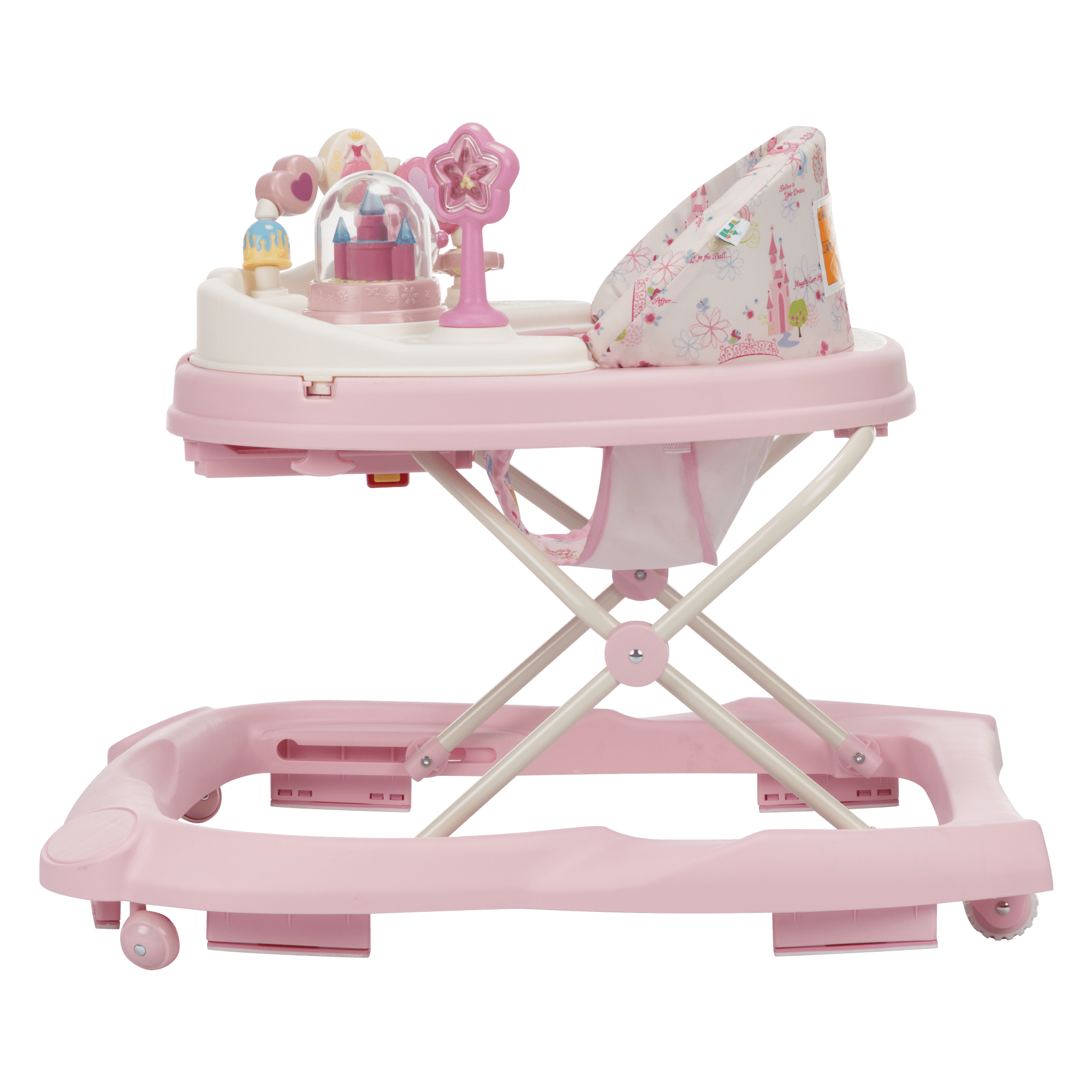 Engaging sounds and lights 2 swing-open activity trays with princess-themed toys Oversized snack/play tray Machine washable padded seat 3-position height adjustment Grip strips reduce movement on uneven surfaces Sturdy wheels work on floors or carpets Baby must be able to sit up unassisted before using this product Holds child up to 30 lbs. or 32″ Use only for a child who can hold their head upright unassisted and who is not able to walk or climb out of the product.