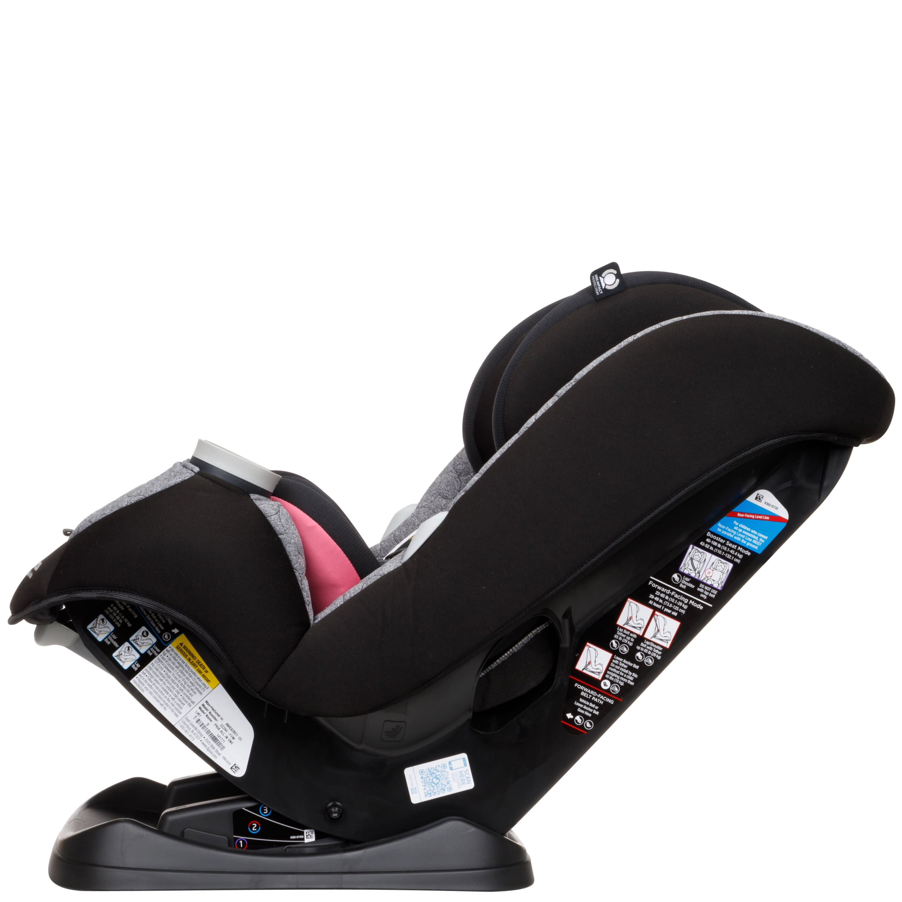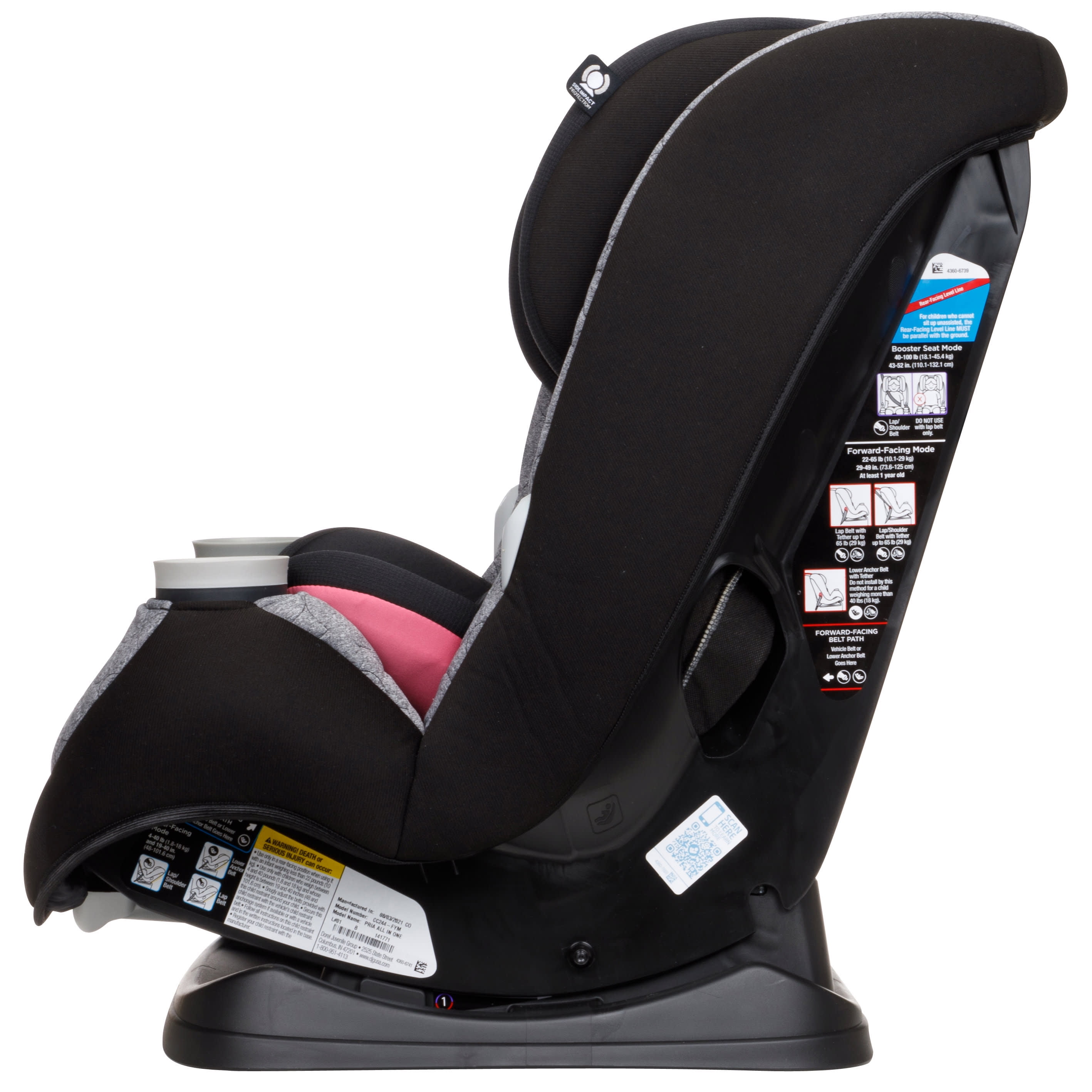 All-in-One seating system: rear-facing, from 4-40 pounds; forward-facing to 65 pounds; and up to 100 pounds in booster mode Side impact protection with GCell® protects your child’s head where it’s needed most in a side impact crash In and Out harness holders keep straps out of the way when buckling One click LATCH system, with easy click-in for better installation QuickFit shoulder harness automatically raises the harness and headrest height Premium fabrics and padding provide the most comfort for your child Removable wedge for older babies, wedge to keep smaller babies (starting at 4 lbs.) snug and secure Removable infant head pillow and lumbar cushion provide extra support Seat pad and harness covers are both machine washable and dryer safe 3-position rear-facing adjustment, making it easier and faster to correctly install 2 easy-to-remove and dishwasher safe cup holders