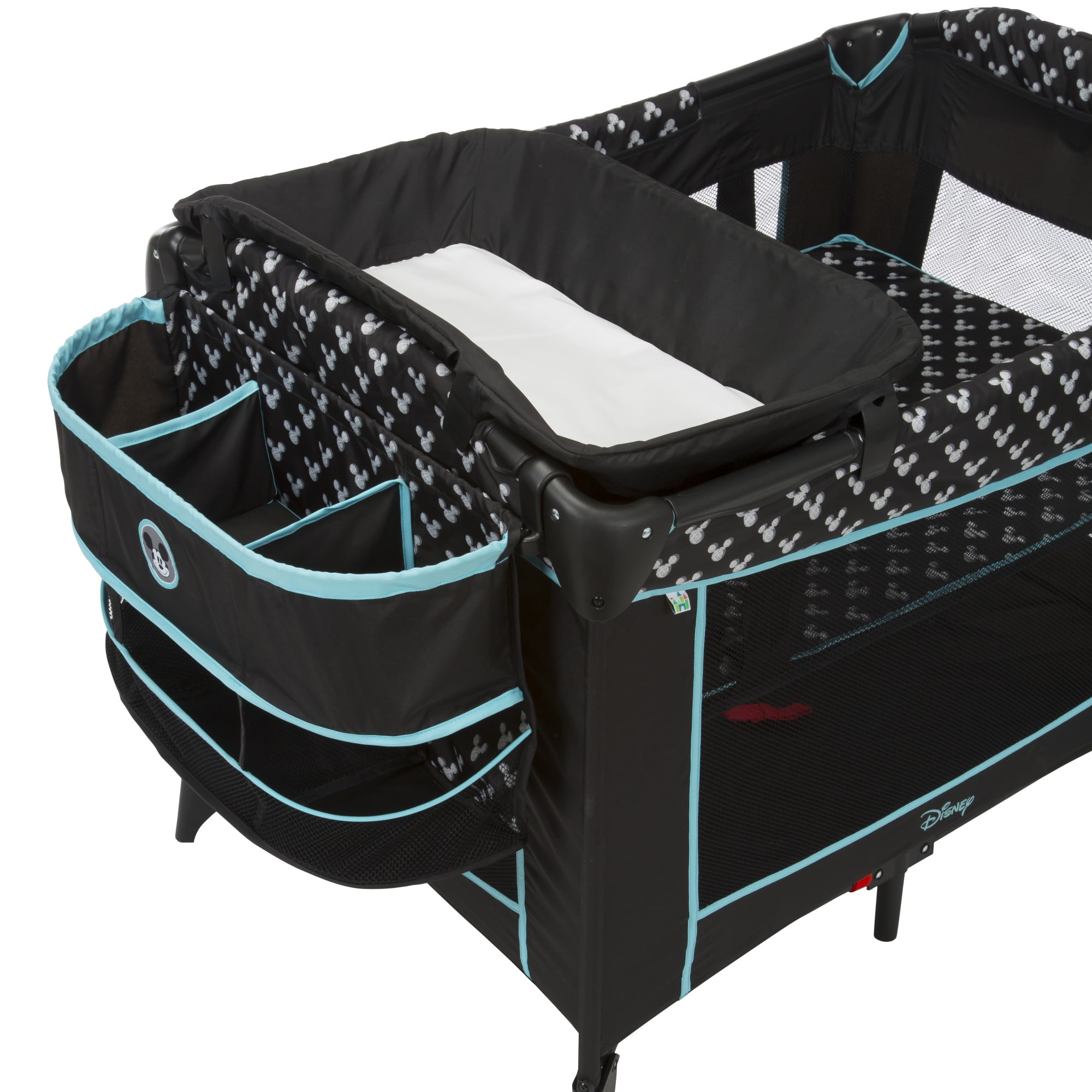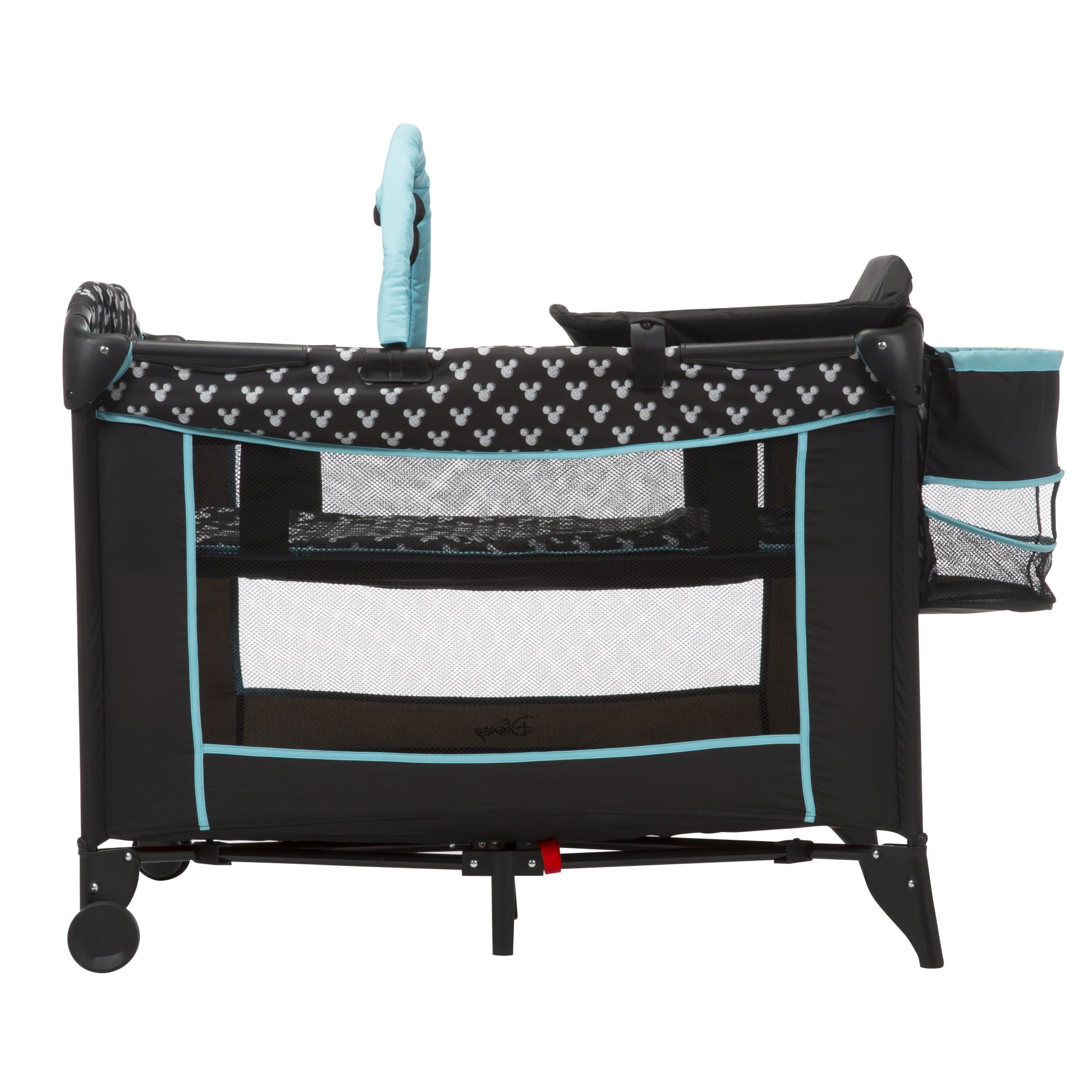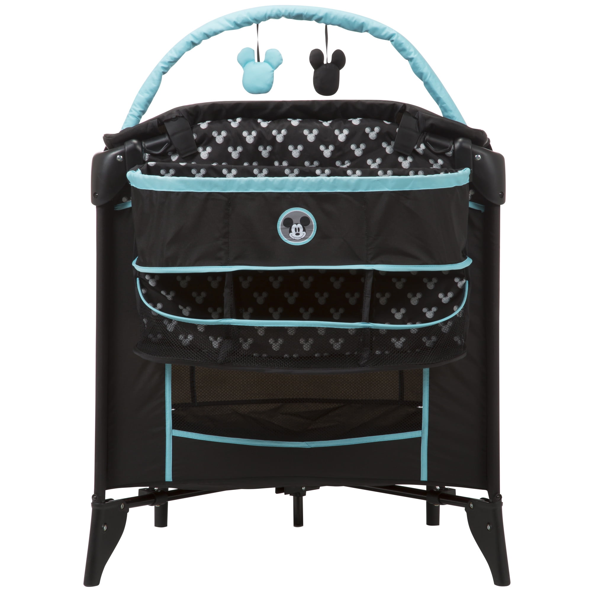 The perfect mini nursery, both at home and on the go, the Disney Baby Mickey Sweet Wonder Play Yard gives you multiple ways to keep baby happy and comfortable. The newborn bassinet is perfect for your resting baby and features open-view breathable mesh so you have a good view from anywhere in the room. Two adorable Disney toys swing on the detachable toy bar to delight and amuse your own little wonder while they’re awake. The changer is easy to clean thanks to a wipeable pad and includes a deluxe organizer that lets you keep changing necessities easily within reach. There are two wheels on the play yard, for easy room to room mobility. For longer trips, the included carry bag is great for packing it up and taking this play yard on the go. This product is designed with a firm, flat sleeping surface that meets the Consumer Product Safety Commission’s recommendations for safe sleep. Disney Baby offers today’s parents like you everything you need to bond with baby at every stage. The Disney Baby line includes essentials for Apparel, Nursery, On the Go, Bathtime, Feeding, Discovery and Celebration. We work with the best brands in the infant industry to bring you products to make your time with baby magical.