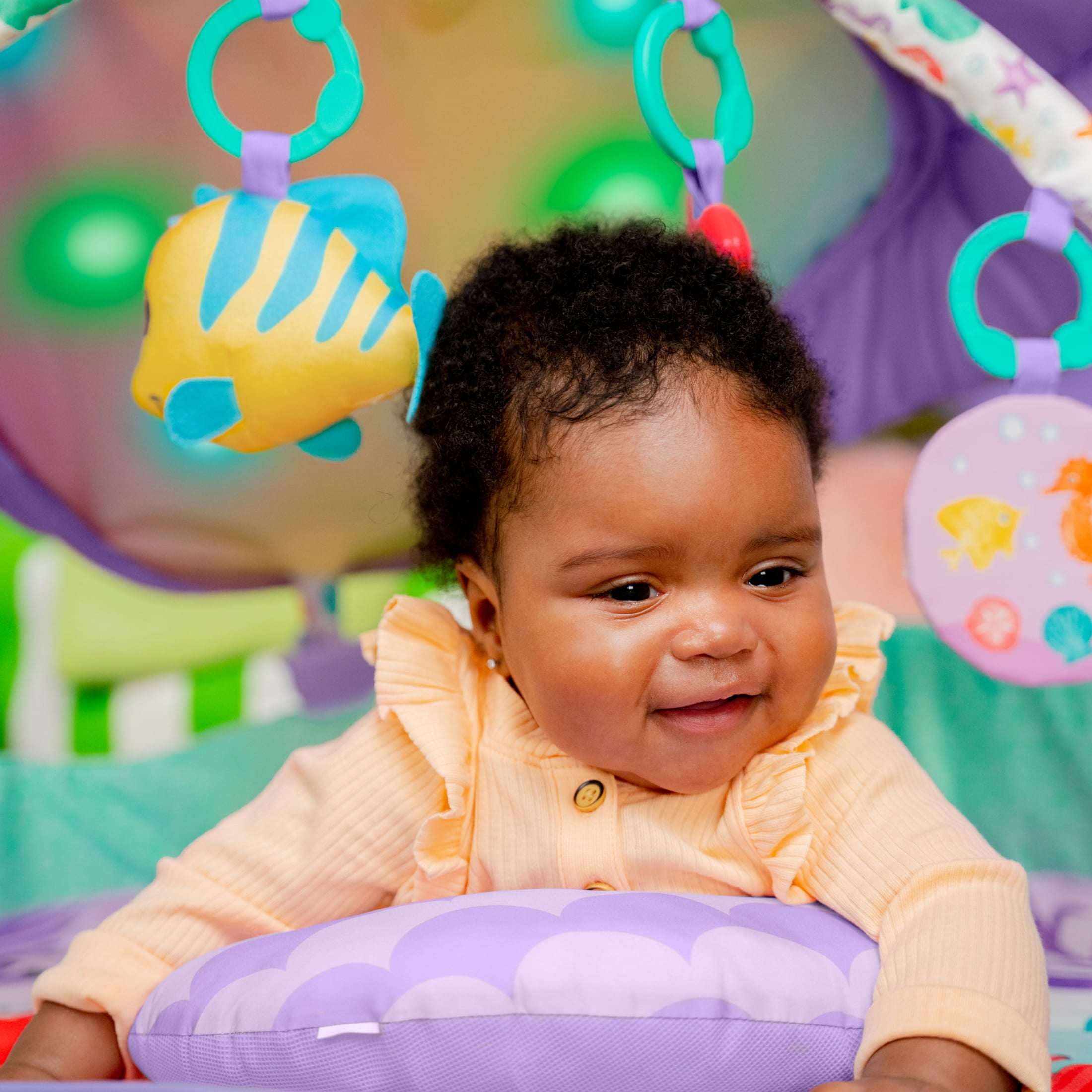 Bright Starts Disney Baby The Little Mermaid Baby Activity Gym with Tummy Time Pillow, Throw an underwater party with the Disney The Little Mermaid Ariel seashell canopy gym from Bright Starts and Disney Baby! Join Ariel, Sebastian, Flounder, and more in a world of tropical melodies and twinkly ocean lights beneath a shimmery rainbow seashell. Baby will explore plenty of activities on this baby gym with toys that also detach for activity play on the go! From tummy time treasures to sit-and-play imagination, your newborn baby girl or boy will have lots to explore as they grow. The purple prop pillow brings a coral reef to the baby’s playtime while giving the baby an extra boost for early tummy time sessions.
