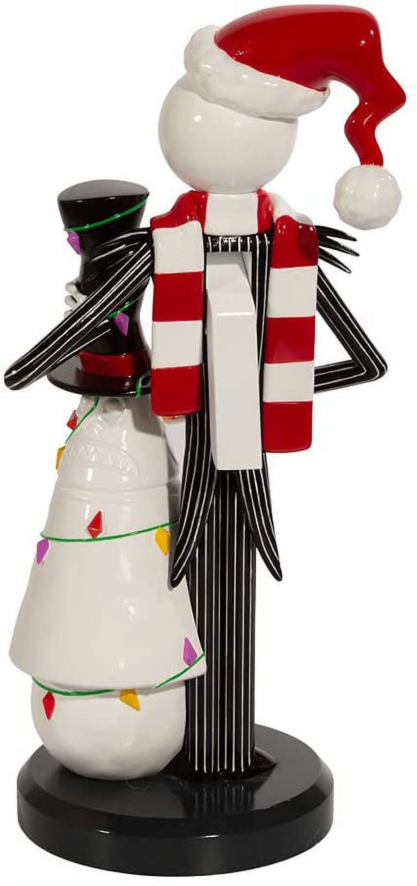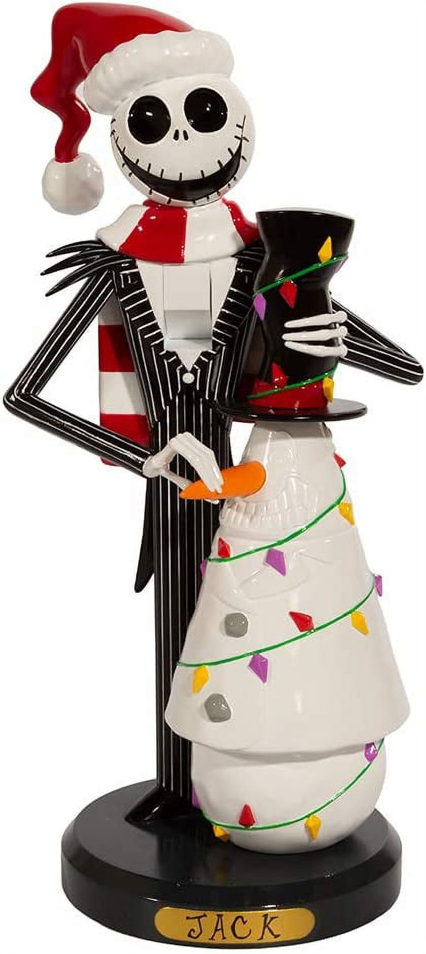This 11-Inch Jack Skellington with Snowman Nutcracker from Kurt Adler is a fun and festive addition to any holiday décor or nutcracker collection! Jack Skellington from “The Nightmare Before Christmas” is featured here in his red and white striped scarf and Santa hat. He is building a snowman resembling the Mayor of Halloween Town .