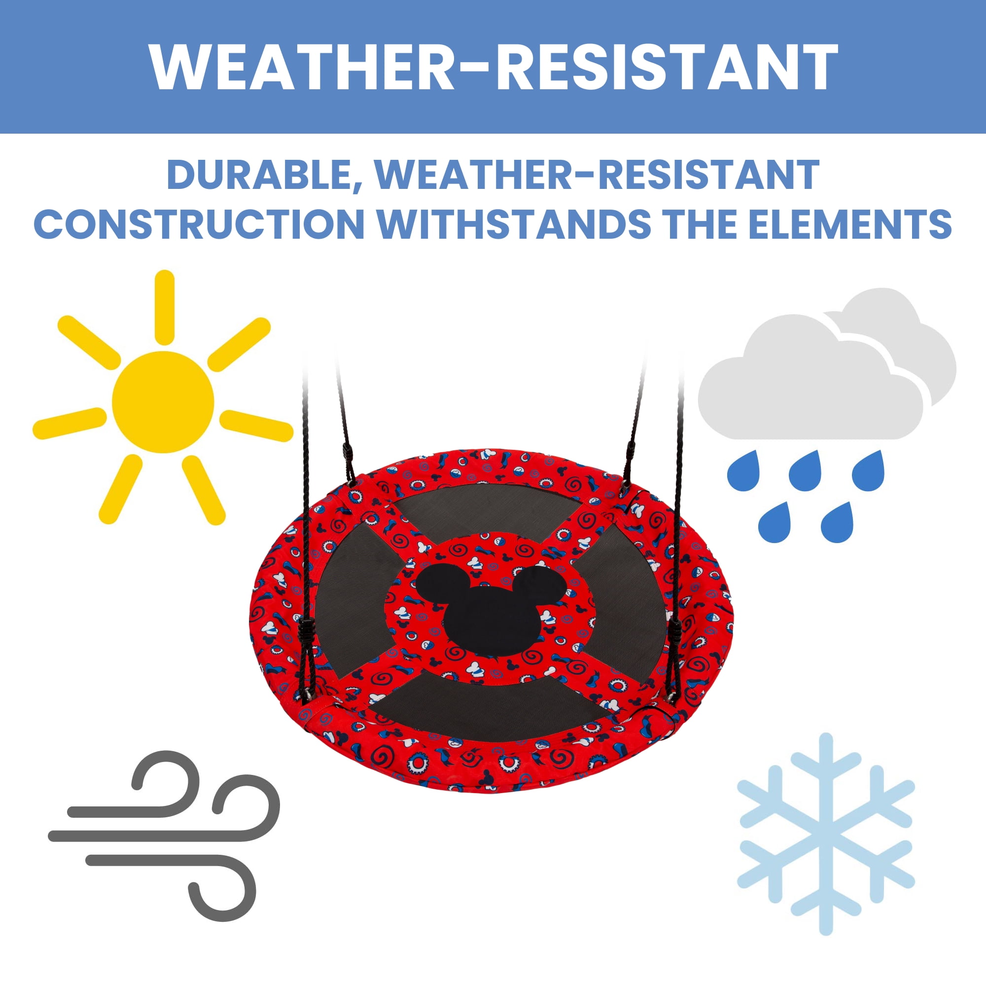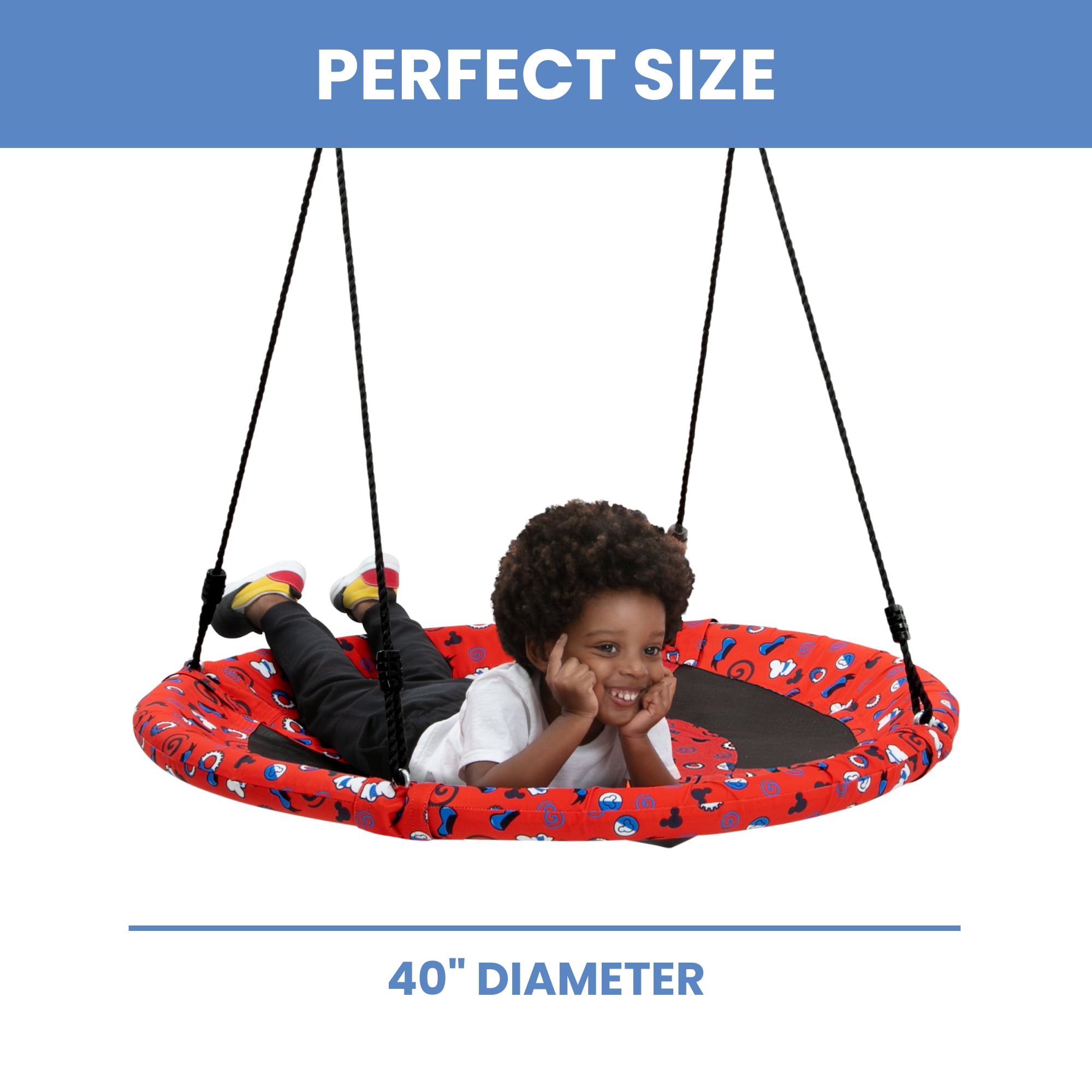 Oh boy! The Disney Mickey Mouse Saucer Swing for Kids by Delta Children brings swinging fun to your backyard. This saucer-shape swing can fit up to two children (250 pounds total) and is easy to hang just about anywhere, simply attach the included rope and hardware to your existing swing set or a tree. With swinging, spinning and soaring, this disc swing is the ideal toy to encourage gross motor skills, coordination, balance, cooperative play, outdoor play and exercise. And, don’t worry about leaving it outside, its weather-resistant construction can withstand years of outdoor use. Get it today and bring home the magic of Mickey Mouse and endless good times! This swing is recommended for ages 3+. Includes all hardware needed for installation.