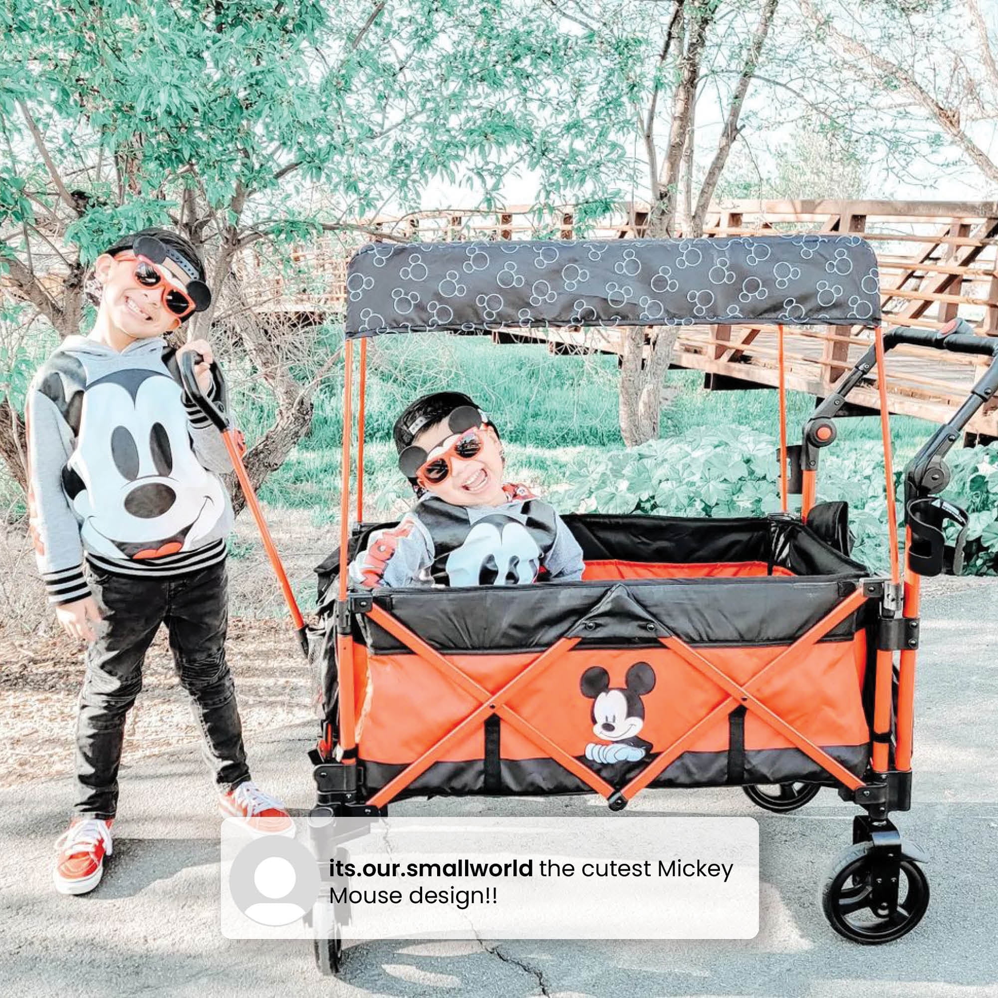 LARGE CAPACITY: This stroller wagon fits 2 children | Holds up to 110 lbs. (55 lbs. per seat) | Recommended for ages 9 months up to 55 lbs. (child must be able to sit up unassisted before use) CUTE MICKEY MOUSE DESIGN: Colorful graphics of Mickey make this stroller wagon a must-have for any mini Musketeer EASY TO DRIVE: Large, 8-inch wheels made from puncture-proof EVA airless foam make rough terrain or sandy beaches a breeze for this wagon | Swivel front wheels with brakes allow you to effortlessly turn and pivot ALL-WEATHER USE: Durable, weather-resistant fabric makes this wagon suitable for any outdoor occasion | The removable UV blocking canopy protects kids from the sun or rain | Perfect for any kind of indoor or outdoor activity TONS OF STORAGE: Removable center console with 2 cup holders and storage pocket allows kids to share snacks, toys and drinks | Outside pockets and parent cup holder provides additional storage DURABLE FRAME: Heavy-duty, rust-resistant steel frame ensures long-lasting use | Compact fold for easy transport and storage | Assembled dimensions: 51″D x 20″W x 47″H | Folded dimensions: 17″D x 13″W x 31.5″H | Weighs 36.3 lbs. ADJUSTABLE PULL/PUSH HANDLES: Pull handle length is adjustable for your comfort-minimum of 22.375”H to a maximum of 27.25”H | Push/pull handlebar on the other side also features several height positions
