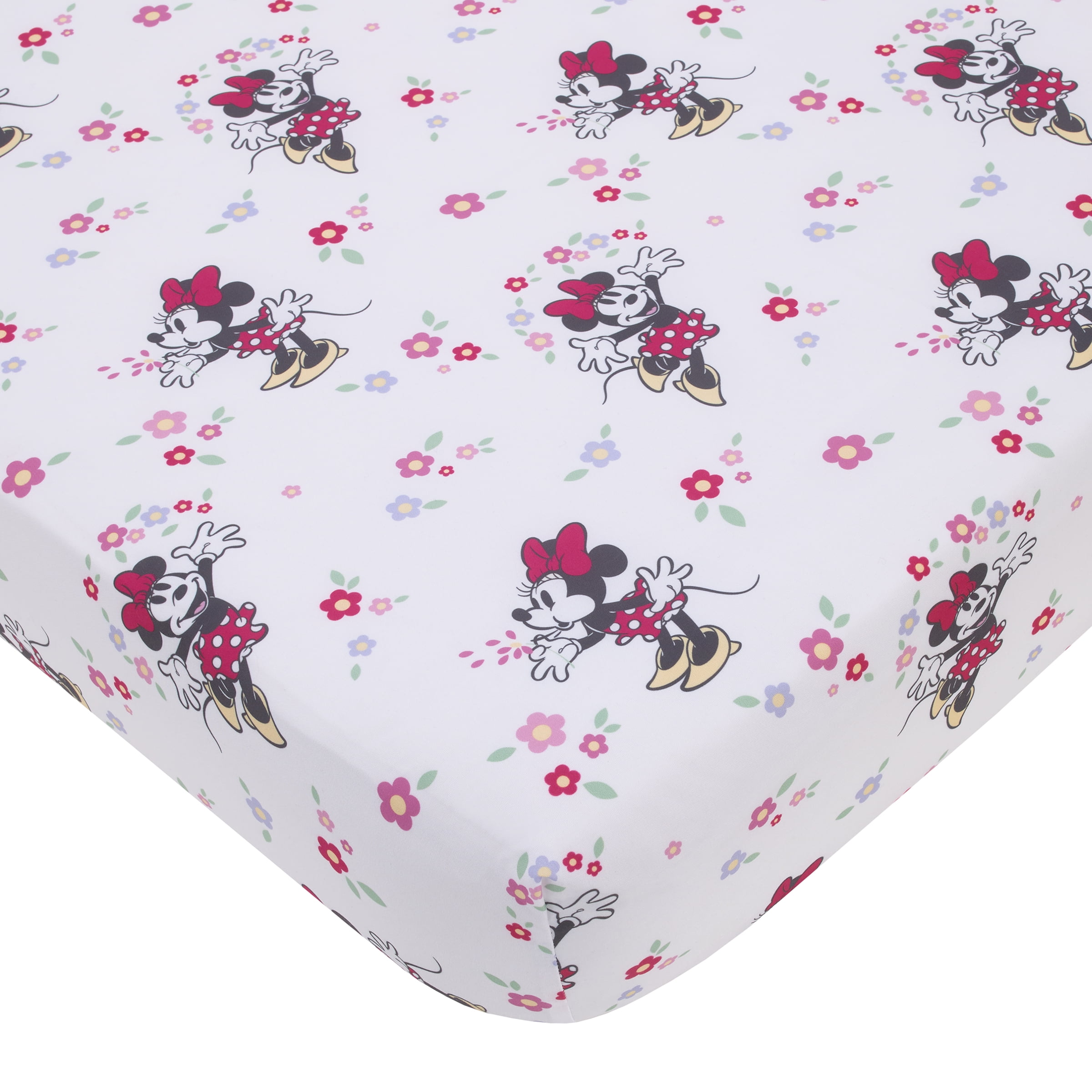 100% Polyester Includes a comforter, fitted crib sheet, and allover print blanket The adorable fitted crib sheet is fully elasticized for a safe and snug fit Design feature Disney Minnie Mouse