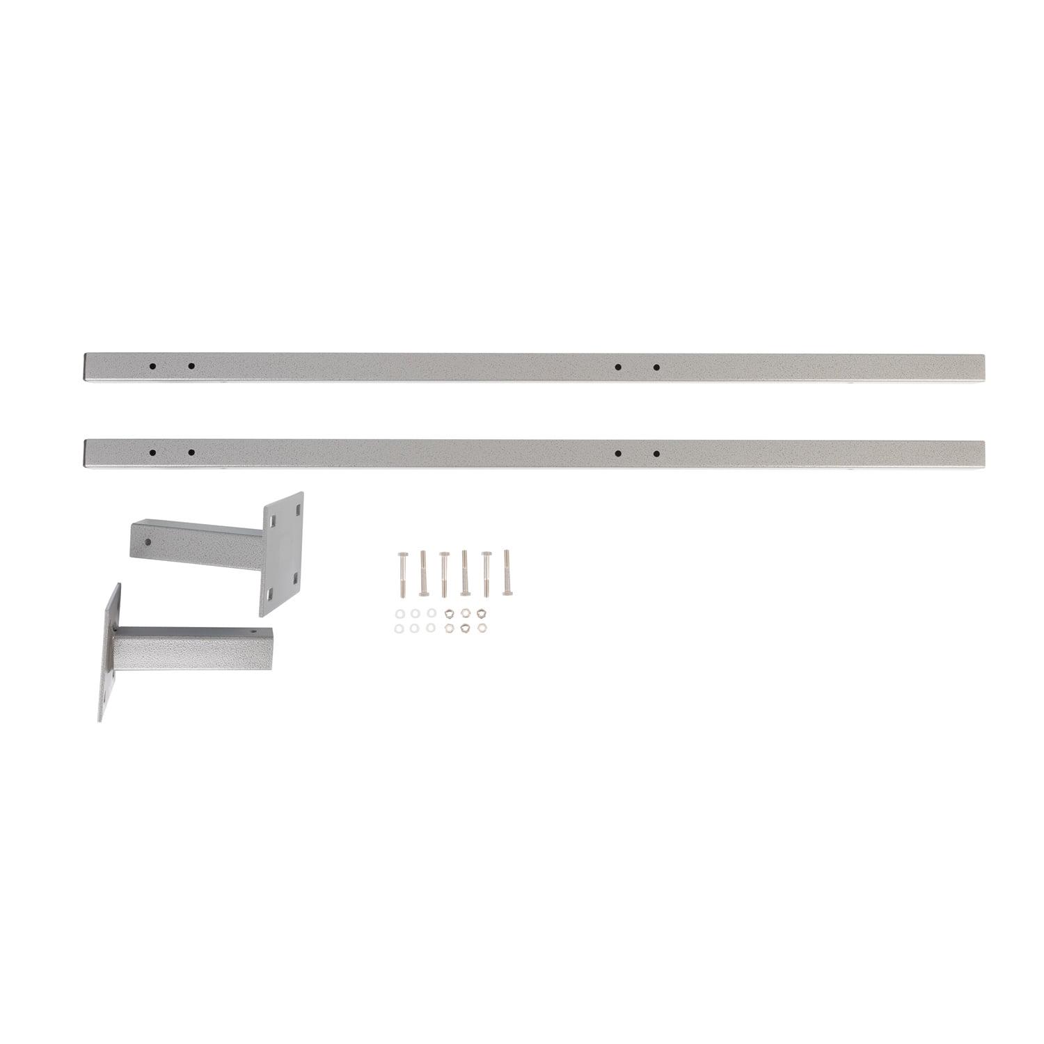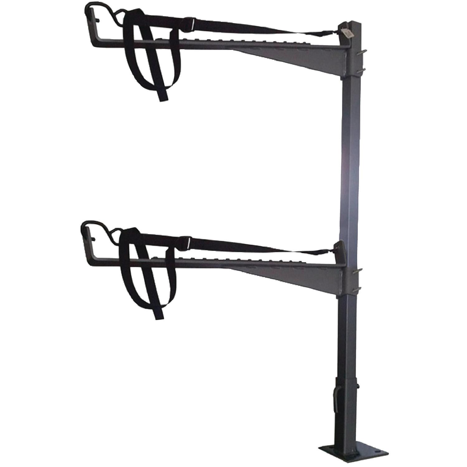 2′ spacing lower rack; Top rack open to accommodate any height; Robust powder coated metal square tubing combined with thick metal fabrications & MIG welded for strength; Universal mount is easy to assemble and take down; Removable bolt detaches assembly for quick storage; Powder coated popular grey Hammertone