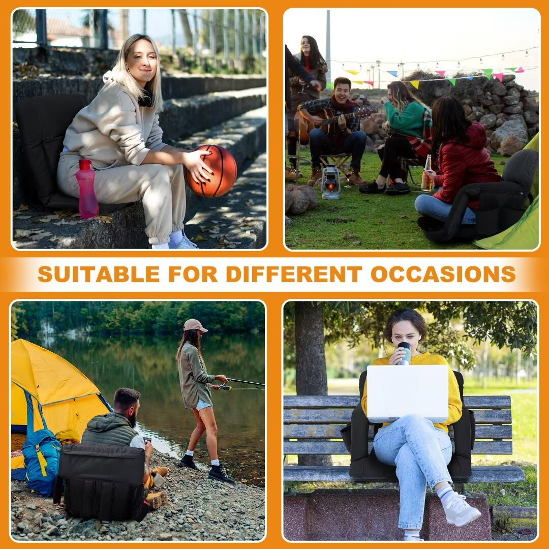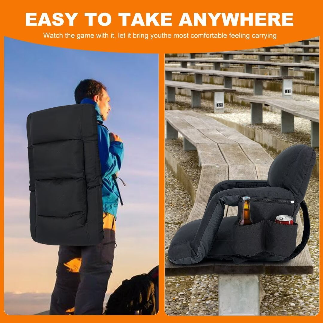 SUPERIOR CUSHIONED COMFORT: Built with a study steel frame, this portable stadium seats for bleachers with back support is made with high density covered cushion with inner soft foam, for comfort at any outdoor event such as a picnic, beach, stadium, park, patio, benches etc. CONVENIENT CHAIR POCKETS: Have your essentials and possessions always within reach. The side zipper pockets hold drink bottles and packets, the armrest’s front pockets keep your valuables (phone, keys, wallets), and the back pocket makes for extra storage. Bottom Strap & PORTABLE: Worried about falling down while you’re having fun and cheering at the stadiums with your kids family or friends? Stadium Seats For Bleachers comes with high quality bottom straps to prevent falling and sliding which provide more security! Just fold the stadium seat flat, adjust the length of the two shoulder straps, and carry it from game to garden with complete ease. 6 RECLINING POSITIONS: Sit like a king. This bleacher seats with backs and cushion can be easily reclined to 6 positions, adjustable width and boasts thick padded armrests so you can lay back and really enjoy the game. DURABLE, ANTI-SKID AND WATER-RESISTANT: Water-resistant reinforced PVC underside means there’s no issue even if the skies start to pour mid-game, and will always stay in place without slipping away. BUY WITH CONFINDENCE: If you experience any problems with stadium seats for bleachers, don’t hesitate to contact us immediately, we offer a 30-day money-back guarantee and 1 Year Manufacturer Warranty.