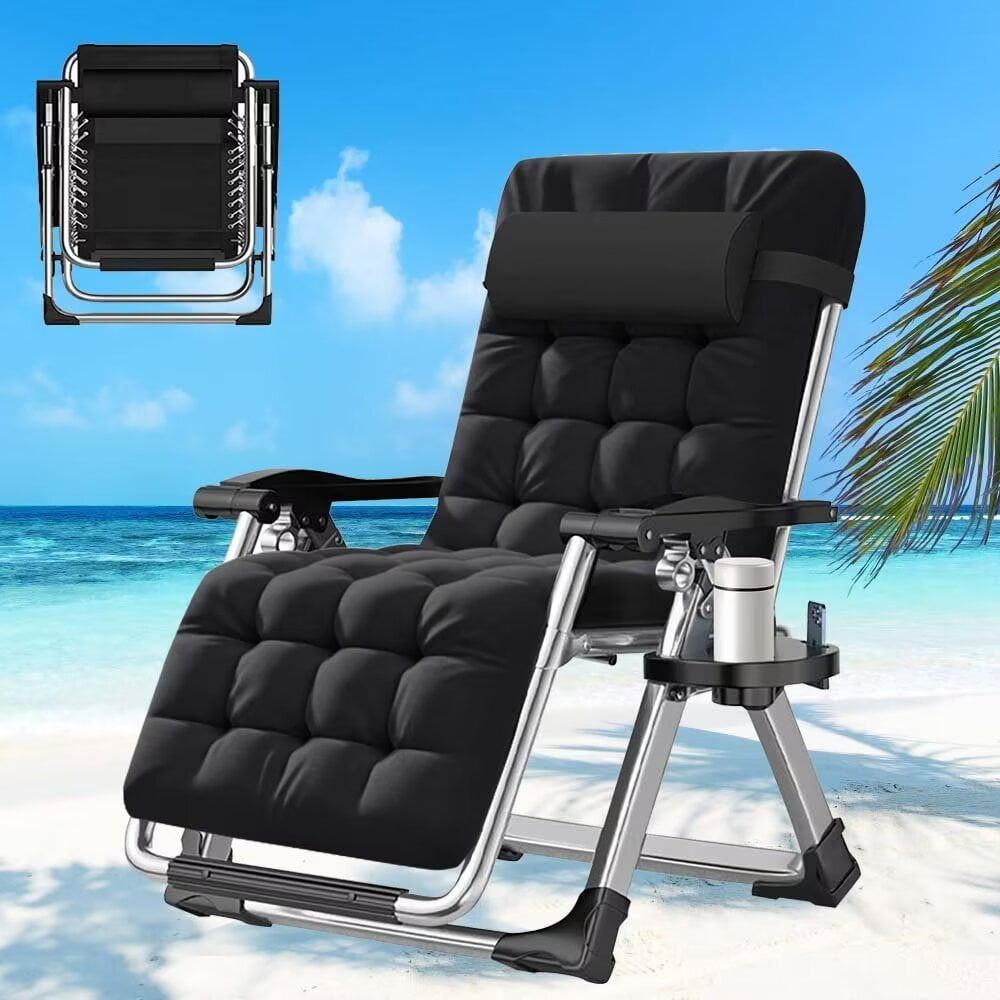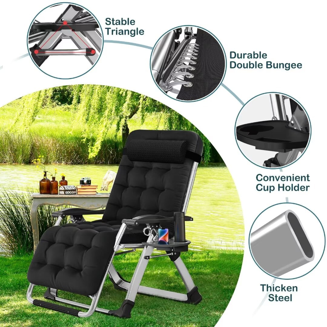 【Padded Zero Gravity Chair】:The outdoor chaise lounge chair is designed to satisfy your ultimate comfort. The armrest of folding lounge chair is thick and contoured. It will serve you whether sitting or lying, outdoor and indoor. Our recliner chair comes with a thick and soft pad,and the ergonomic design can relieve pressure on your spine, improve circulation, and reduce muscle tension. 【Long-Lasting and Durable】:The outdoor chaise lounge chair can take over 440 pounds of weight and it is extra durable and will last you a lifetime. This professional outdoor folding lounge chair is built with premium quality materials, which provide increased durability and resistance 【Adjustable and Zero-gravity】:Our zero-gravity lounge chair has an adjustable design that can be adjusted from 90 to 170-degree angle. This amazing feature helps you select the optimal angle that brings you to a comfortable, relaxing position. Simply push the clip to unlock the position, and pull the clip back to secure it at your desired position. 【Removable Soft Pad】:Intuitive design features that this outdoor zero gravity chair can be used by anybody. You can remove the soft cushion from the folding lounge chair to promote better airflow during hot summer days. Plus,the chaise lounge chair is very easy to install and can be easily folded, for easier storage and handling. 【Wide Application】:Whether relaxing by reading a book or geting a quick break, this comfortable folding lounge chair is the best choice. It can be used indoors, for outdoor activities, such as family gatherings, BBQs or beach day, or at the office. ( Tips: Any problems in the use of the process can be directly contact me, we provide quality products and fast customer service. ) About Specifications: Weight Capacity: 440 lbs. Item Size: 35.5”- 65”(L)× 26”(W) ×45”(H). Folding Size: 37.4”(L)× 26”(W) Application:such as a bedroom, balcony, garden and courtyard. It would provide you a better lounge time Material :Made with high quality textilene fabric About Features: –Steel tubes frame, durable and sturdy –Incline and adjustable back to fit your body –A removable headrest comes with to add comfort –With a removable cup and magazine holder –Lightweight and easy for transporting –With folding feature, easy to store and save space –Good choice for relax, relief, sleep, entertainment –Fits for beach, deck, yard, and room About Packing: 1*Zero Gravity Chair 1*4D Pillow 1*Cup Holder 1*Detachable Soft Cushion