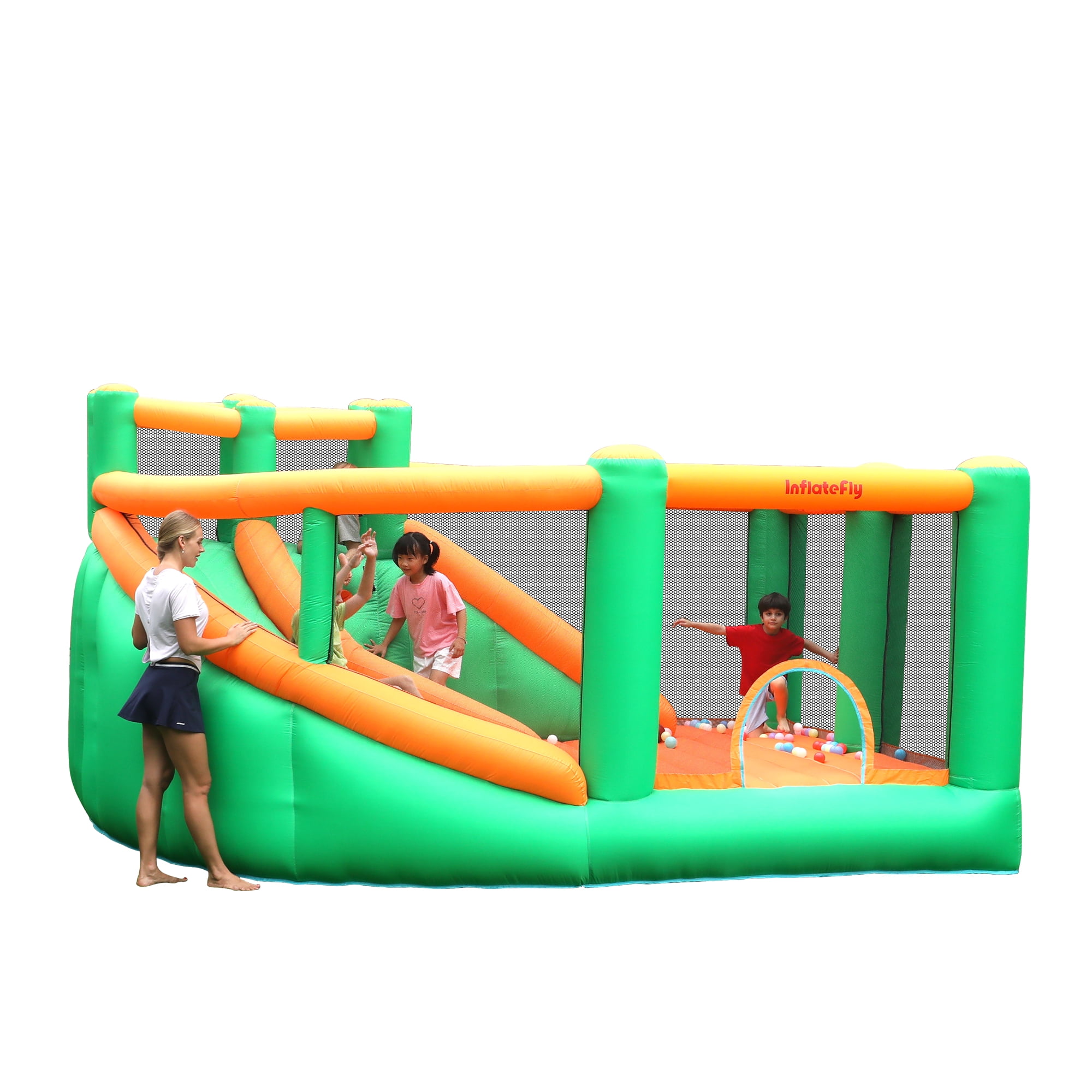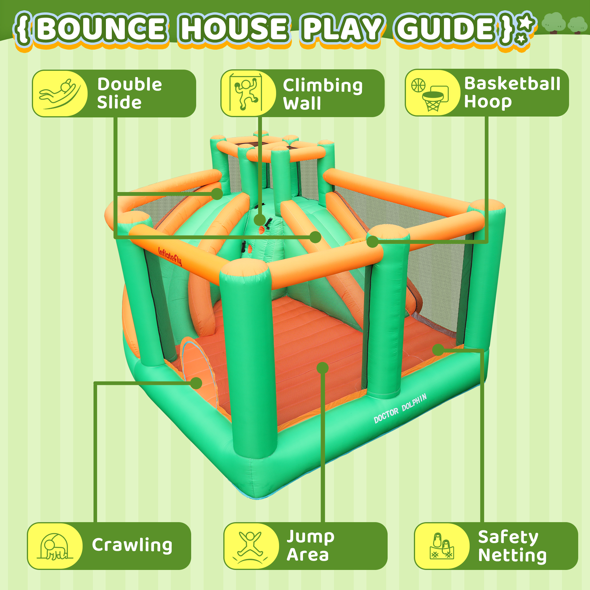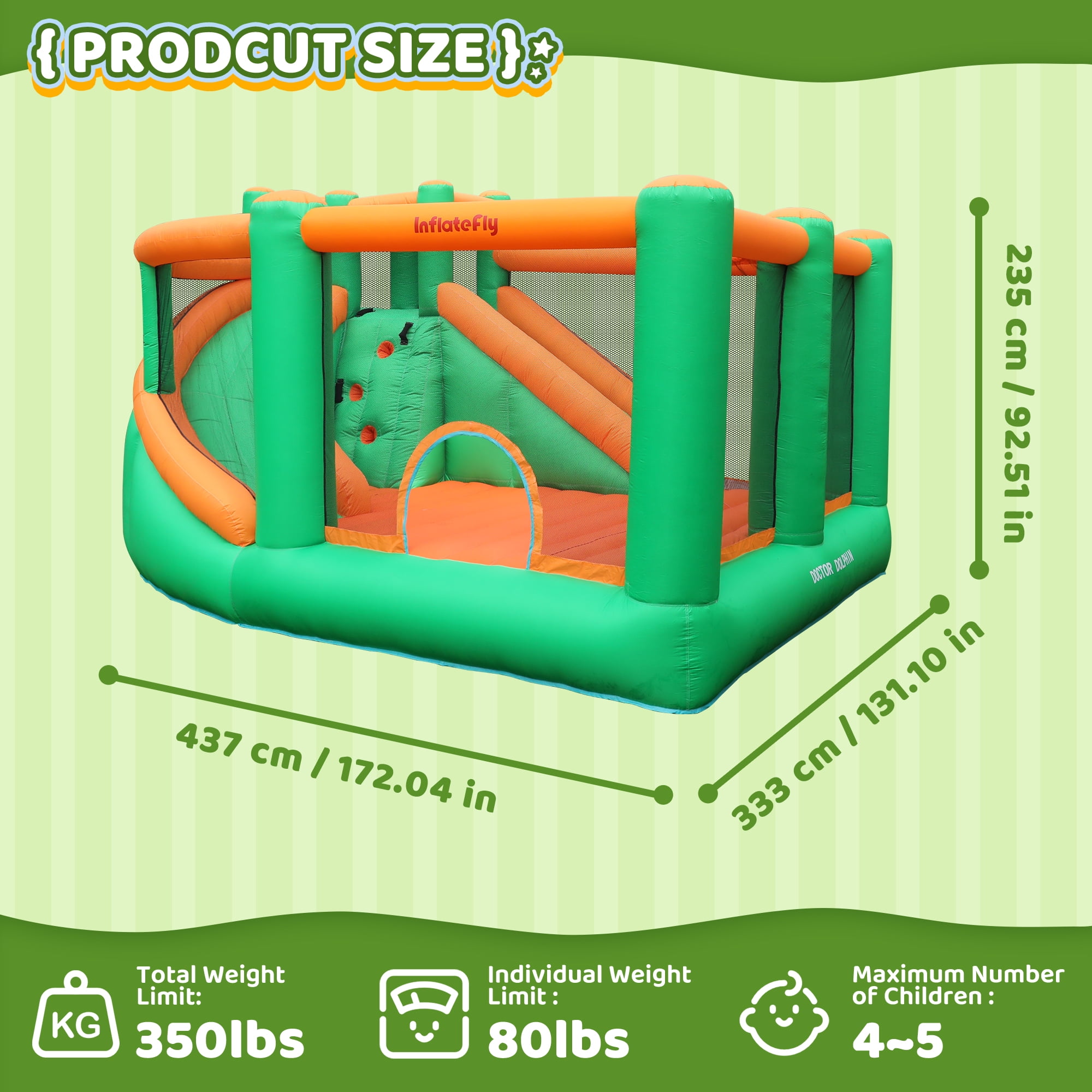 Features: 🐬Easy to inflate and deflate 🐬Suitable for backyard, garden, lawn, playground, weddings, birthday parties, etc 🐬The inflatable bounce house is suitable for both wet and dry 🐬A perfect gift for a child, especially in summer 🐬All materials pass lab-test to ensure safety and compliance with the Lead-Free Toys 🐬Double sewing for the seams and using tarpaulin material to make the jumping area more stronger and durable Specifications: ⭐️Brand: Doctor Dolphin ⭐️Material: Oxford Cloth ⭐️Color: Colorful ⭐️Theme: Castle Bounce House ⭐️Item Dimensions (LxWxH):172.04 x131.10 x 92.51inch ⭐️Weight limit: Max weight: 350 lbs, ⭐️Max number of kids: 4-6 Package includes: Bounce House Blower(450W Blower(110-120V,60HZ,Power cord length 2.15m) Basketballs Manual Pump Mounting Accessories Patches Toy Accessories Instructions Note: Product problem: If you receive the product quality or lack of accessories problems, please contact us, and we will do our best to solve the problem for you. Transportation problems: If the product is damaged due to transportation problems or the goods are not delivered late and other problems, please also contact us, we will solve the problem for you. Suggestions: We have been committed to researching products that can bring joy to children, if you have good suggestions for our products, you can also tell us.