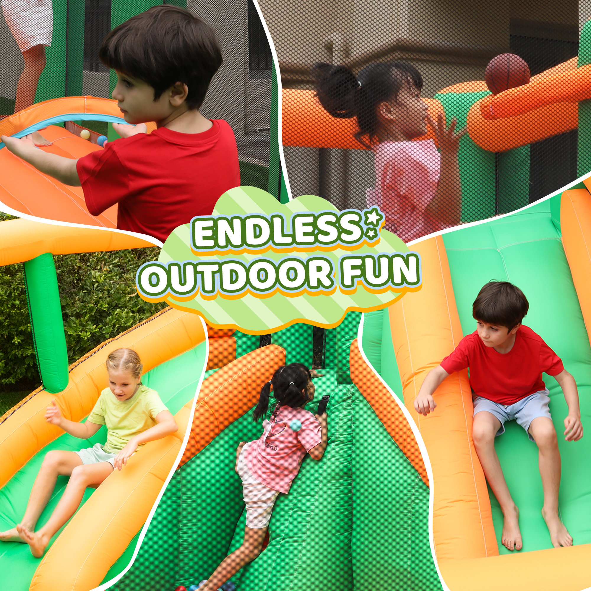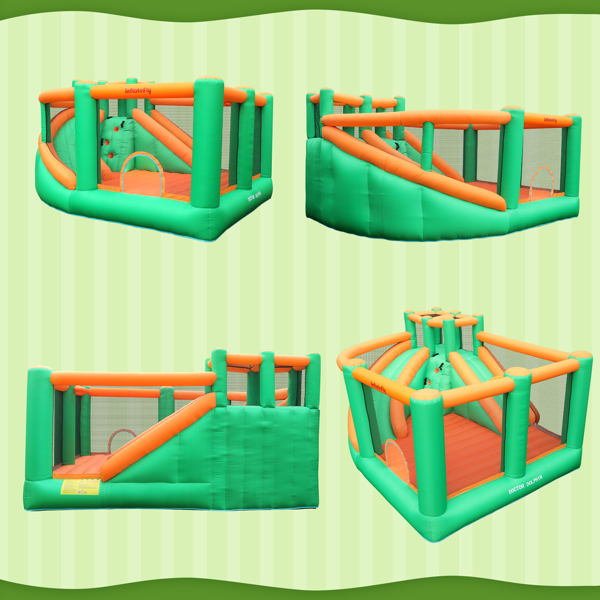 Doctor Dolphin’s inflatable bounce house has a spacious bounce area of almost five square meters and a double slide that can be used by children both outdoors and indoors! Our outdoor toys are perfect for encouraging outdoor play and exercise. Perfect for summer fun, pool parties, birthdays, and much more! Our fast inflatable children’s playroom has a large bouncing area for up to four (4-6) high jumpers with a maximum weight capacity of 350 lbs. There are also two double slides for your child to experience the fun of sliding. Our inflatable bounce house for kids with dual slides was designed with your child’s safety in mind. It is made of durable, non-toxic oxford fabric and the sides of the bouncer are surrounded by fall-proof netting, so parents can easily supervise and check on their children while they are with them.