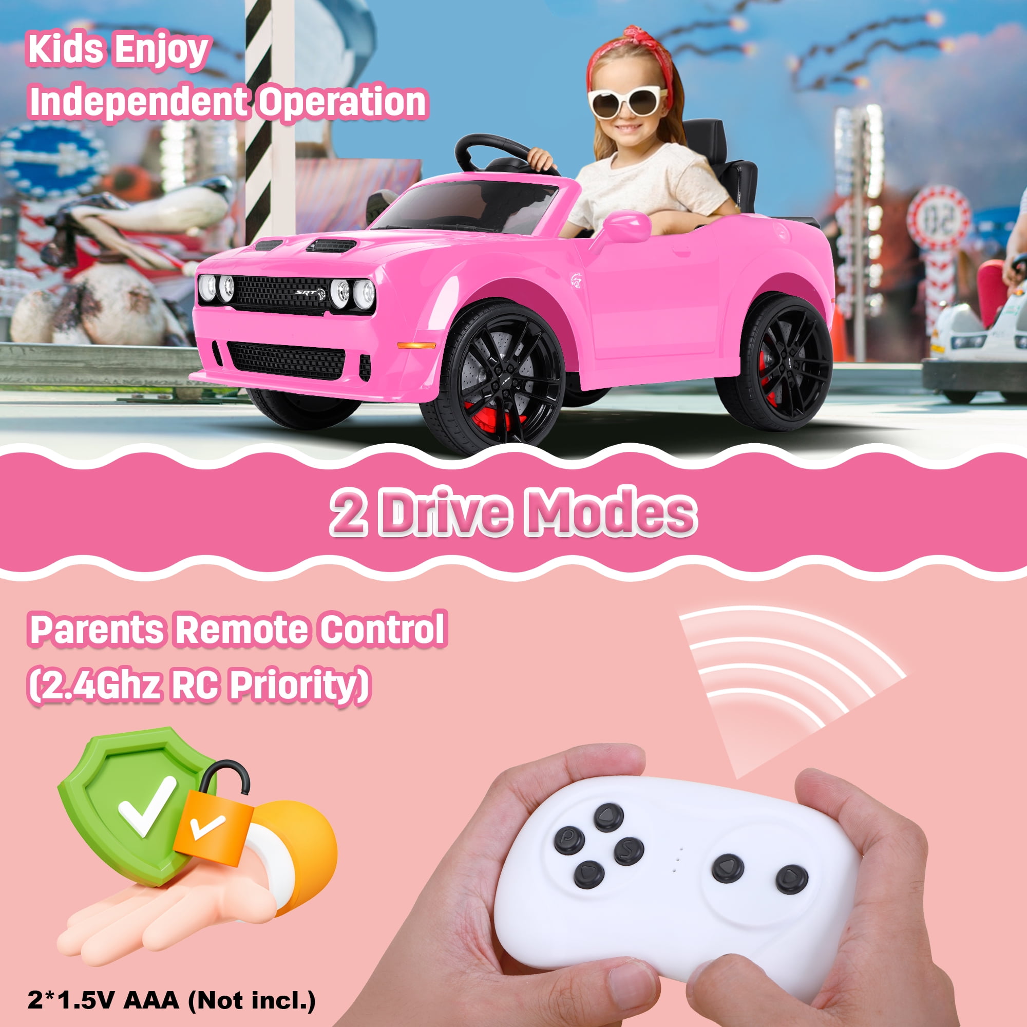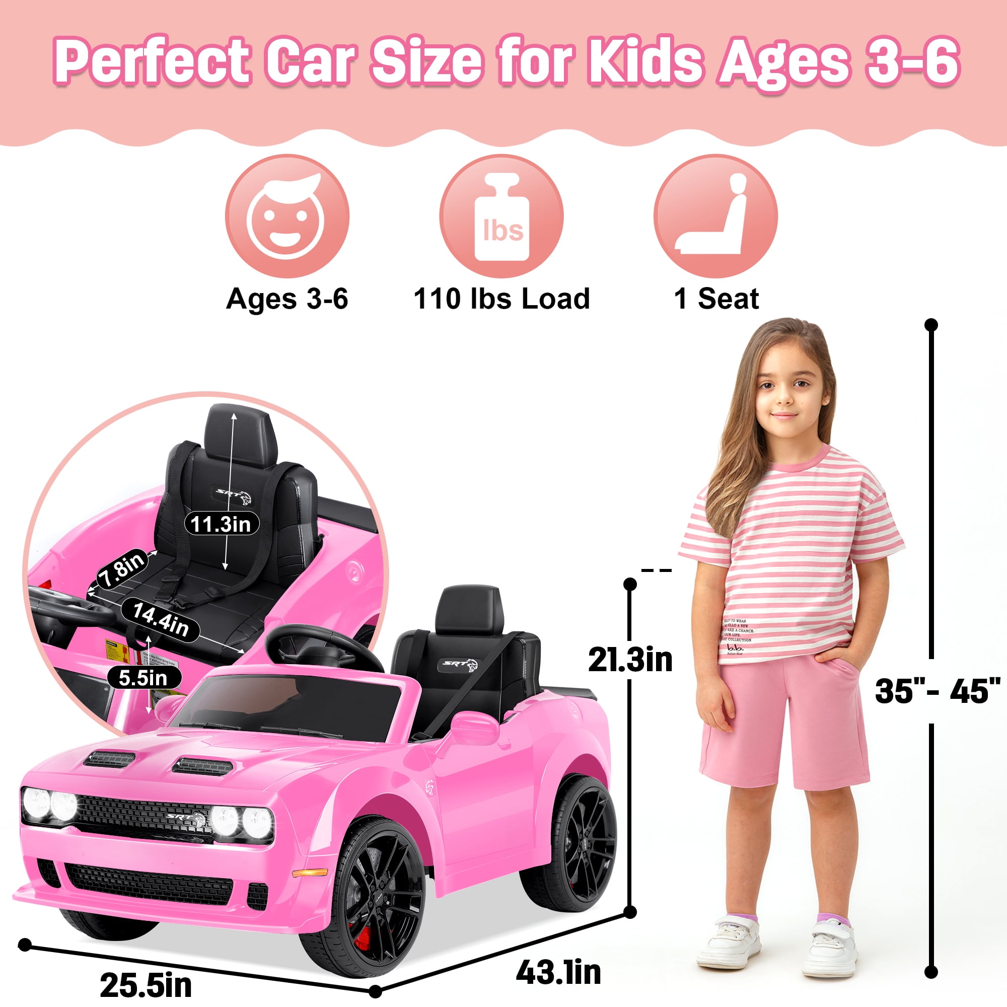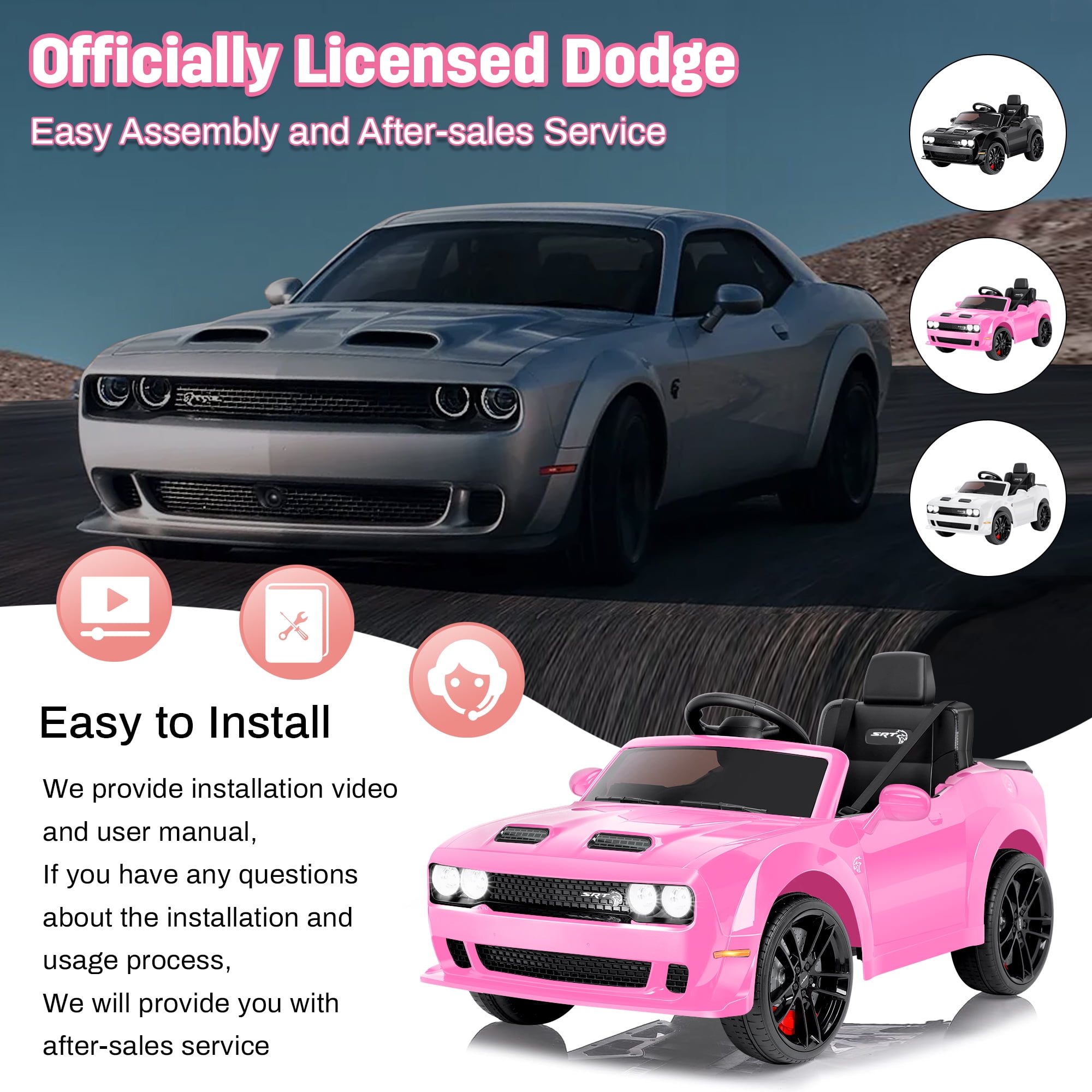 【Official DODGE Licensed】Manufactured with the official authorization of DODGE Charger. Looks like a real model. Your little driver can enjoy driving time with ease and comfort. This kids ride is a great surprise gift for kids ages 3-6. 【Two Driving Modes】There are two modes of parental remote control and manual control. Parents can control their children’s vehicles at any time through the 2.4GHz remote control, providing a safer driving experience and avoiding most risks. In manual mode, kids can steer the EV with their foot pedals and steering wheel for a truly rewarding driving experience. 【Multifunctional Entertainment】Our kids car is equipped with an MP3 control panel with power indicator light, you can also play your child’s favorite music via FM radio/Bluetooth. Bright LED lights and dynamic music add fun to their driving. This electric car is the perfect gift for kids on birthdays, parties, Christmas, New Years and more. 【Safety First】This kids ride-on car is made of child-friendly and safe material, which is harmless to your child’s health. In addition, with 4 wear-resistant wheels, it is suitable for various topography. 【Rechargeable Battery】Includes 12V rechargeable battery and two motors, can be fully charged within 8-12 hours, providing your child with hours of playtime adventures. Your kids will have endless fun. Installation Video If You Can’t Watch the Video,Please Contact us!!!▶▶▶Click Here for Watch the Installation Video Specification Color:Black/White/Pink/Blue Dimensions: 43.1in * 25.5 in * 21.3 in Volts: 12V Battery: 12V 4.5Ah Speed: Maximum 5 Km/h Weight Capacity: Maximum 110 lbs Recommended Age: 3-6 Years Number of Seats: 1 seat Charging Time: About 8-12 h Use Time: About 1-2 h Remote Control: 2.4Ghz, Need 2*1.5V AAA (Not incl.) Remote Control Range: 80-160in Steering Wheel: Need 2*1.5V AA (Not incl.) Note!!! 1. Children under the age of 6 should drive under the supervision of their parents 2. Due to manual measurement, please allow 1-3cm error 3. Due to display reasons, please allow errors in the actual color and picture 4. This rc car cannot be used for commuting How to maintain the battery? 1. When charging for the first time, make sure it has been fully charged for 8-12 hours to ensure performance and battery life. 2. Normal charging time should not exceed 18 hours to avoid damage. 3. When the power is low, please charge it in time to maintain the battery life. Please do not wait for the battery to run out before charging it. 4. If you don’t use it for a long time, it is recommended to unplug the power cord of the battery inside the body. And unplug the batteries (not included) from the remote control and steering wheel and store them separately. 5. It is recommended to charge the battery every 1 month or so to prevent excessive discharge.