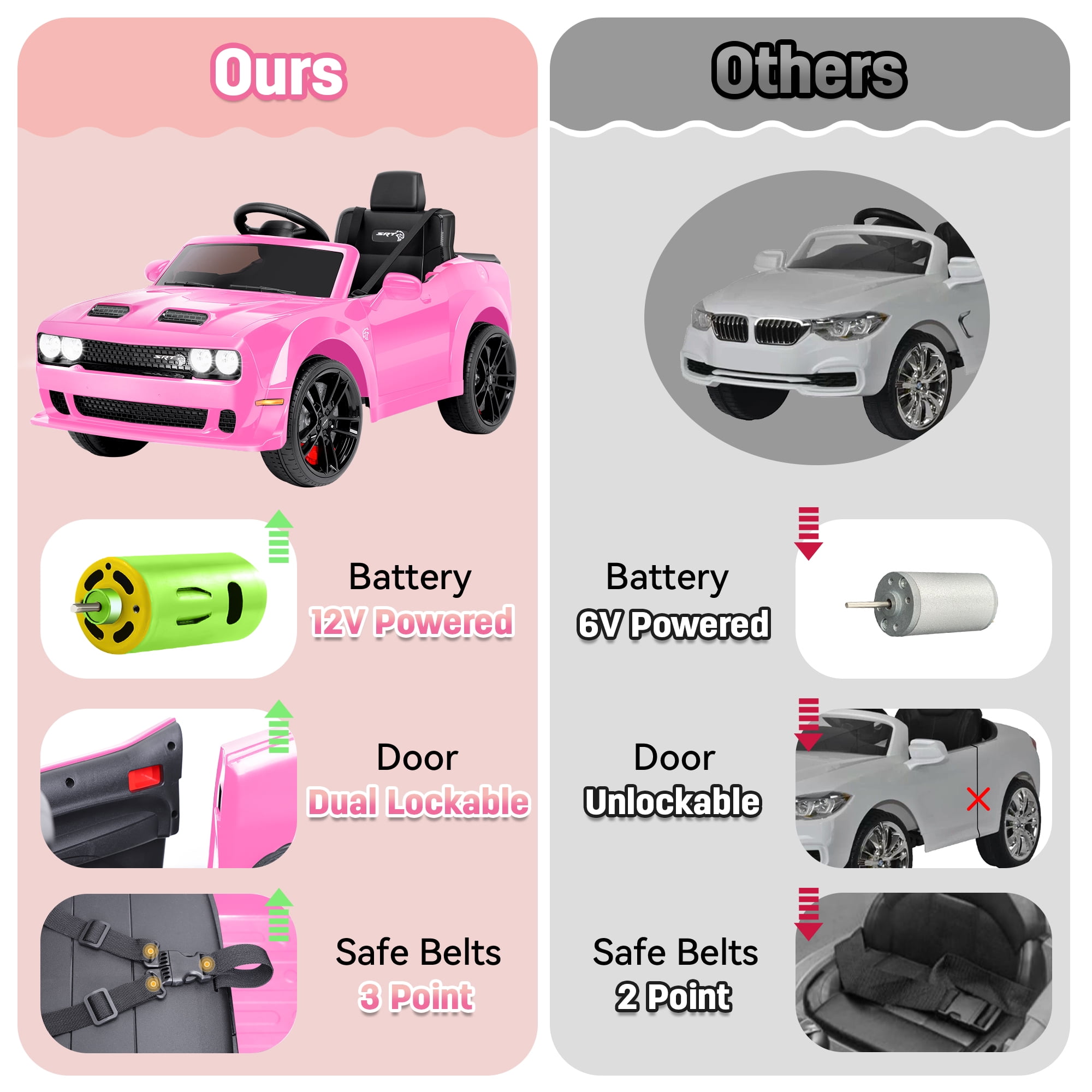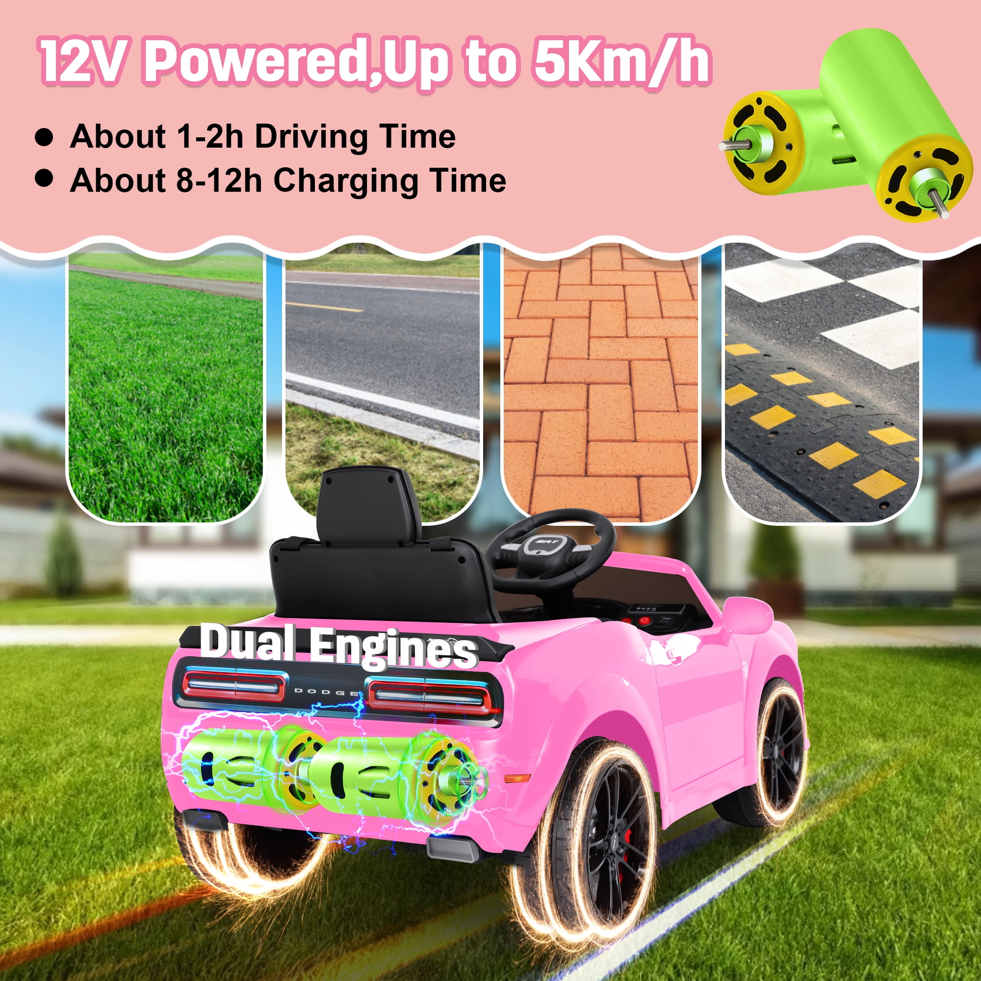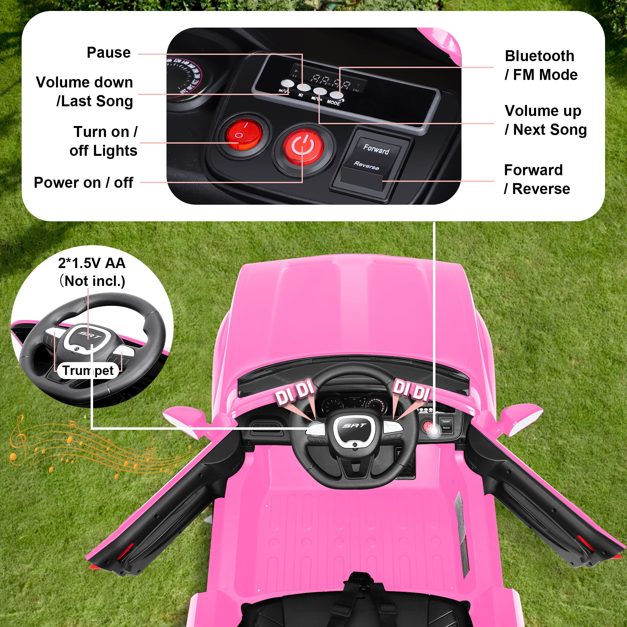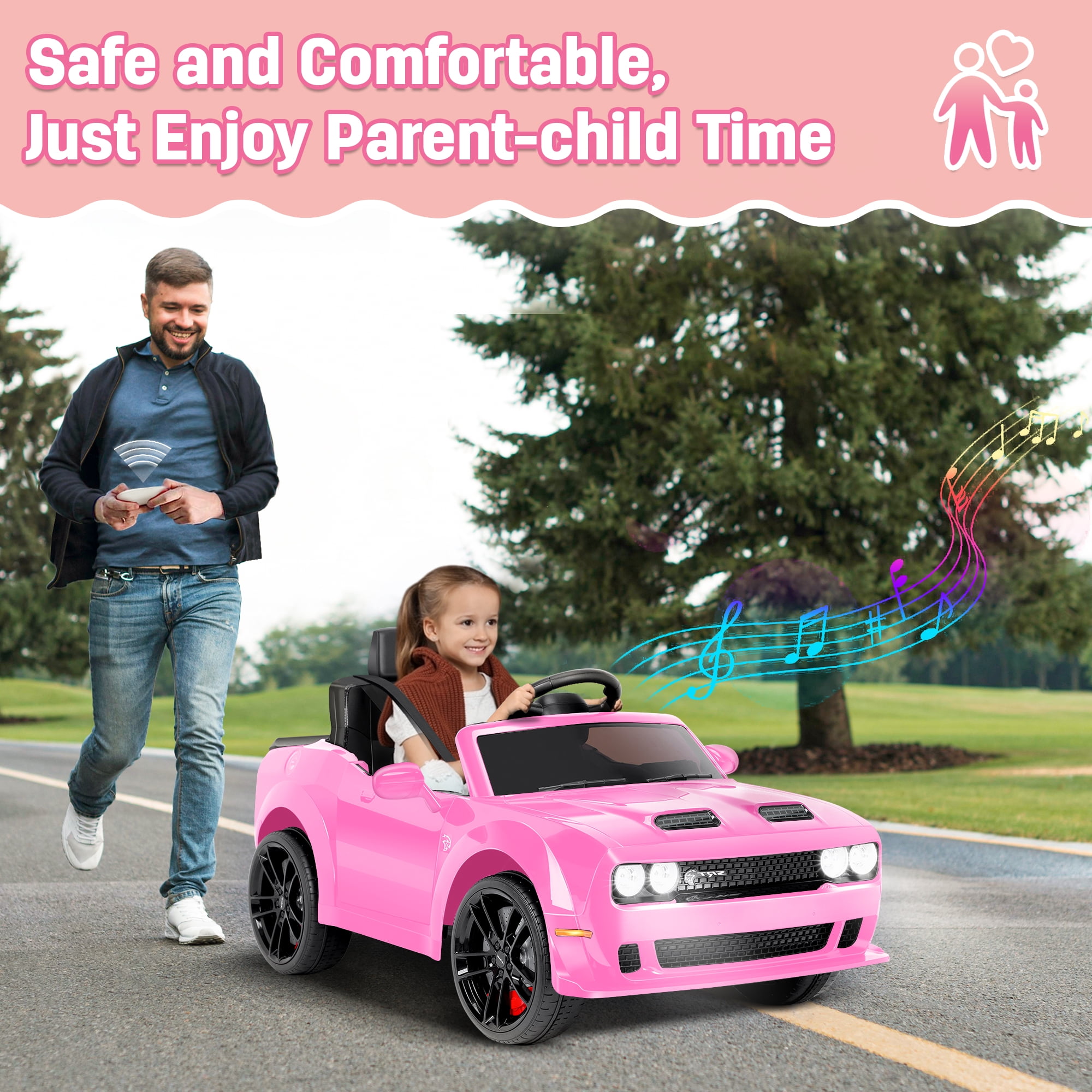 【Official DODGE Licensed】Manufactured with the official authorization of DODGE Charger. Looks like a real model. Your little driver can enjoy driving time with ease and comfort. This kids ride is a great surprise gift for kids ages 3-6. 【Two Driving Modes】There are two modes of parental remote control and manual control. Parents can control their children’s vehicles at any time through the 2.4GHz remote control, providing a safer driving experience and avoiding most risks. In manual mode, kids can steer the EV with their foot pedals and steering wheel for a truly rewarding driving experience. 【Multifunctional Entertainment】Our kids car is equipped with an MP3 control panel with power indicator light, you can also play your child’s favorite music via FM radio/Bluetooth. Bright LED lights and dynamic music add fun to their driving. This electric car is the perfect gift for kids on birthdays, parties, Christmas, New Years and more. 【Safety First】This kids ride-on car is made of child-friendly and safe material, which is harmless to your child’s health. In addition, with 4 wear-resistant wheels, it is suitable for various topography. 【Rechargeable Battery】Includes 12V rechargeable battery and two motors, can be fully charged within 8-12 hours, providing your child with hours of playtime adventures. Your kids will have endless fun. Installation Video If You Can’t Watch the Video,Please Contact us!!!▶▶▶Click Here for Watch the Installation Video Specification Color:Black/White/Pink/Blue Dimensions: 43.1in * 25.5 in * 21.3 in Volts: 12V Battery: 12V 4.5Ah Speed: Maximum 5 Km/h Weight Capacity: Maximum 110 lbs Recommended Age: 3-6 Years Number of Seats: 1 seat Charging Time: About 8-12 h Use Time: About 1-2 h Remote Control: 2.4Ghz, Need 2*1.5V AAA (Not incl.) Remote Control Range: 80-160in Steering Wheel: Need 2*1.5V AA (Not incl.) Note!!! 1. Children under the age of 6 should drive under the supervision of their parents 2. Due to manual measurement, please allow 1-3cm error 3. Due to display reasons, please allow errors in the actual color and picture 4. This rc car cannot be used for commuting How to maintain the battery? 1. When charging for the first time, make sure it has been fully charged for 8-12 hours to ensure performance and battery life. 2. Normal charging time should not exceed 18 hours to avoid damage. 3. When the power is low, please charge it in time to maintain the battery life. Please do not wait for the battery to run out before charging it. 4. If you don’t use it for a long time, it is recommended to unplug the power cord of the battery inside the body. And unplug the batteries (not included) from the remote control and steering wheel and store them separately. 5. It is recommended to charge the battery every 1 month or so to prevent excessive discharge.