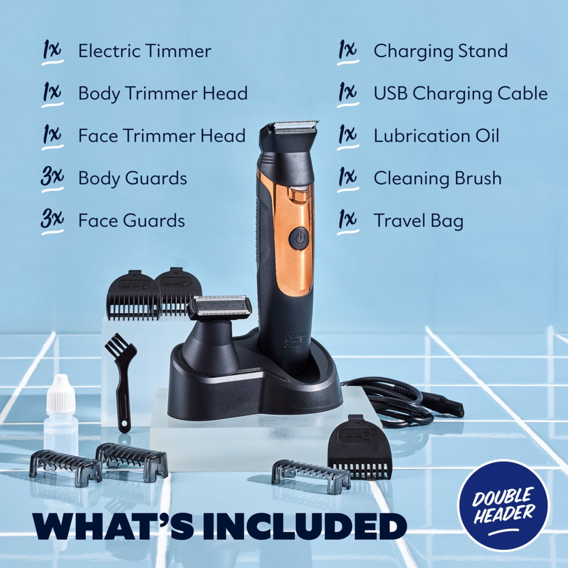 Dollar Shave Club Electric Razor and Beard Trimmer Double Header Electric Trimmer Includes 2 Interchangeable Heads 1 PC Two separate, interchangeable trimmer heads: beard trimmer head for your face and body trimmer head for your body designed with rounded blade tips for ease and comfort Body Trimmer Head: Stainless steel self-sharpening body blades to prevent hair tugs Beard Trimmer Head: Ceramic face blade for long-lasting sharpness Dollar Shave Club’s Double Header Electric Trimmer with Waterproof and Diamond Grip Handle: No slips while trimming in the shower Cordless Electric Razor 90-minute run time, 7,000 RMP Motor, LED Battery display with rechargeable lithium-ion battery, and LED Light to see what’s growing Everything you need for a men’s grooming kit:: Face Guards (2mm, 4mm, 6mm), Body Guards (2mm, 4mm, 6mm), charging stand, USB charging cable, premium travel bag, cleaning oil and brush