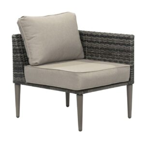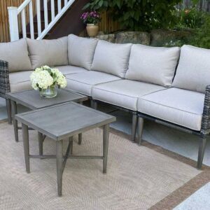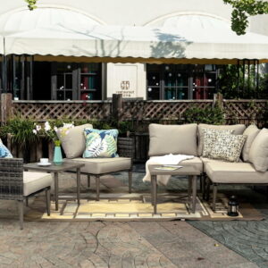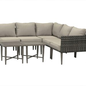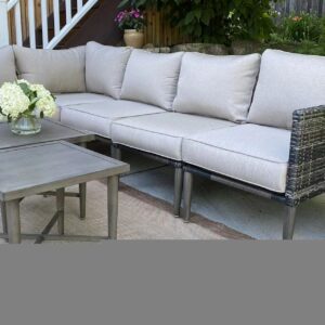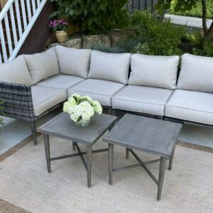 Add comfortable elegance to your outdoor area with this set, the Seven-Piece outdoor Woven Sectional Set features double-wall, all-weather, hand woven wicker. The olefin fabric is fade-resistant and comfortable to sit in the wood grain embossed metal tables feature a 20-inch square tables and can be moved around for versatile arrangements with the set, it is very easy to assemble and even easier to enjoy.