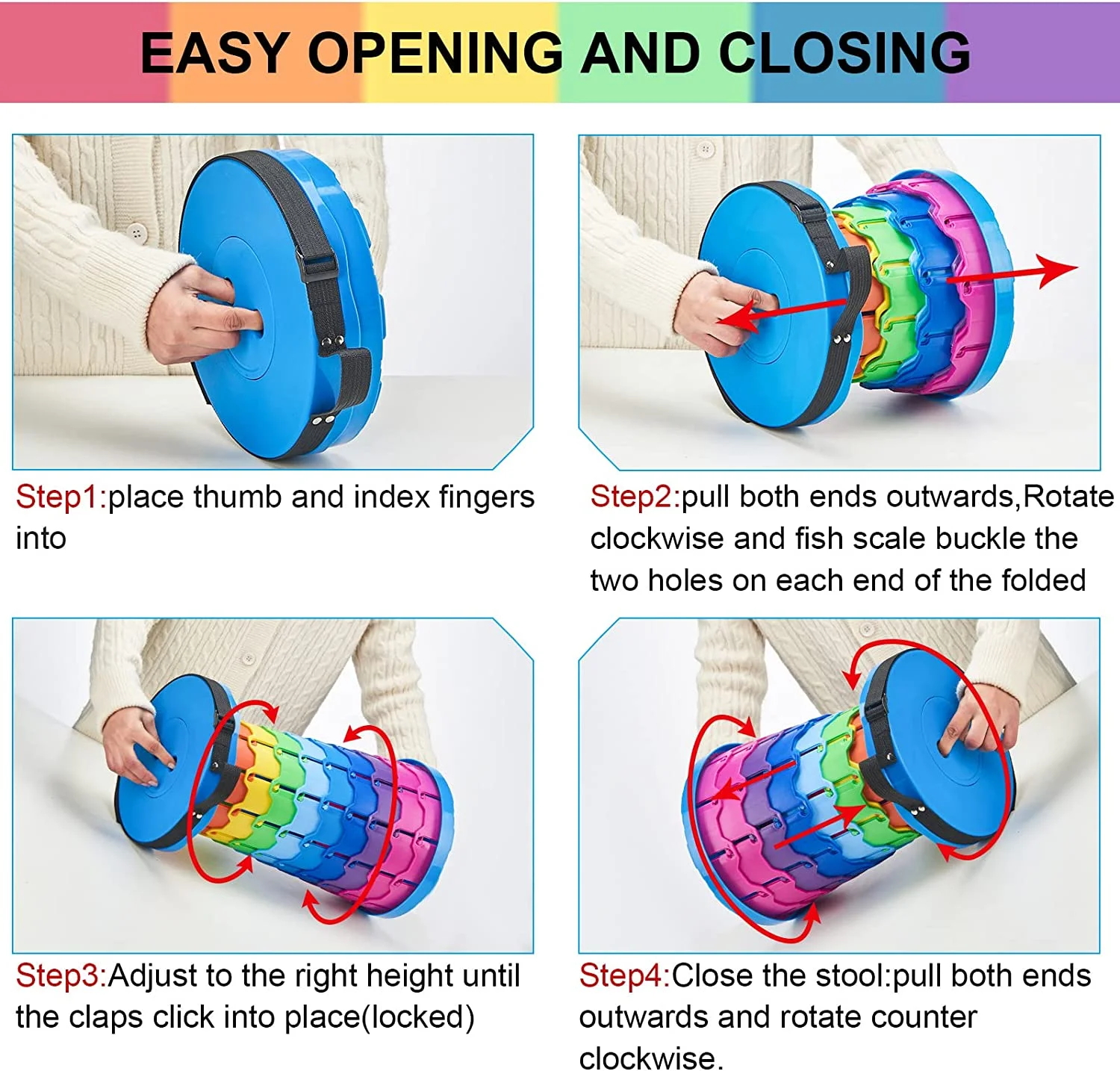 【Holds Up to 550LBS】This newly upgraded portable collapsible stool is made of high-density thickened PP material, which is hard, stable, scratch-resistant and wear-resistant. Upgraded fish scale structure and reinforced 10-layer buckle design, increase collapsible stool strength, rigidity and stability. The load capacity reaches 550 lbs, far exceeding other similar products. The bottom of the portable stool has a non-slip design, and the side support and anti-tilt ability have also been strengthened, making the stool more durable and safe. 【Easy To Open And Use】The interior of this portable collapsible stool is designed with stiffeners to hold it in place, making the stool stronger and easier to open and close. The top and bottom of the collapsible stool are designed with two holes, you just need to hold the two holes, stretch and turn them clockwise/counterclockwise, and you can easily open and close them. 【Lightweight And Portable】This portable collapsible stool is only 2 pounds, with a diameter of 9.84inch/25cm, and can be folded into 2.4inch, which is easy to carry and store. The adjustable shoulder strap makes it easy to carry or hang over the shoulder. You can fold the collapsible stool up and put it in your bag. No matter where you go, you can sit anytime, anywhere. 【Height Adjustable】The portable collapsible stool can be adjusted to your desired height, ranging from 2.4 inch to 17.5 inch. This adjustability makes it suitable for both adults and children. 【Wide Range Of Applications】This portable collapsible stool has a load capacity of up to 550lbs, and the product weighs only 2lbs. It is lightweight and portable, and it is very suitable for use in all aspects of life. When you go out, carry it on your back for hiking, fishing, traveling, camping, barbecue, outdoor concerts, or queuing, you can sit and rest anytime, anywhere, or use it as a small table. When you are at home, put it in the living room, bathroom, or office. When you hold a party at home or have a lot of guests at the birthday party, you can take it out to sit, and put it away when not in use without taking up space.